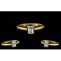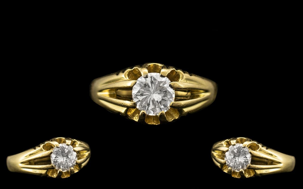 18ct Gold - Gents Excellent Quality Single Stone Diamond Ring - Gypsy Setting. Hallmark Birmingham 1983. The Round Brilliant Cut Diamond of Excellent Colour. Est Colour G - H, Est Clarity SI, Slight Feather / Inclusion. Ring Size - T. All Aspects of Condition Are Excellent, Including Shank and Setting - Please Confirm with Photo. Diamond Approx 6.9 x 6.9 x 4.4, 1ct - 30 pts.