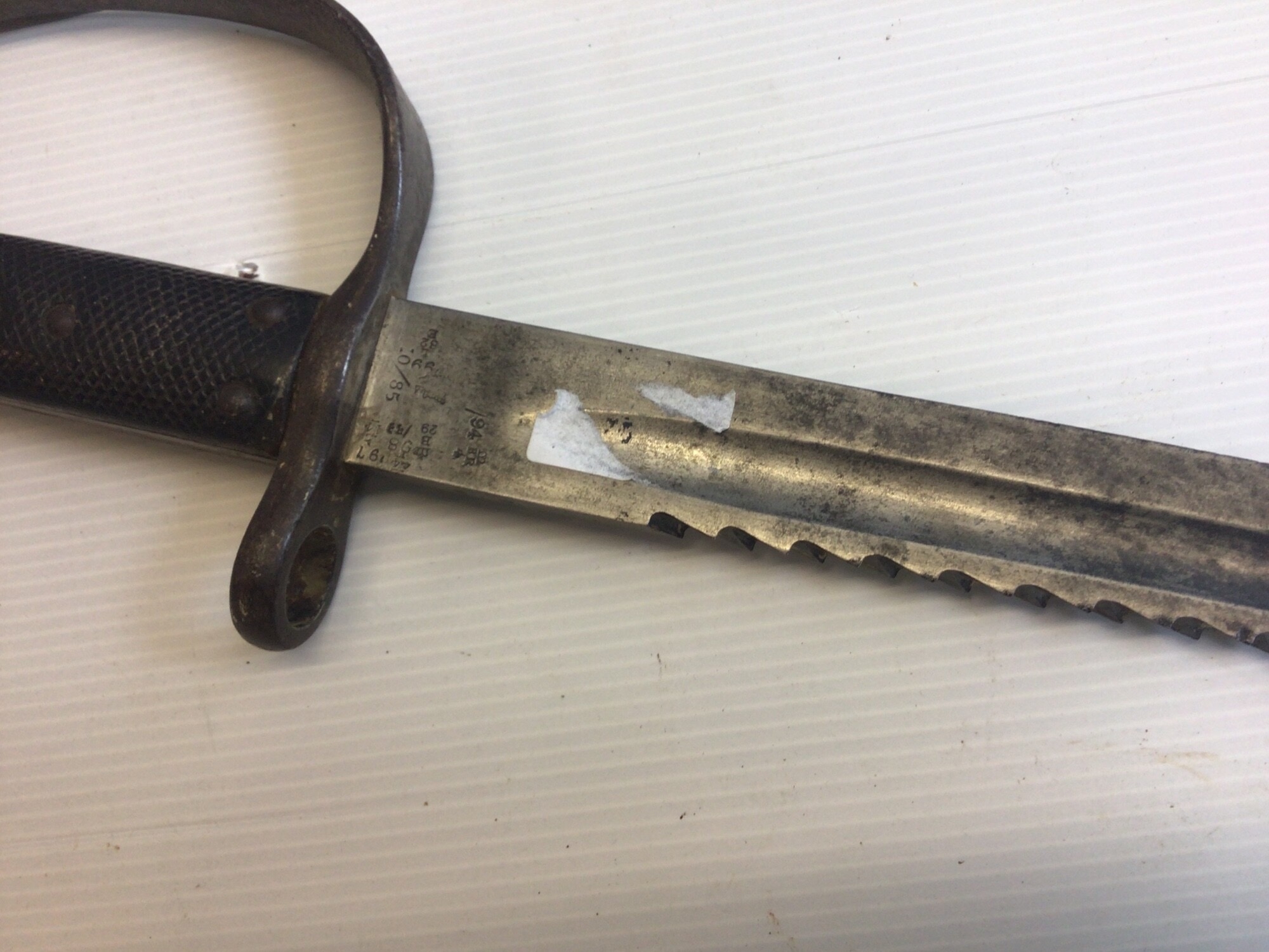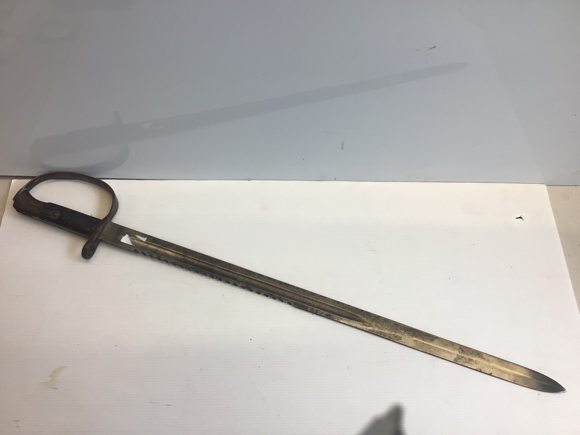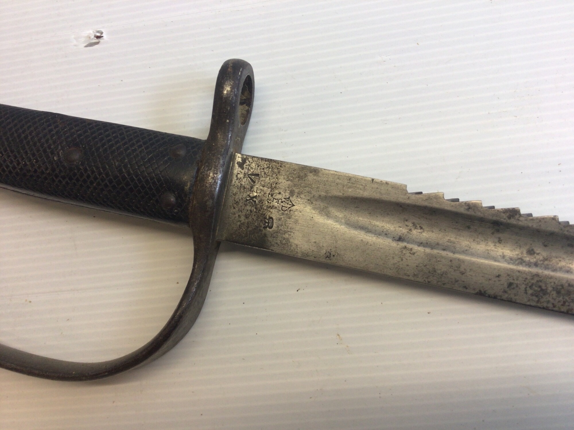 A Martini Henry 1879 Sawback edge bayonet the blade with military stamp marks no scabbard.