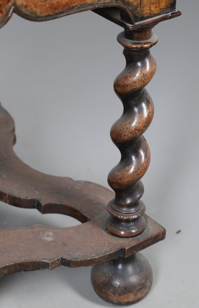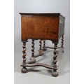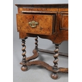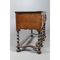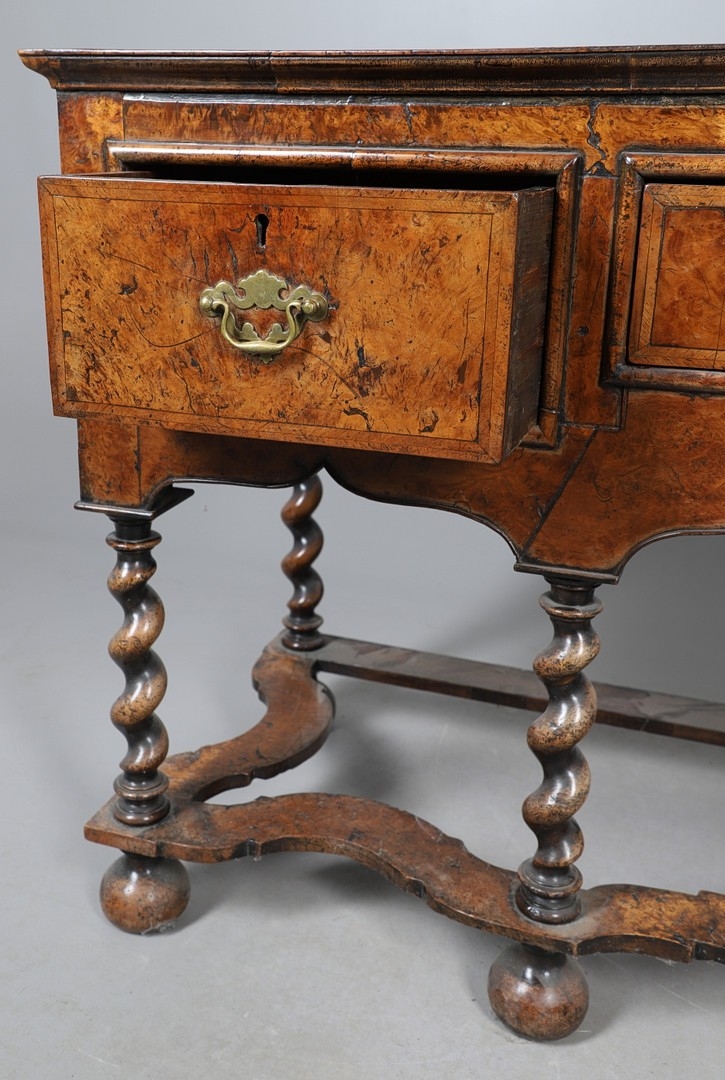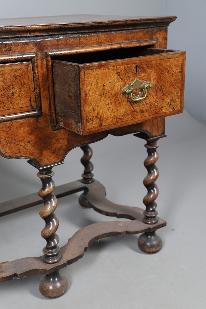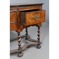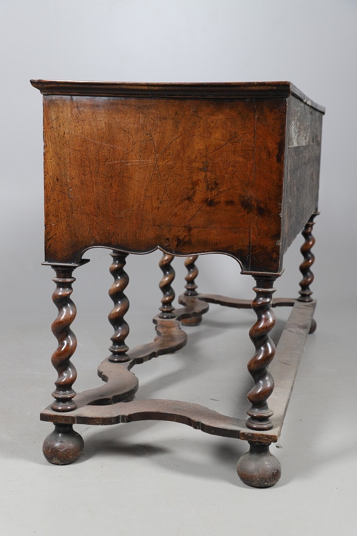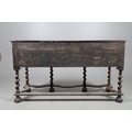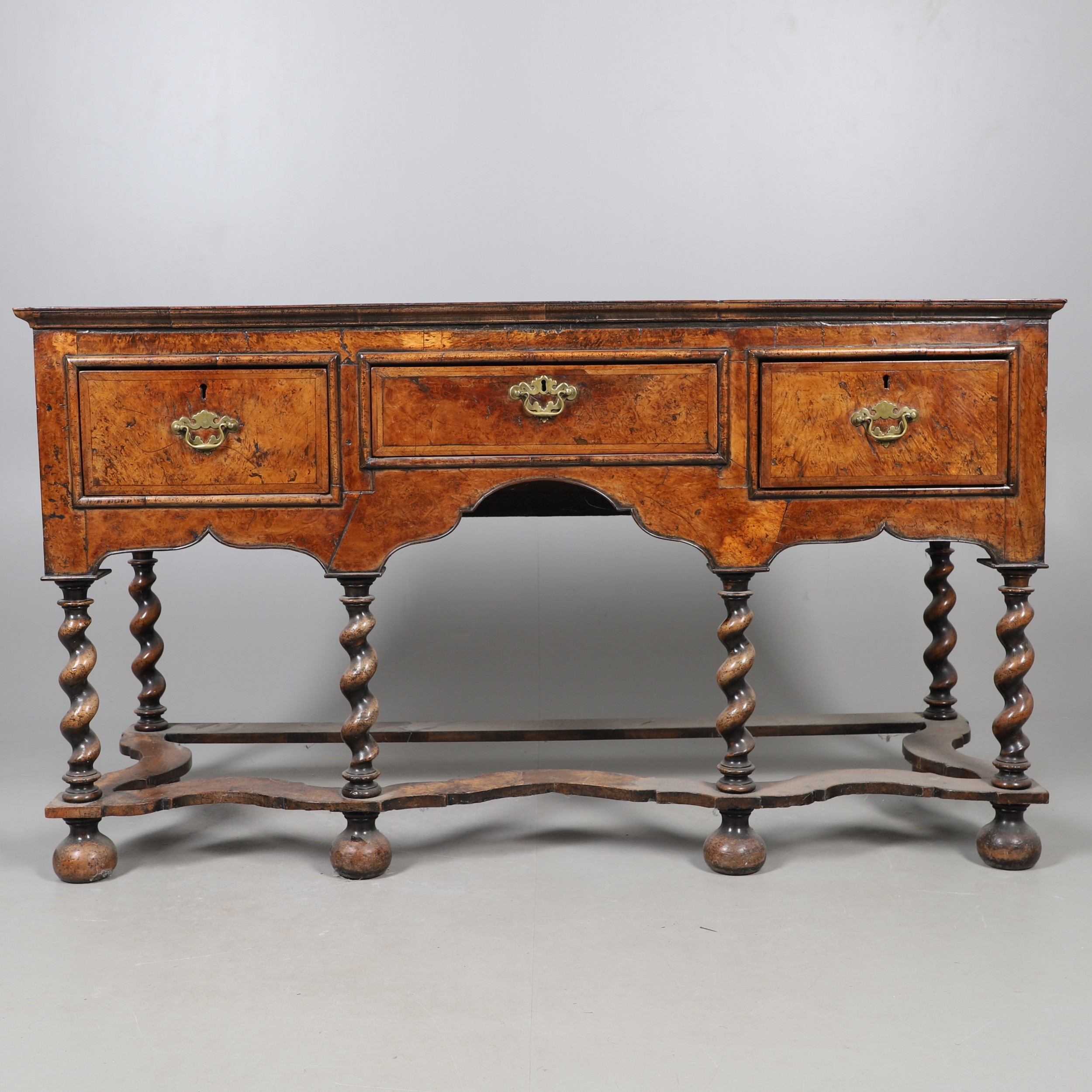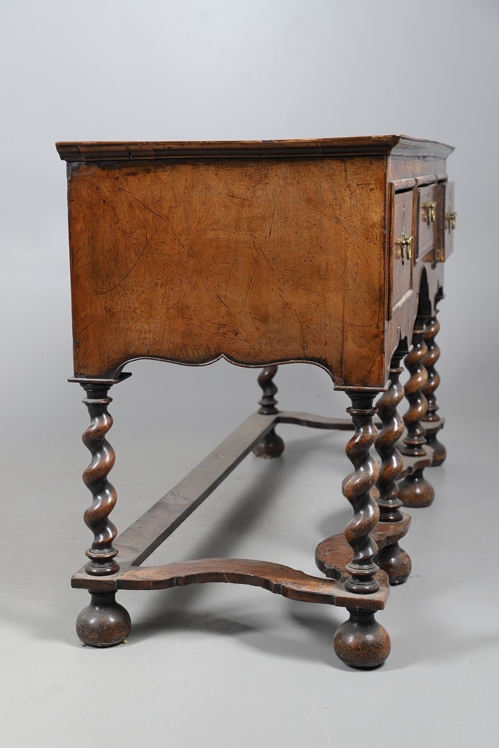 AN 18TH CENTURY STYLE WALNUT DRESSER BASE. constructed from old timbers, the feather banded top with moulded edge over three drawers and ogee arch shaped apron, spiral supports united by a wavy stretcher and bun feet, height 83cm, width 147cm, depth 53cm.