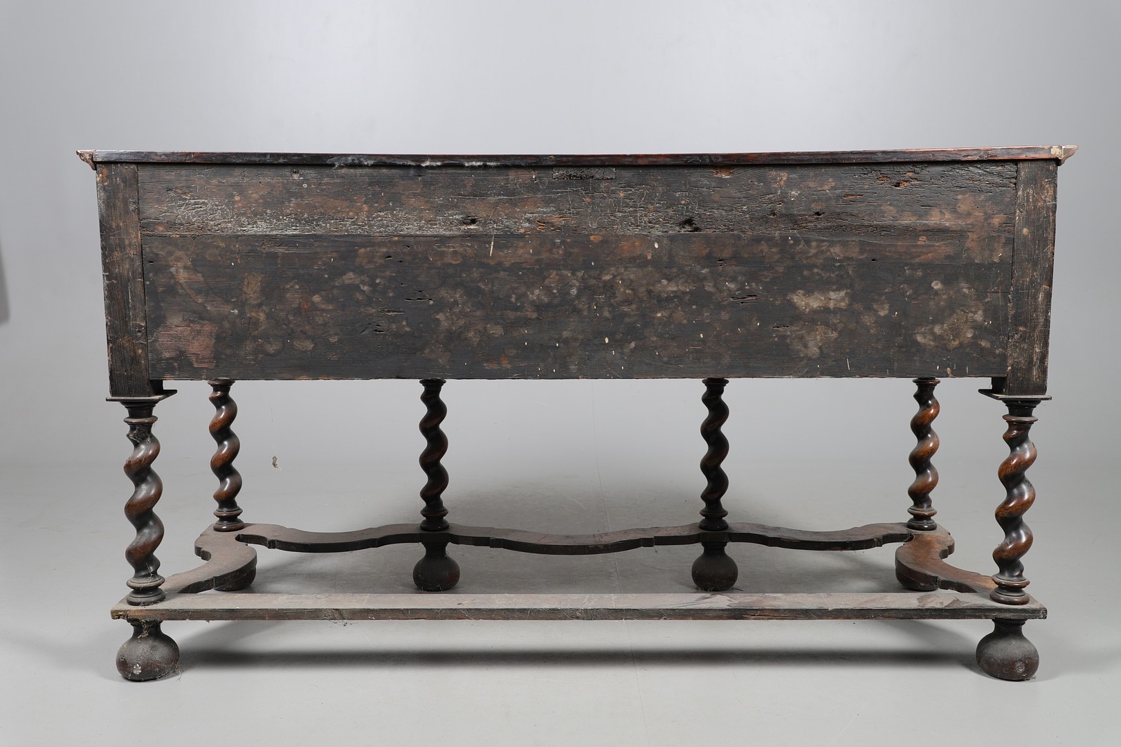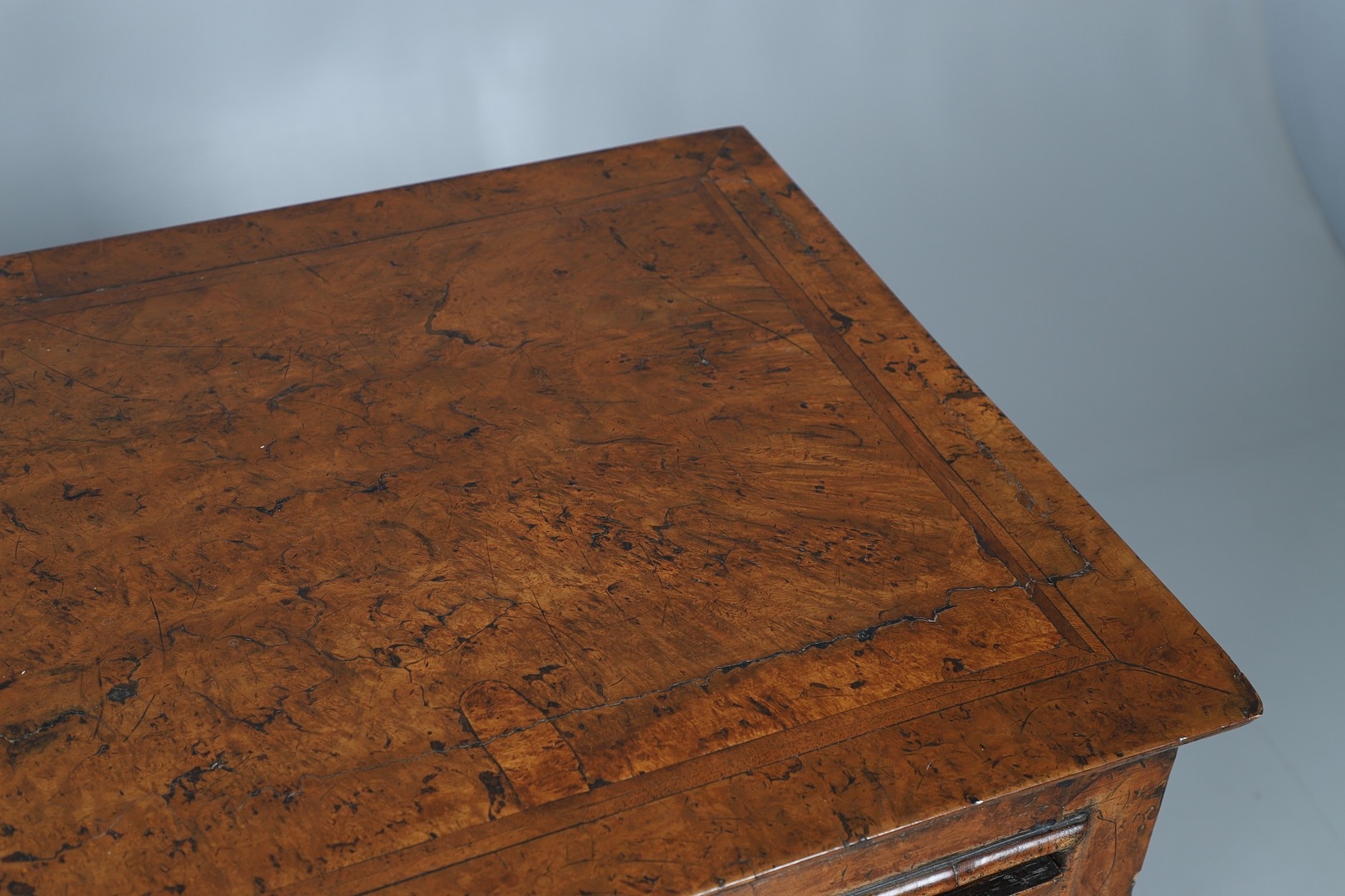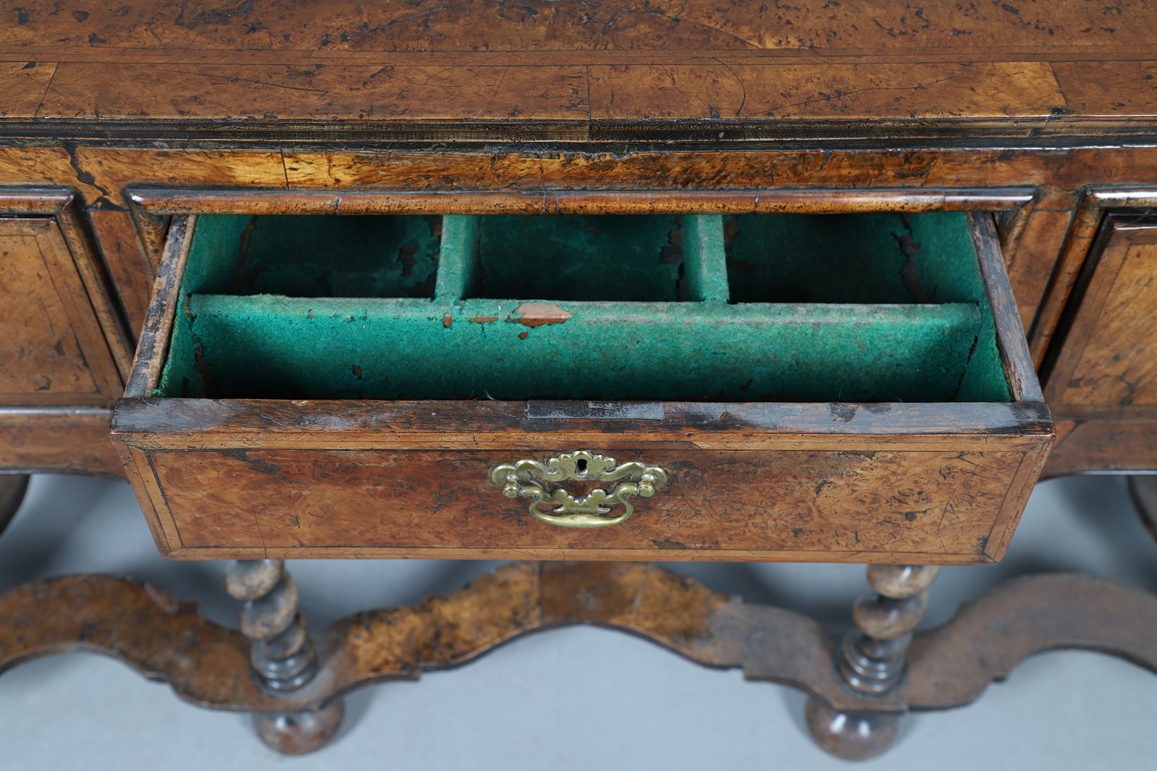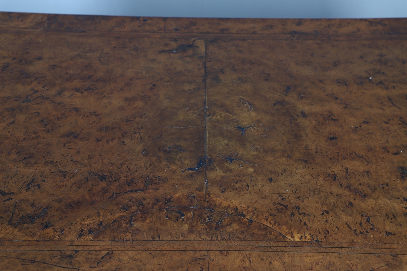 Shrinkage splits to top, repair to top, old marks, later baize lining to central drawer (moth eaten), old worm damage to back.