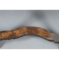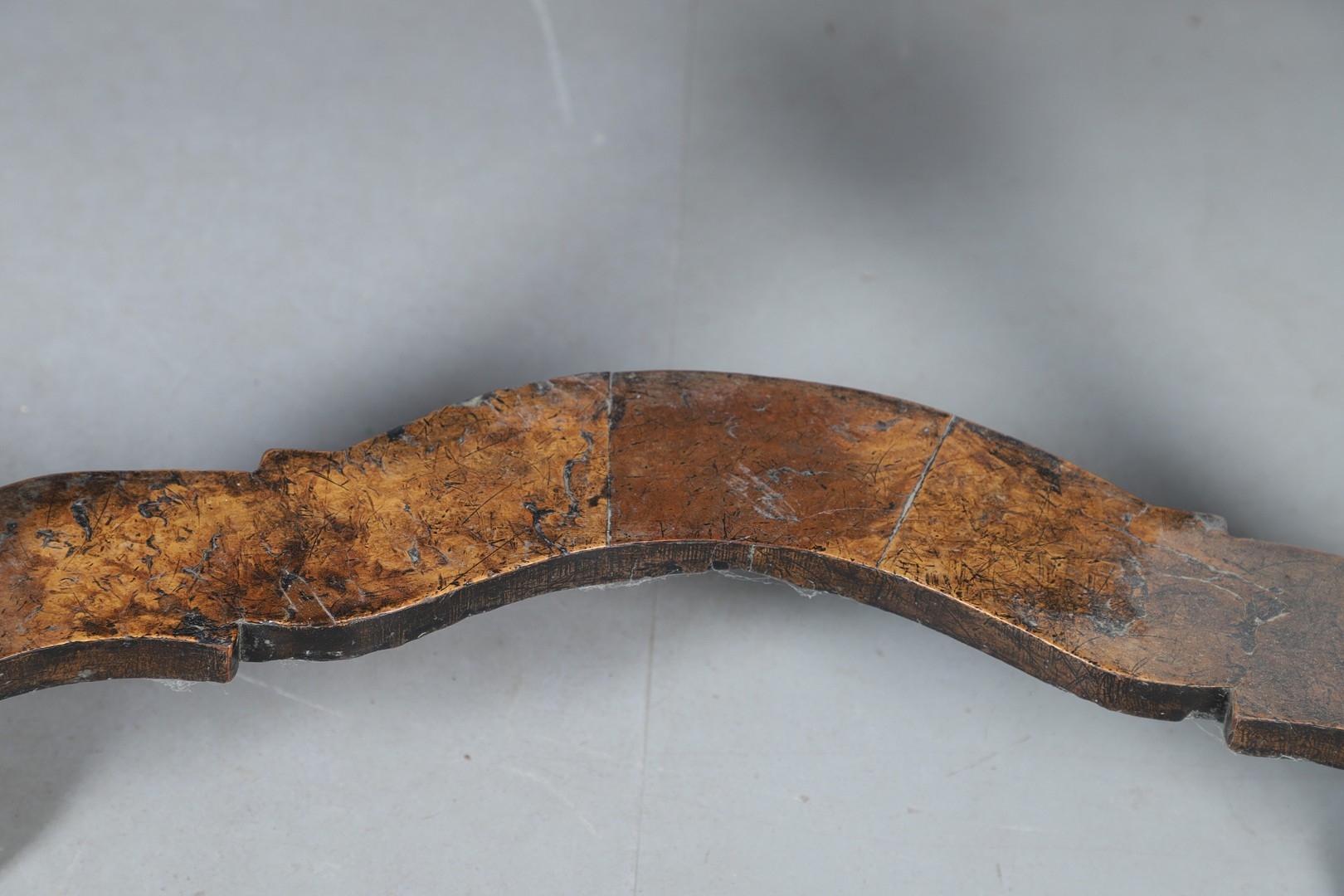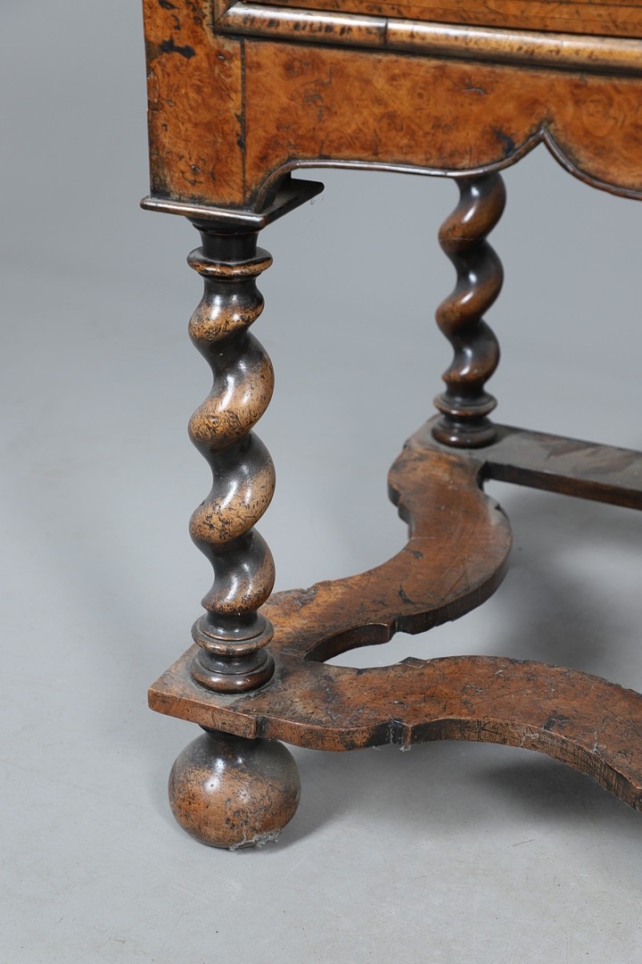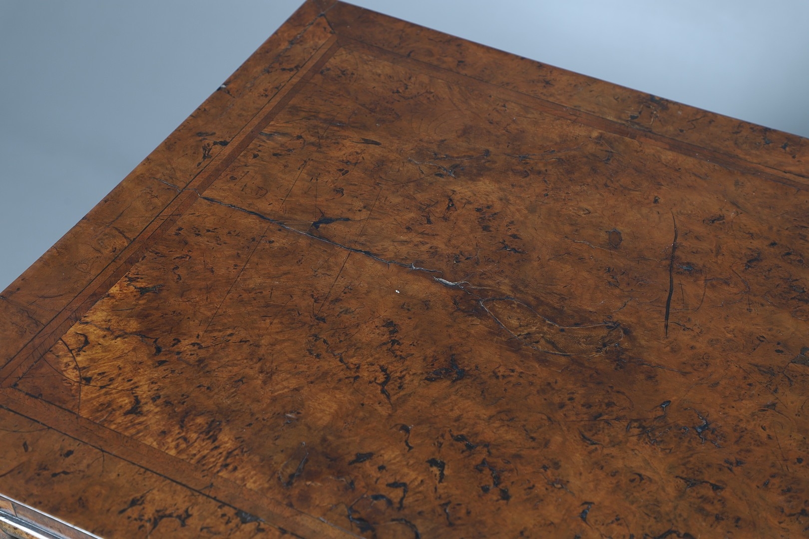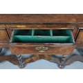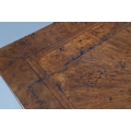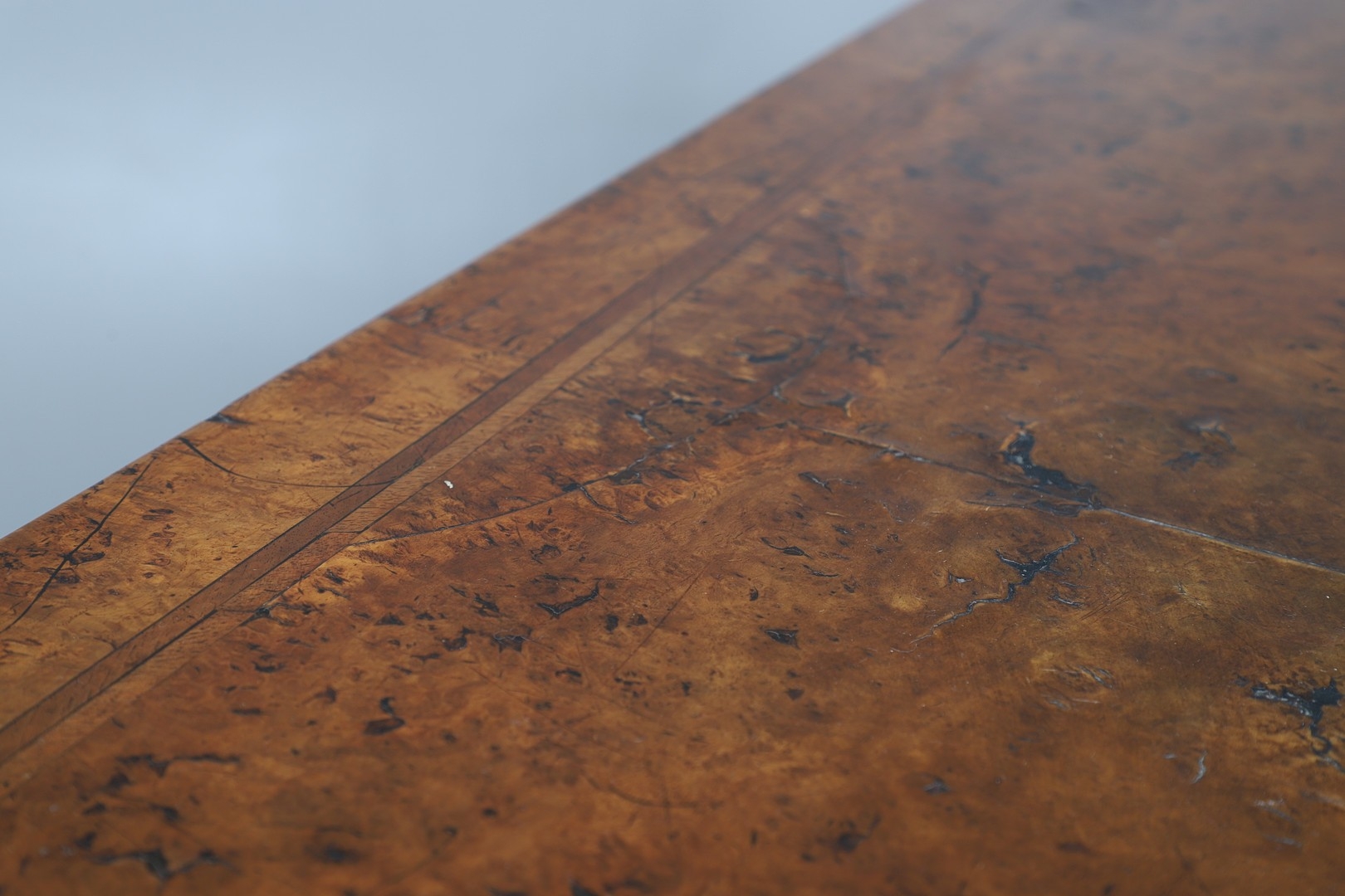 Shrinkage splits to top, repair to top, old marks, later baize lining to central drawer (moth eaten), old worm damage to back.