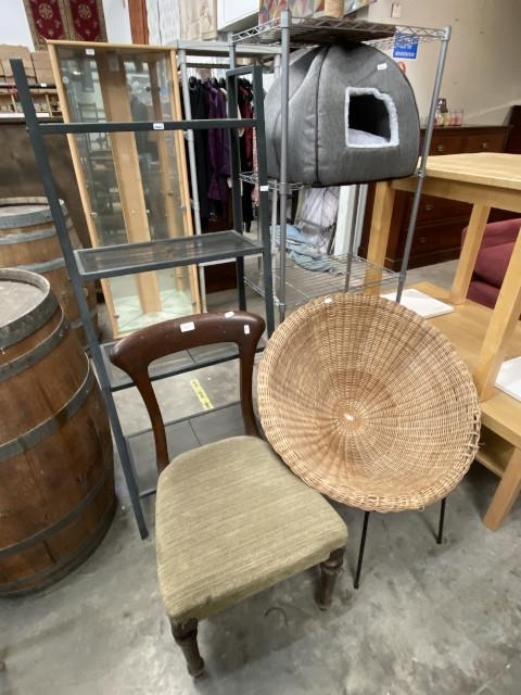 Vintage rattan egg chair 79W (as found), 2 metal workshop shelving stands 158H 57W 35D & 149H 60W 35D etc