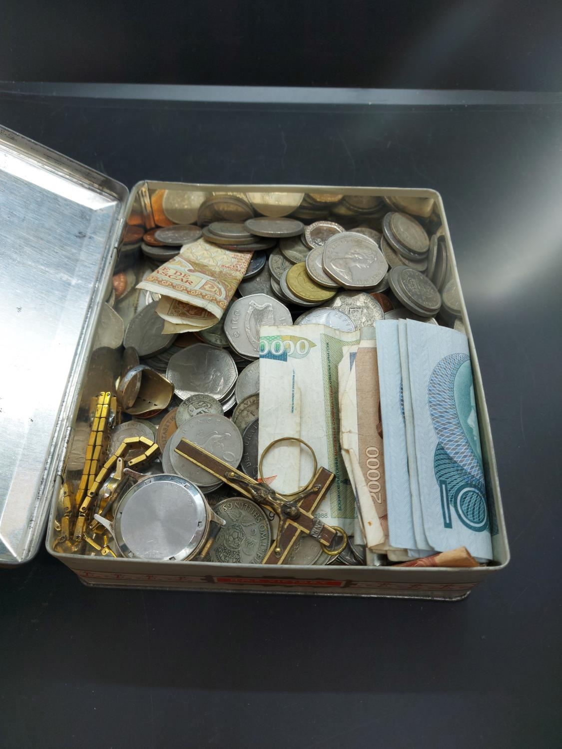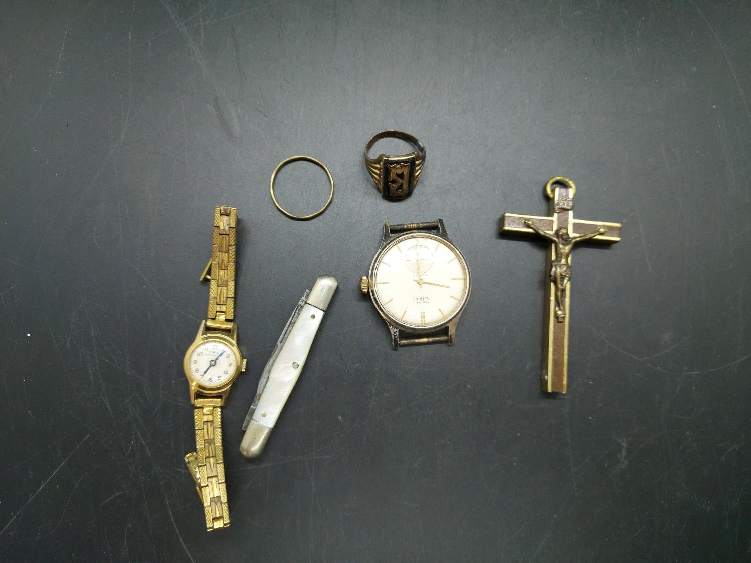 A collection of mixed items to include worldwide coins, approx. 45 British 92.5% and 50% silver Georgian and Victorian coins (combined weight approx. 258 grams), Oris gold plated ladies watch, Smiths Astral 15 jewel wrist watch, stamped 9k gents ring, worldwide bank notes etc.