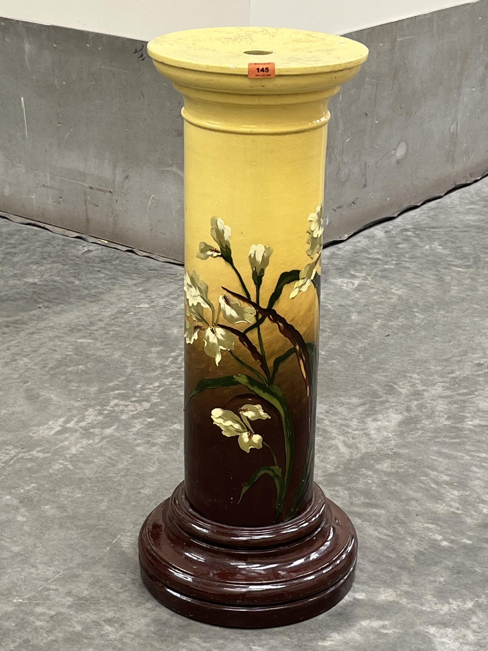 A Victorian Burmantofts Faience jardiniere pedestal, painted with iris flowers on a yellow and brown ground. Impressed marks and a number 1180. 36' high