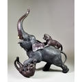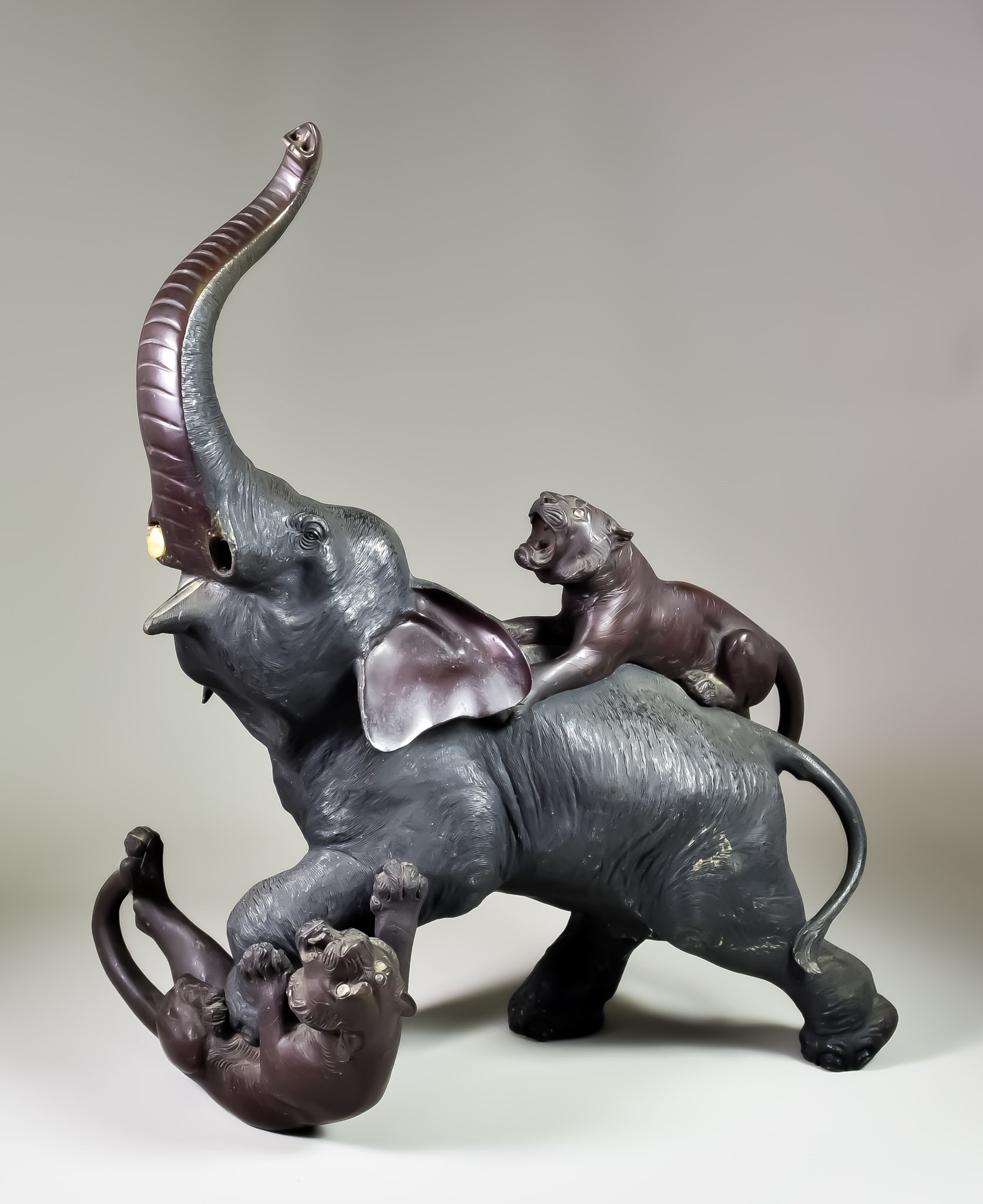 A Japanese Two Tone Bronze Group of an Elephant Attacked by Two Tigers, Meiji Period, the tigers inset with glass eyes, 15.5ins (39.4cm) long x 18.5ins (47cm) high, signed on underside