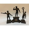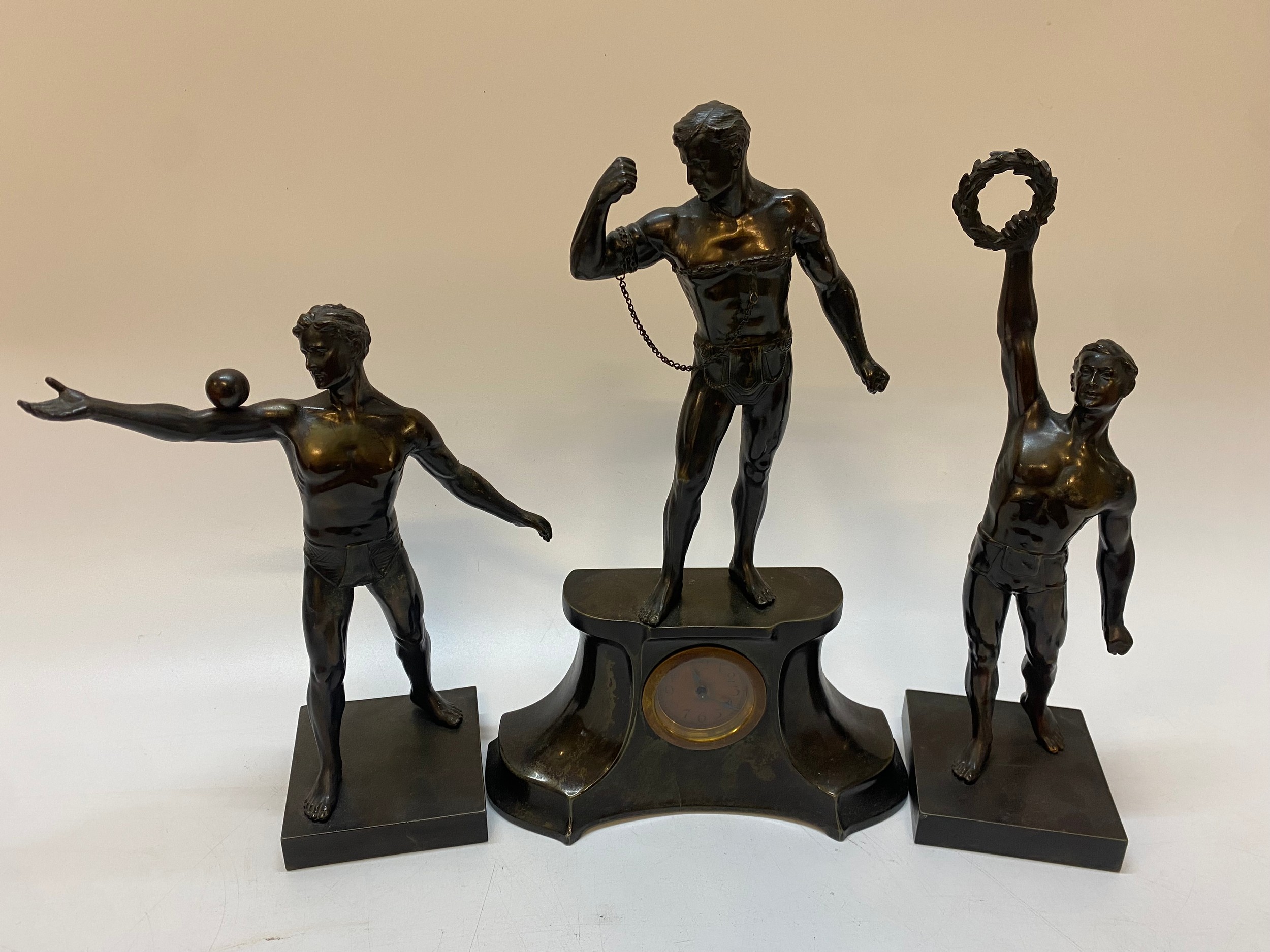 A clock in a spelter case with a surmount of a male figure in chains - 14in high. together with two spelter figures of males, one holding a ball - 11in. high. and the other holding a wreath - 13in. high.