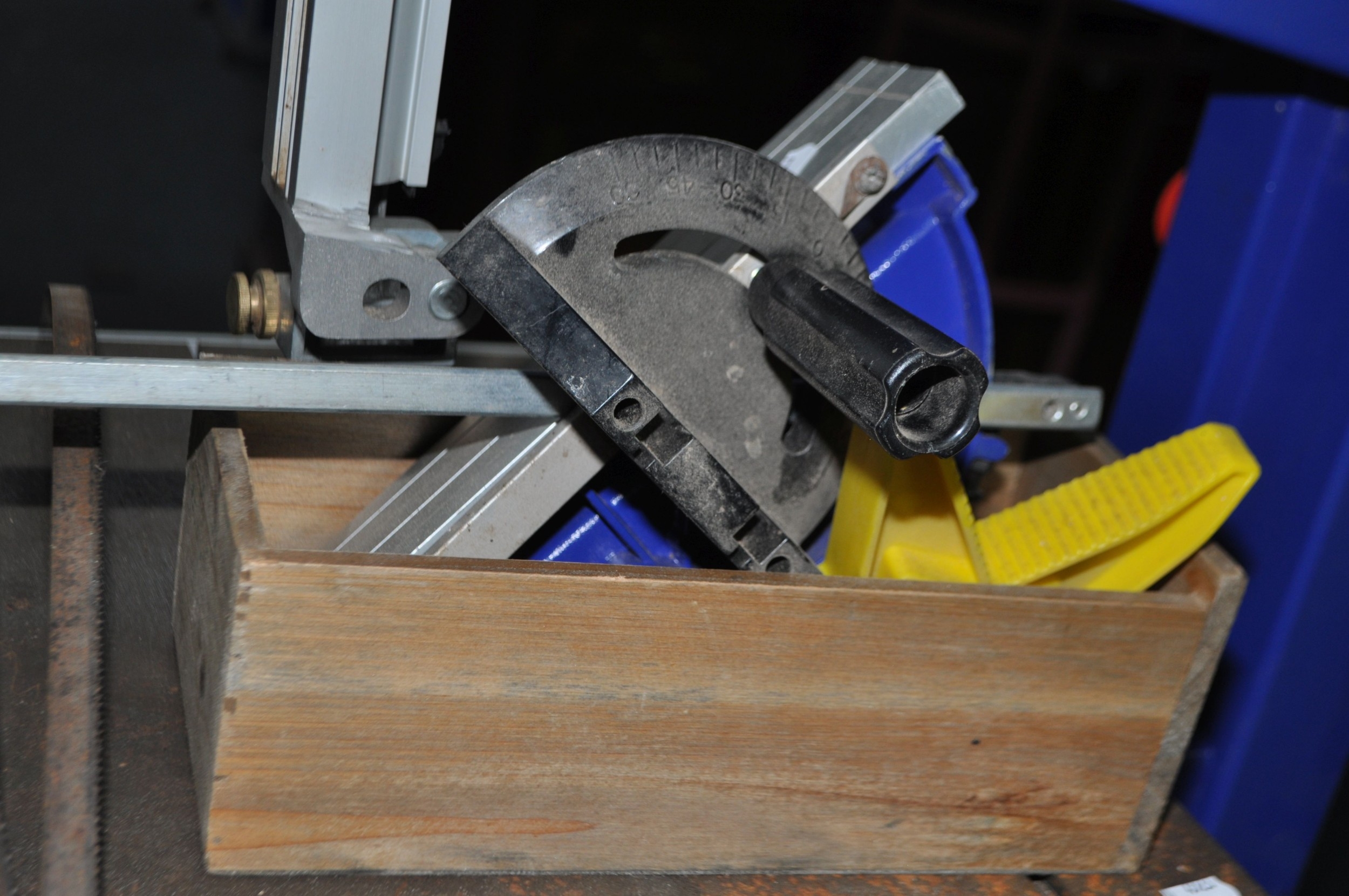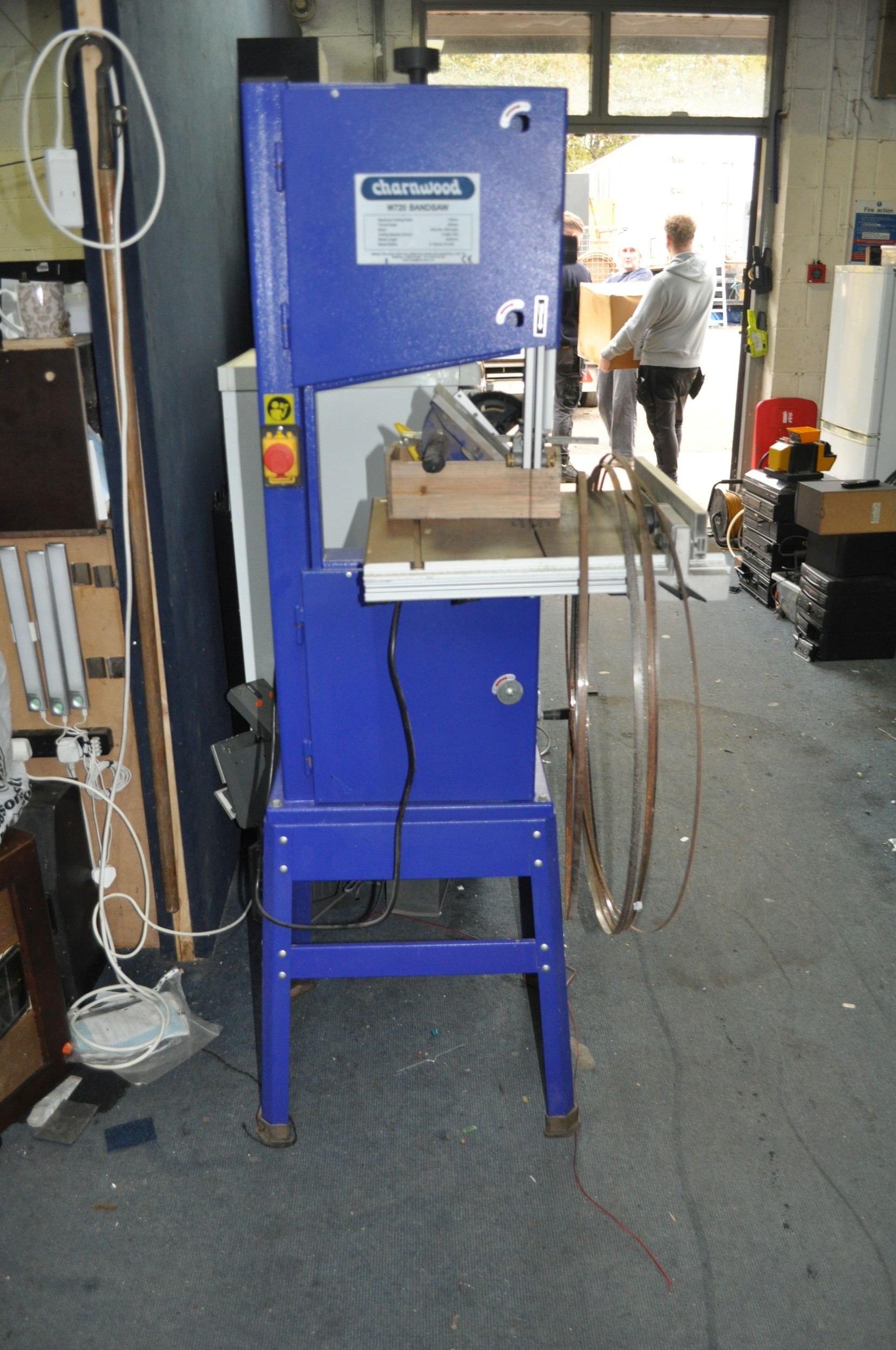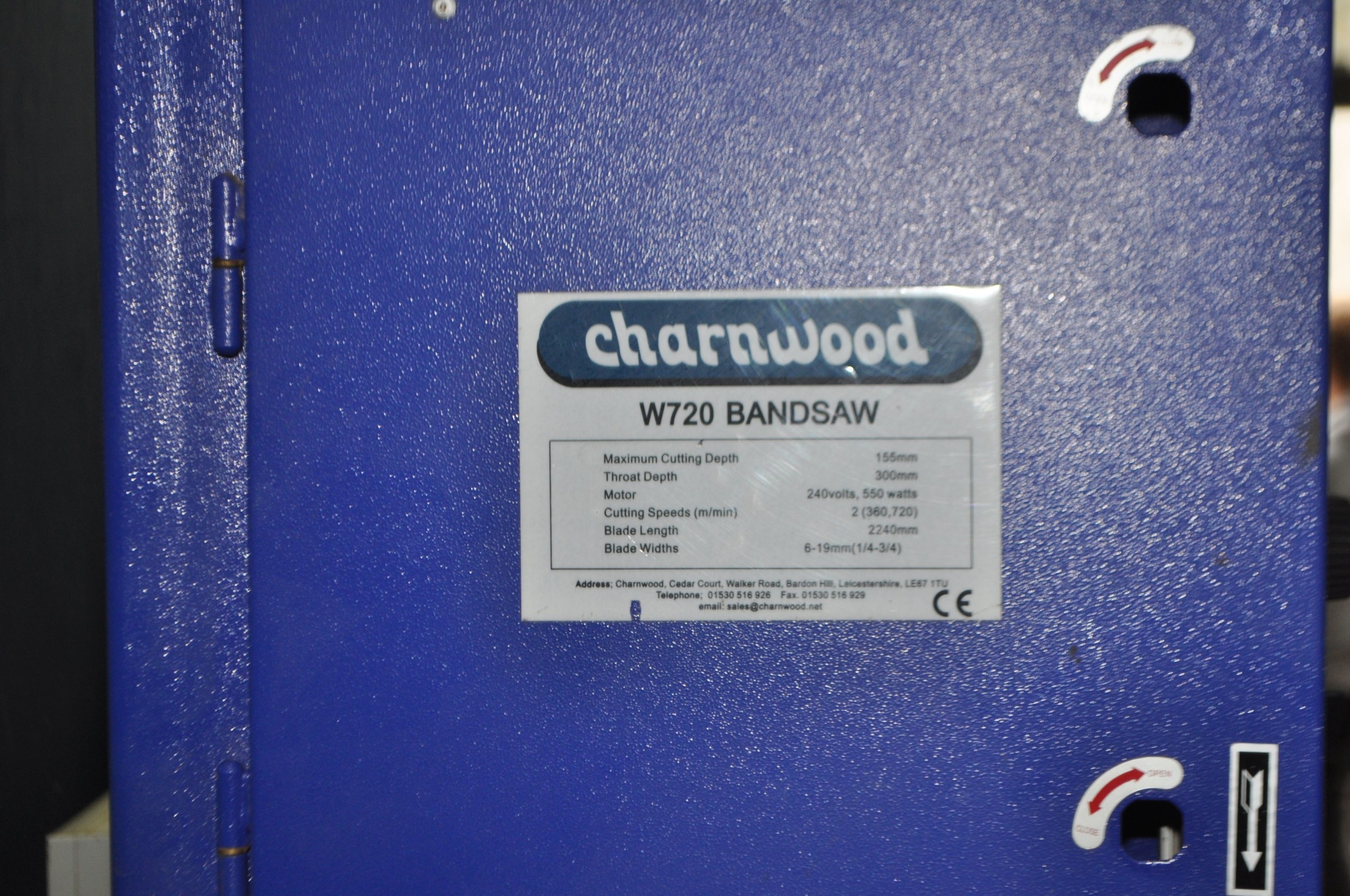 A CHARNWOOD W720 BANDSAW ON STAND with parallel and mitre guides and spare blades total height 171cm (PAT pass and working but missing catches for door)