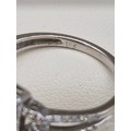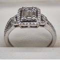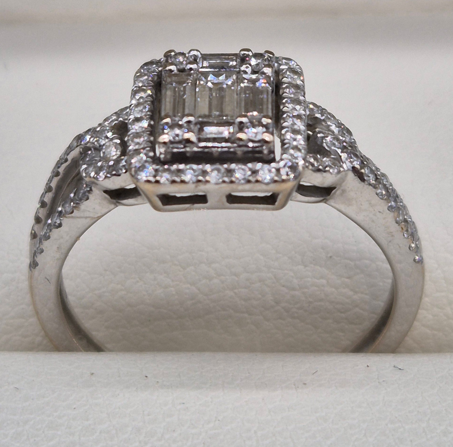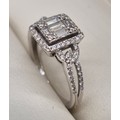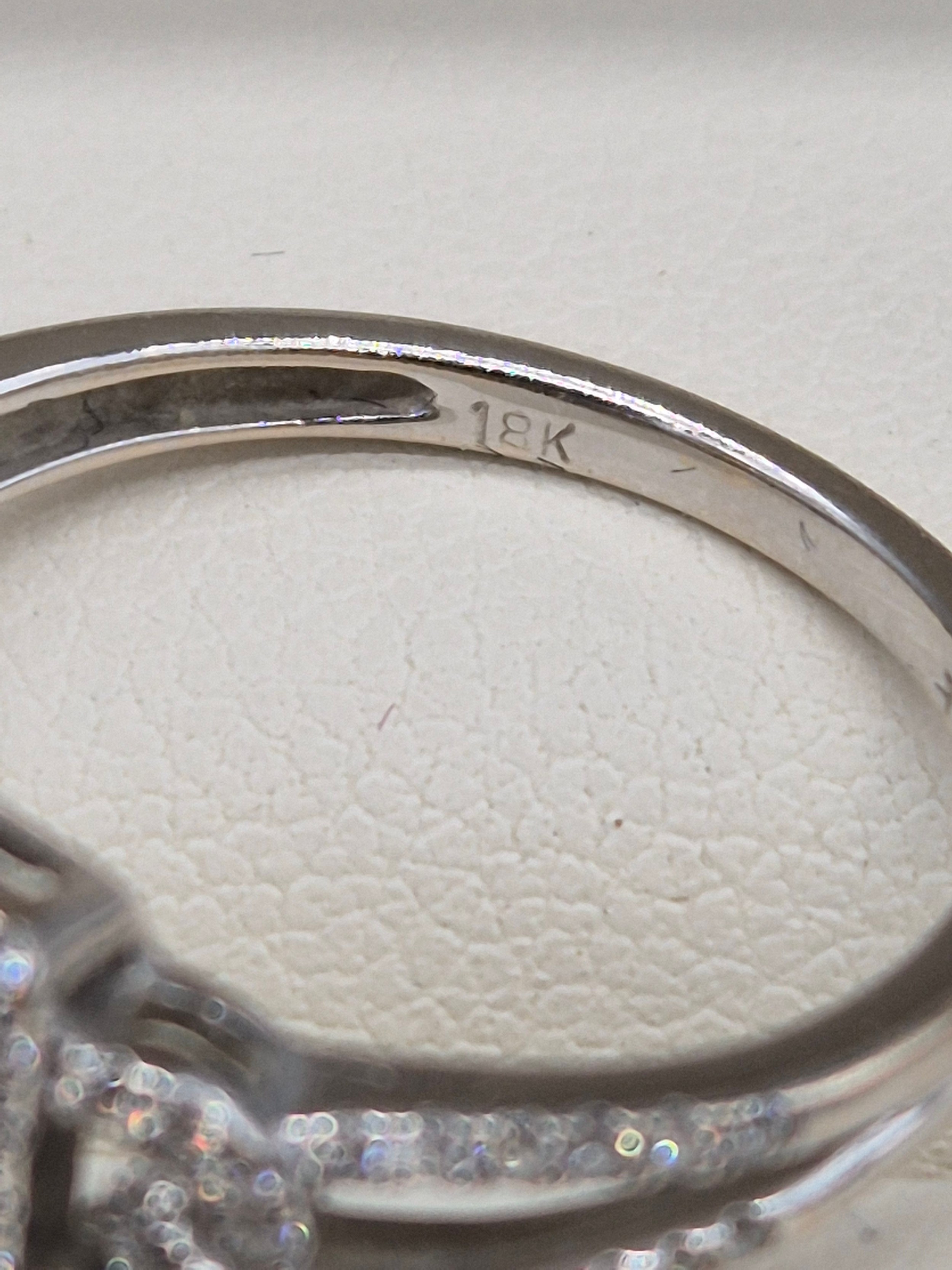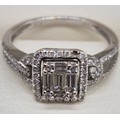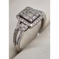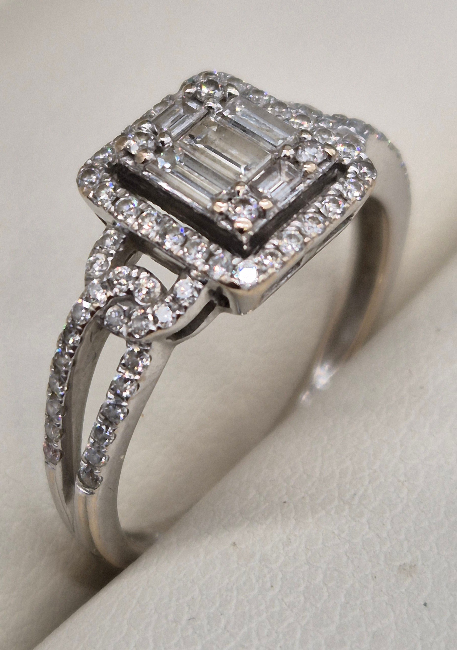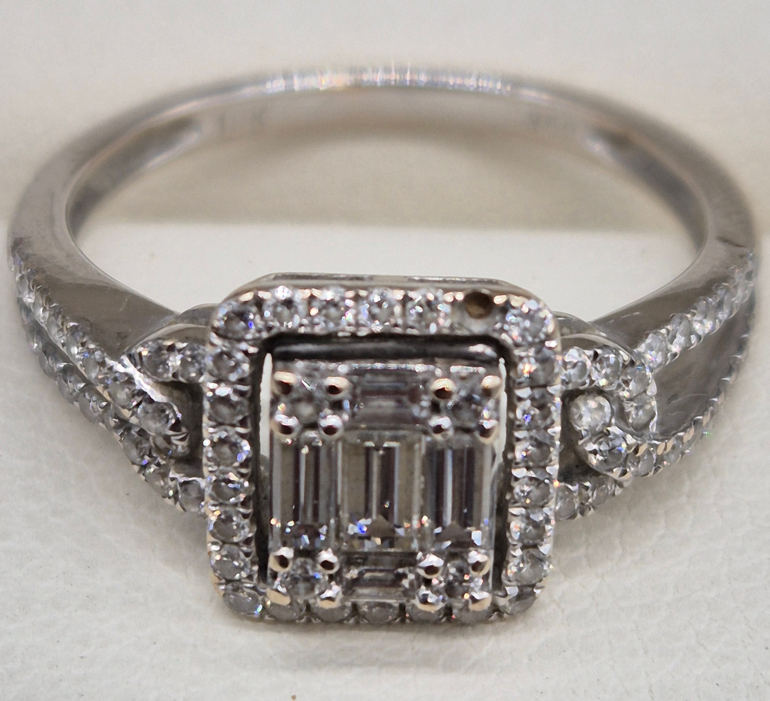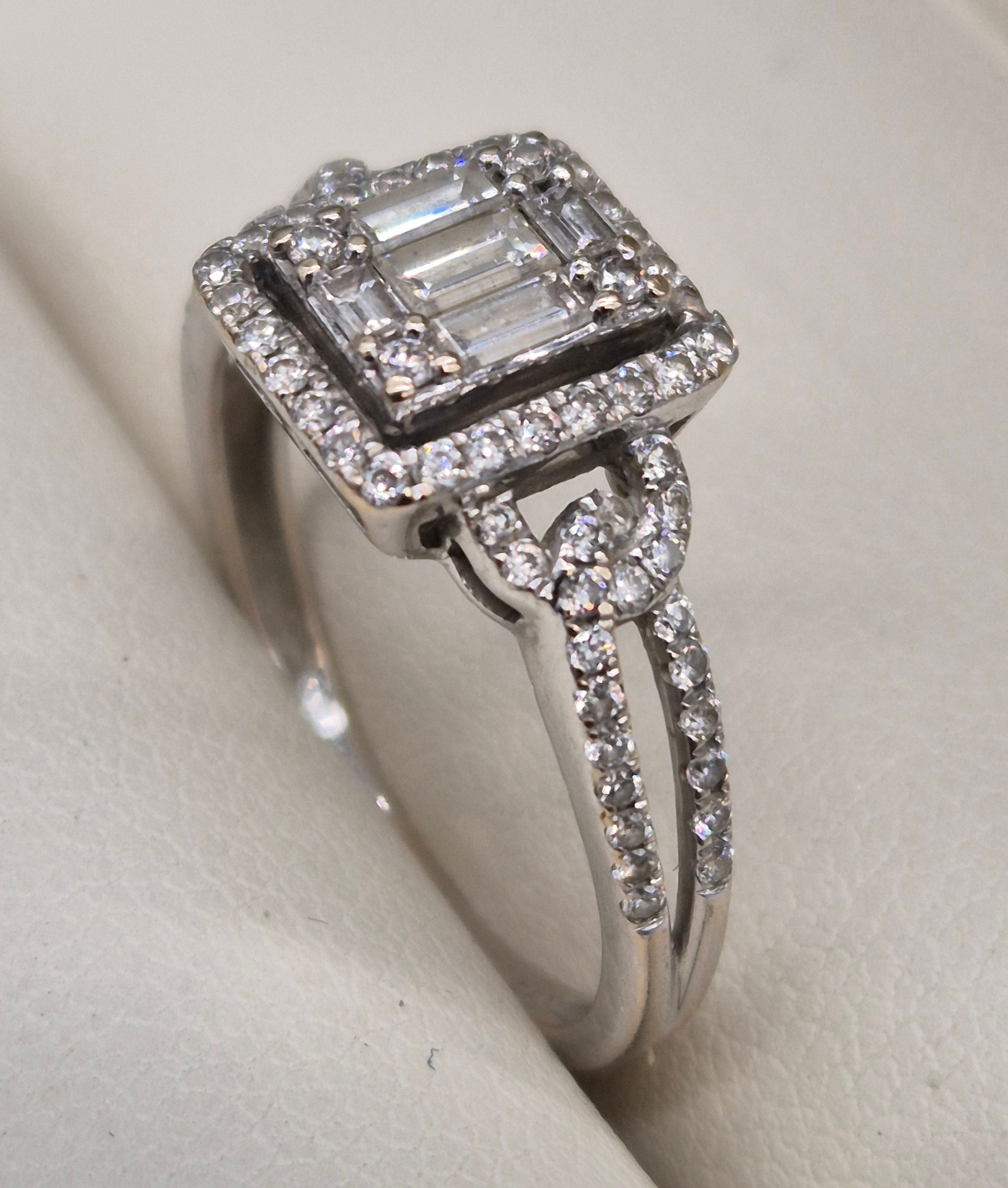 18ct white gold and diamond ring. 0.60cts. Round and emerald cut diamonds. Missing one round cut diamond. Ring size M 1/2. 3.18grams.