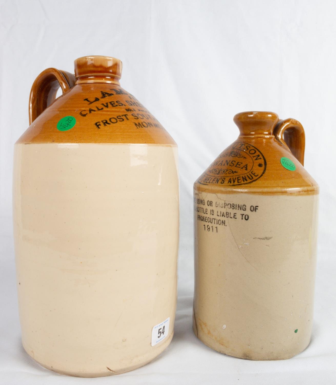 TWO STONEWARE FLAGONS MONMOUTH & SWANSEA BOTH A/F