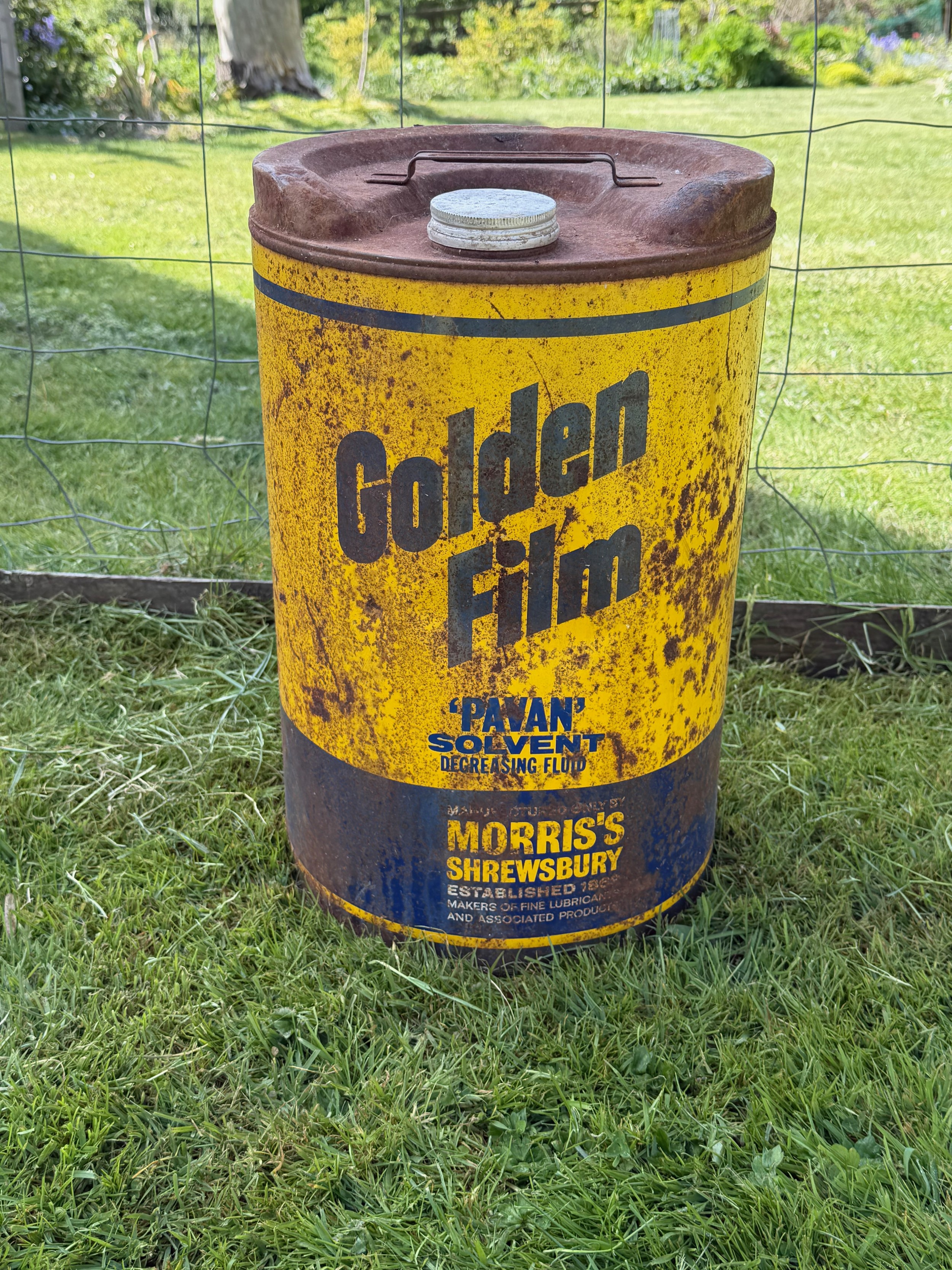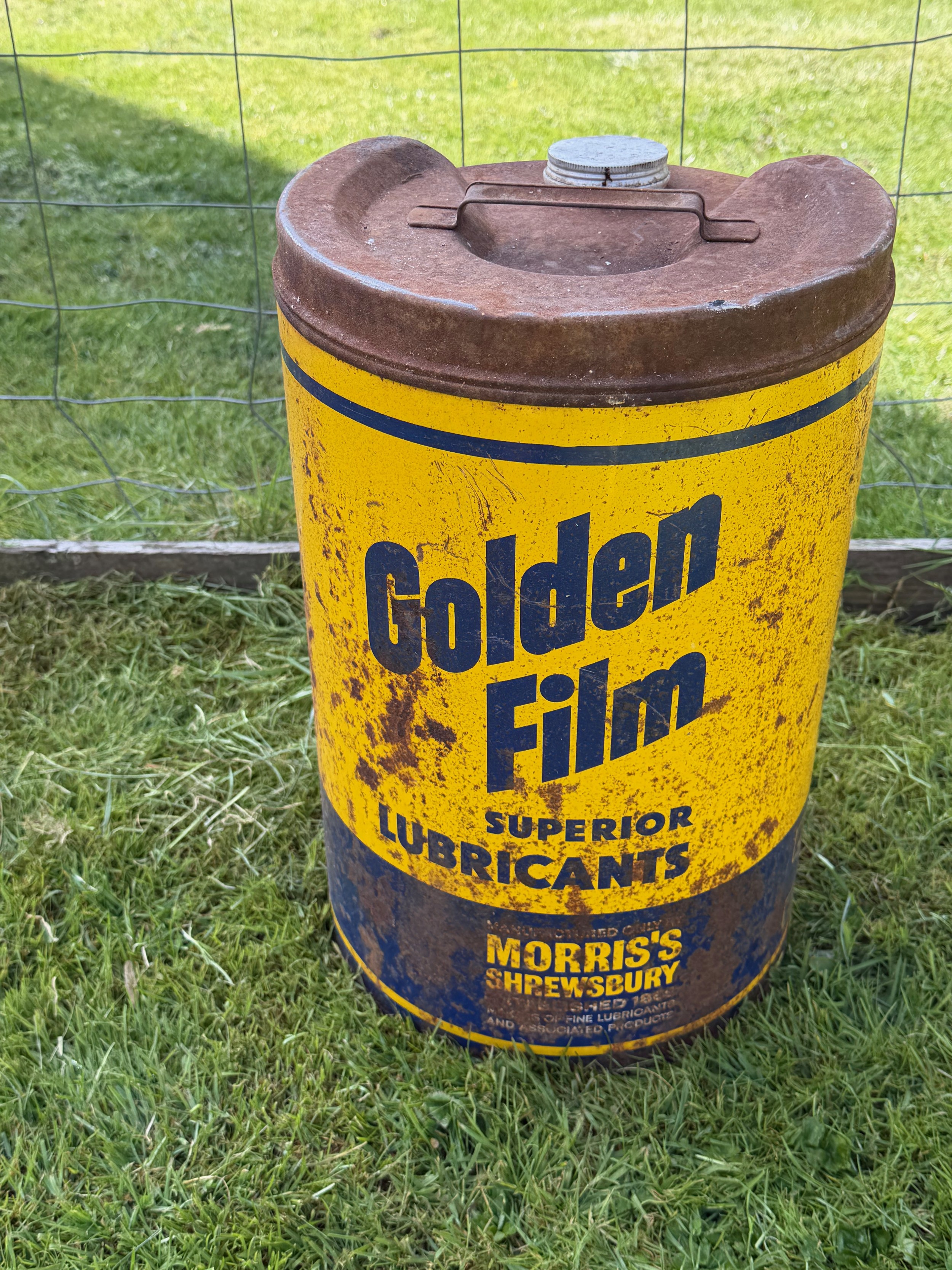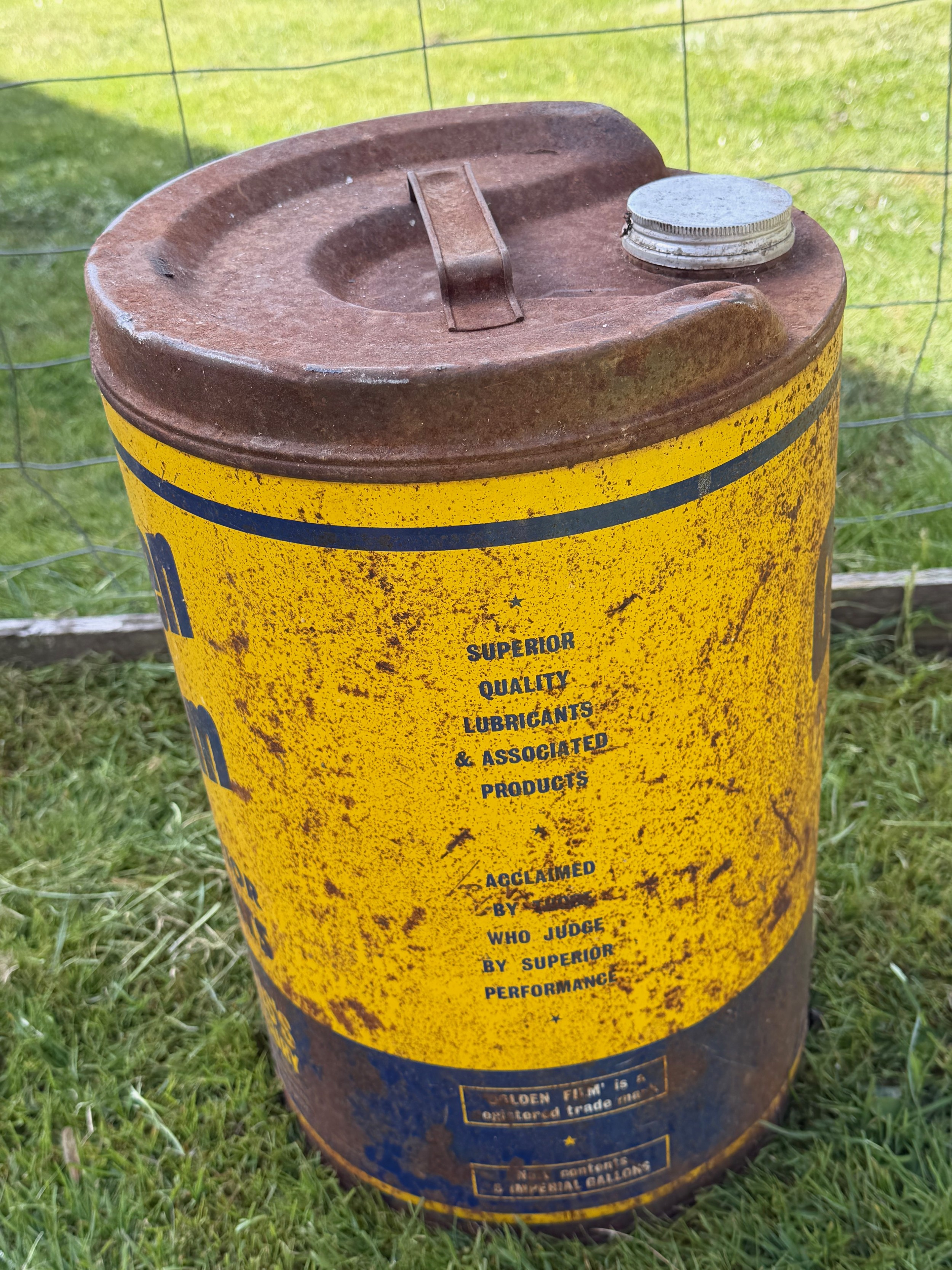 Petrolania, automobilia, a five gallon Golden Film oil company can.This lot is collection only