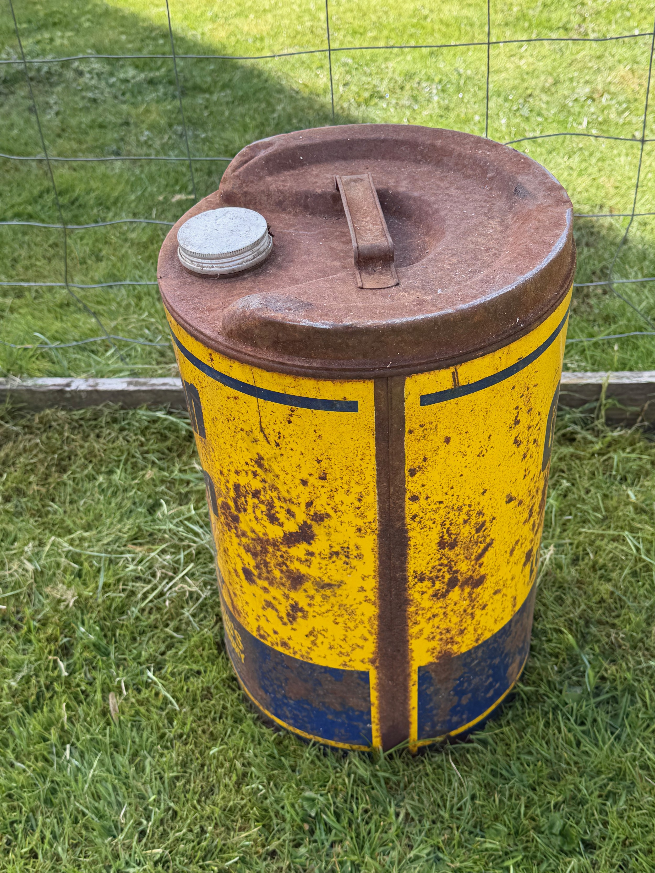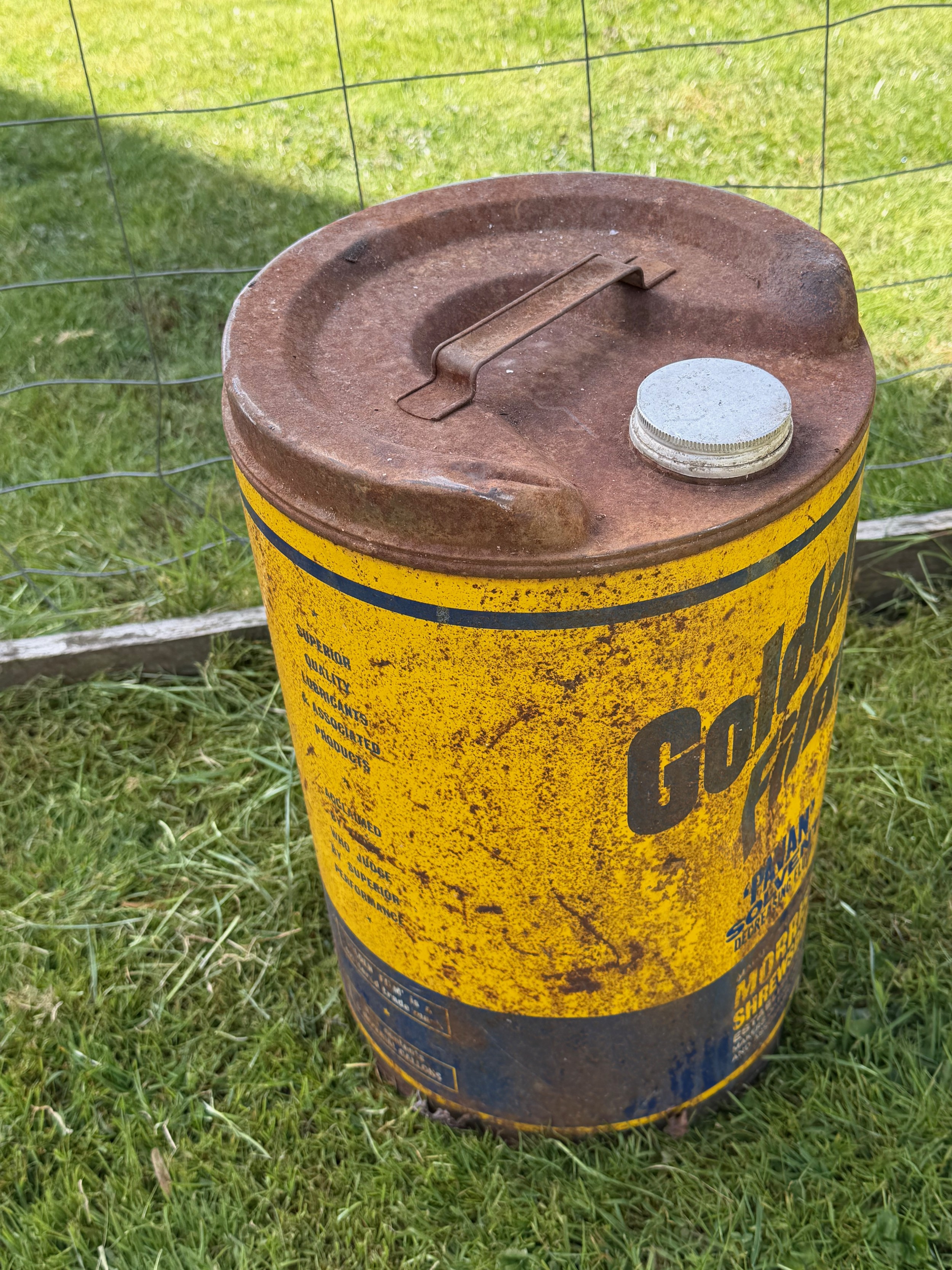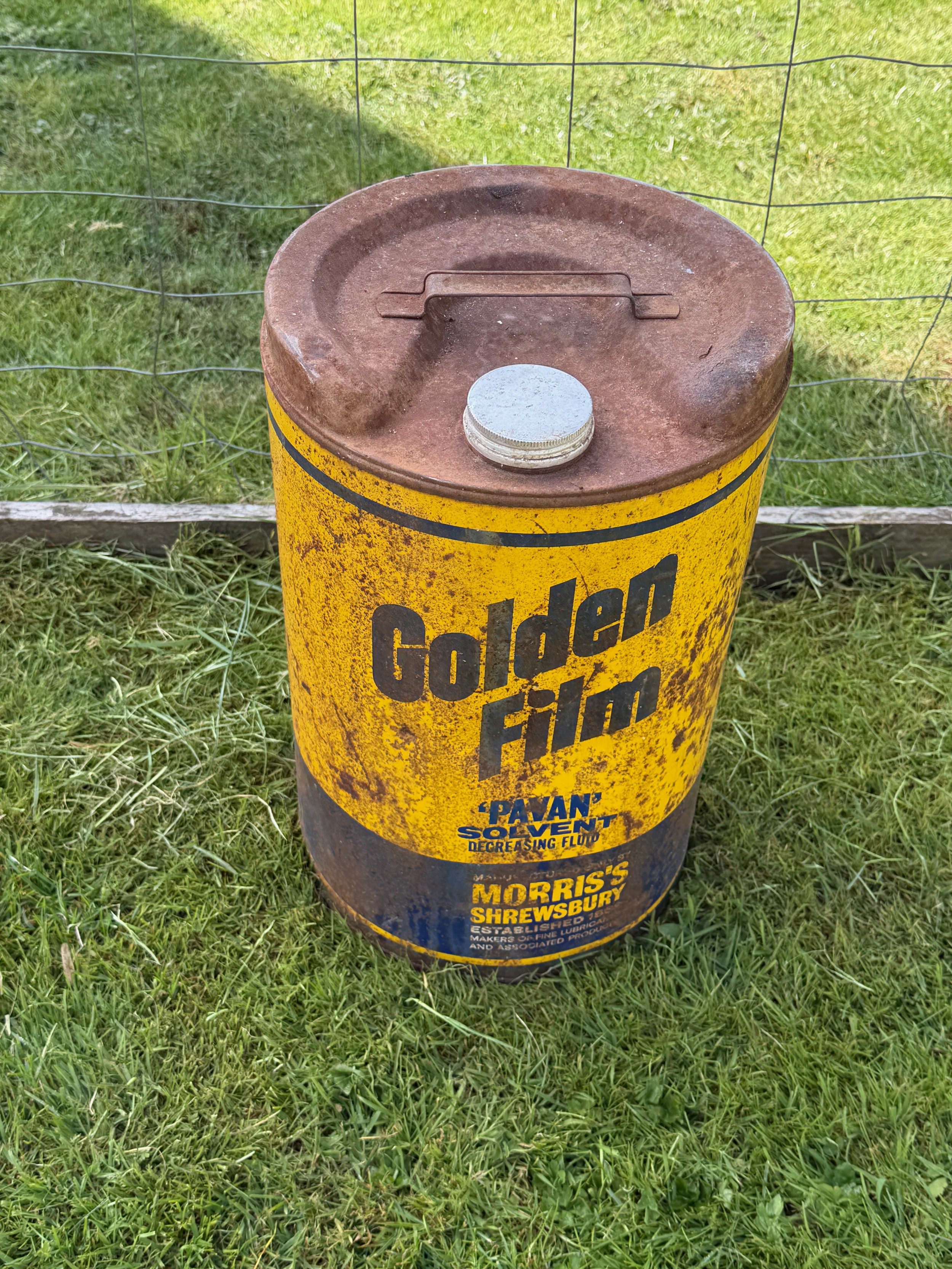 Petrolania, automobilia, a five gallon Golden Film oil company can.This lot is collection only