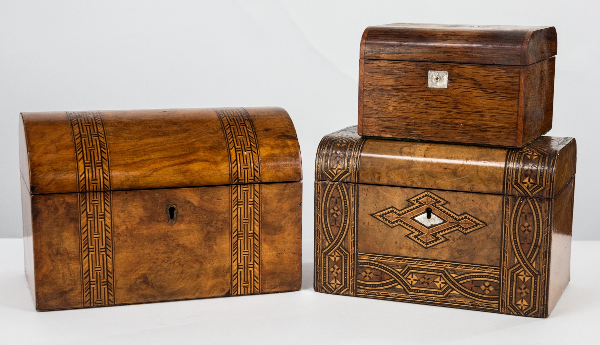THREE VICTORIAN WOODEN TEA CADDIES, comprising: A DOMED TOPPED AND CROSSBANDED EXAMPLE, ANOTHER SIMILAR and the other in ROSEWOOD with pewter cartouche ‘TEA’ and later blanked escutcheon, 6 ¼” (15.9cm) high, 9” x 5” (22.9cm x 12.7cm) and smaller, all with twin lidded compartments to the interior, (3)