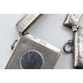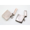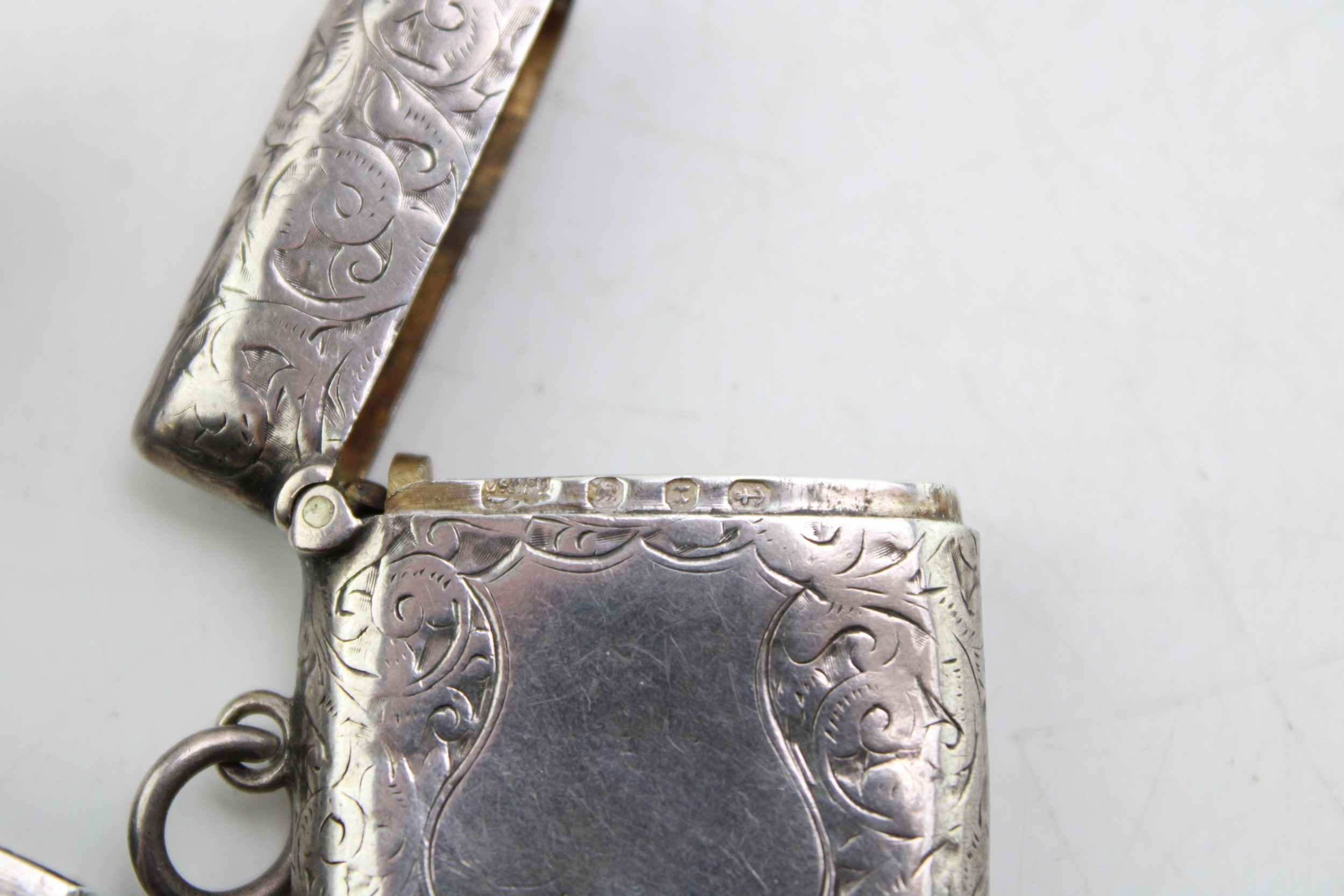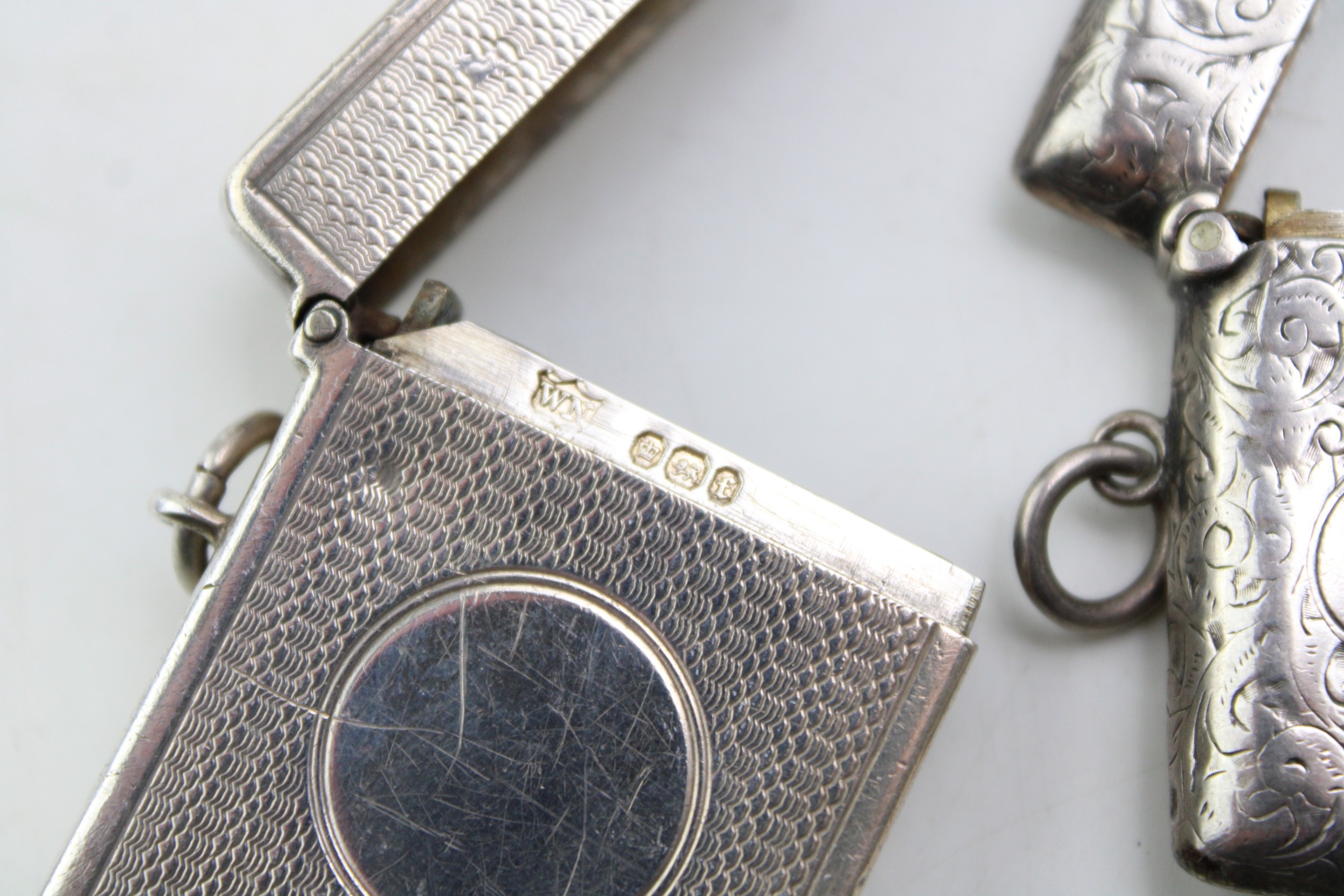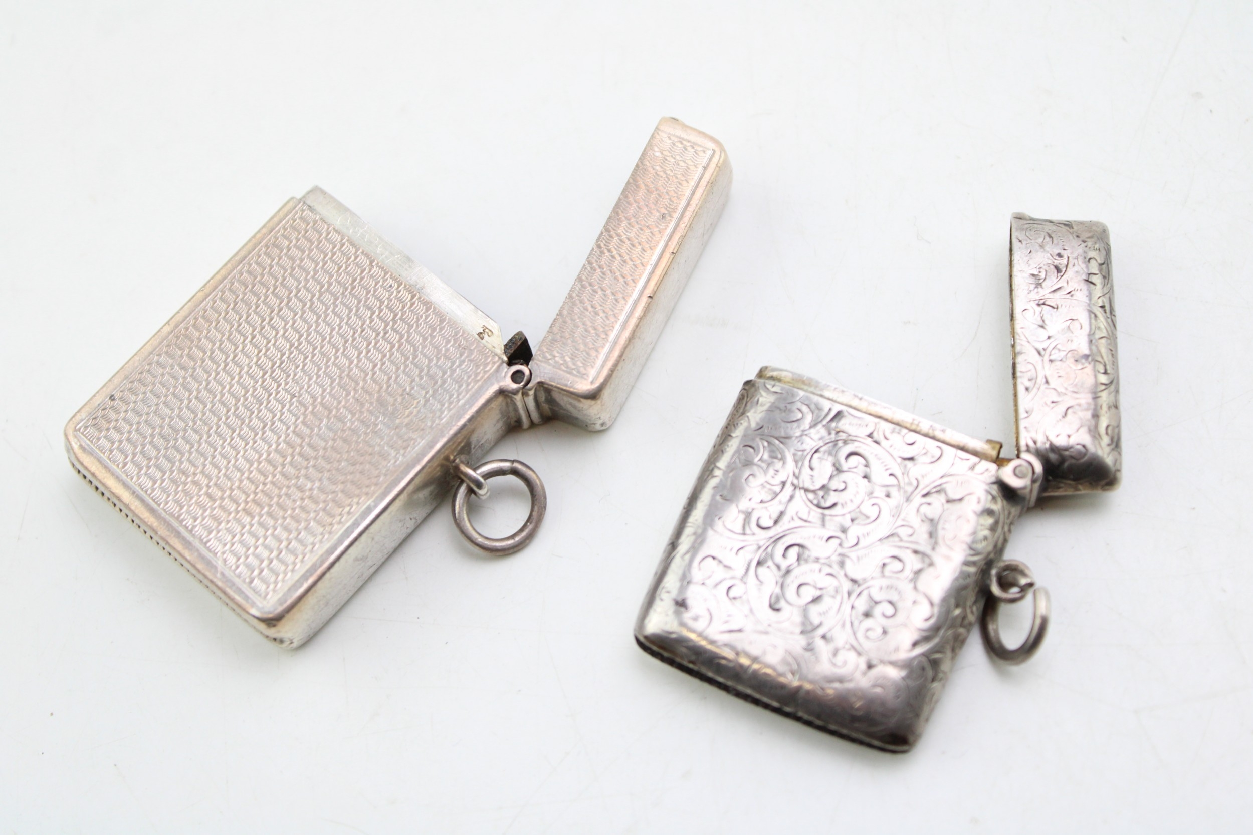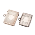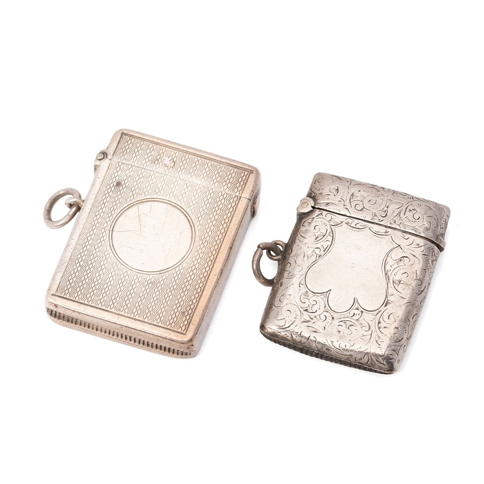 A Victorian silver vesta case, of rectangular form with engine turned decoration and clear circular reserve, Wiliam Neale, Sheffield, 1898, and a smaller example with foliate engraved decoration, and clear shaped shield reserve, makers mark obscured, Birmingham 1897, combined weight 51.3g, 1.65toz.