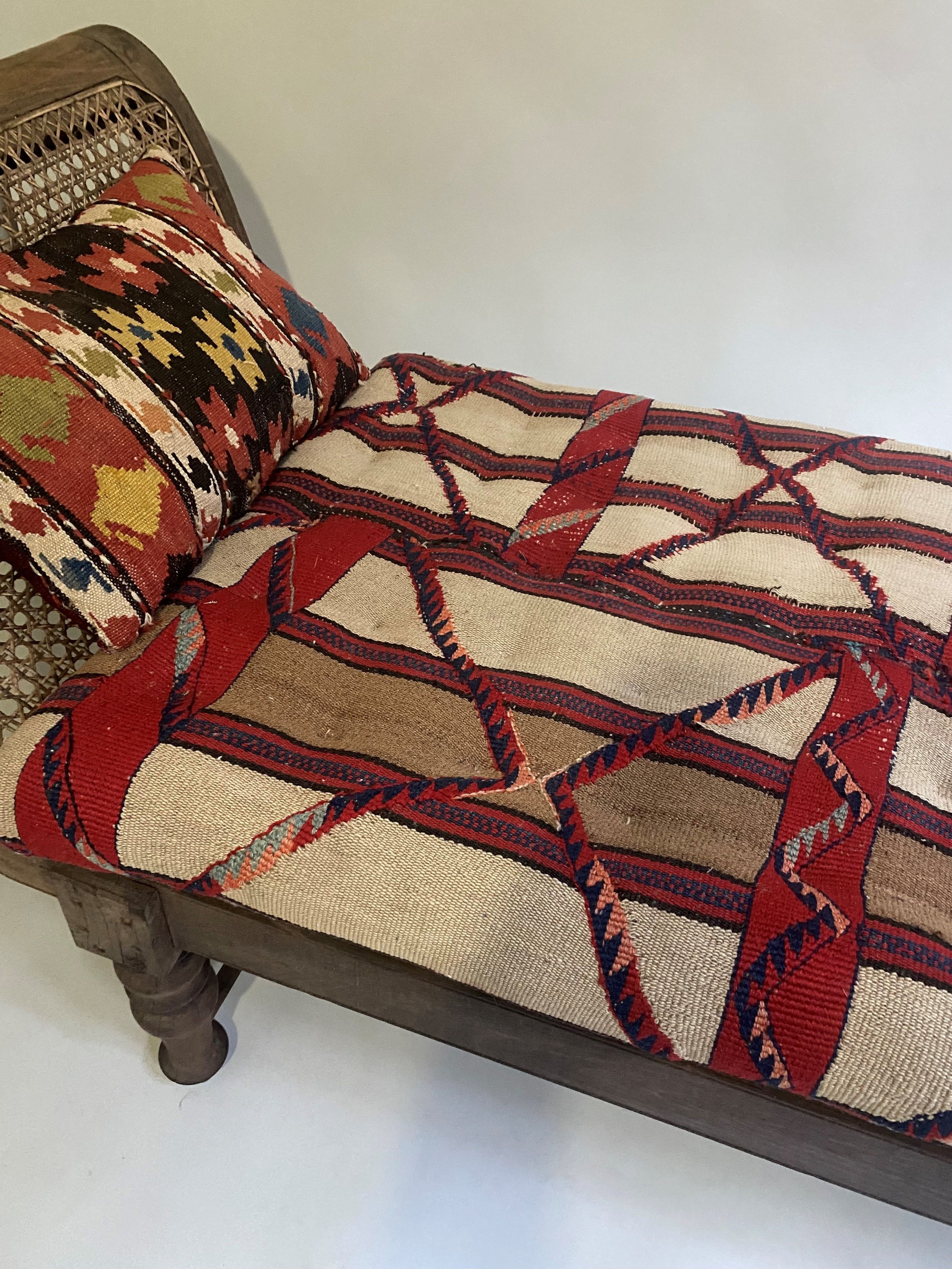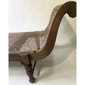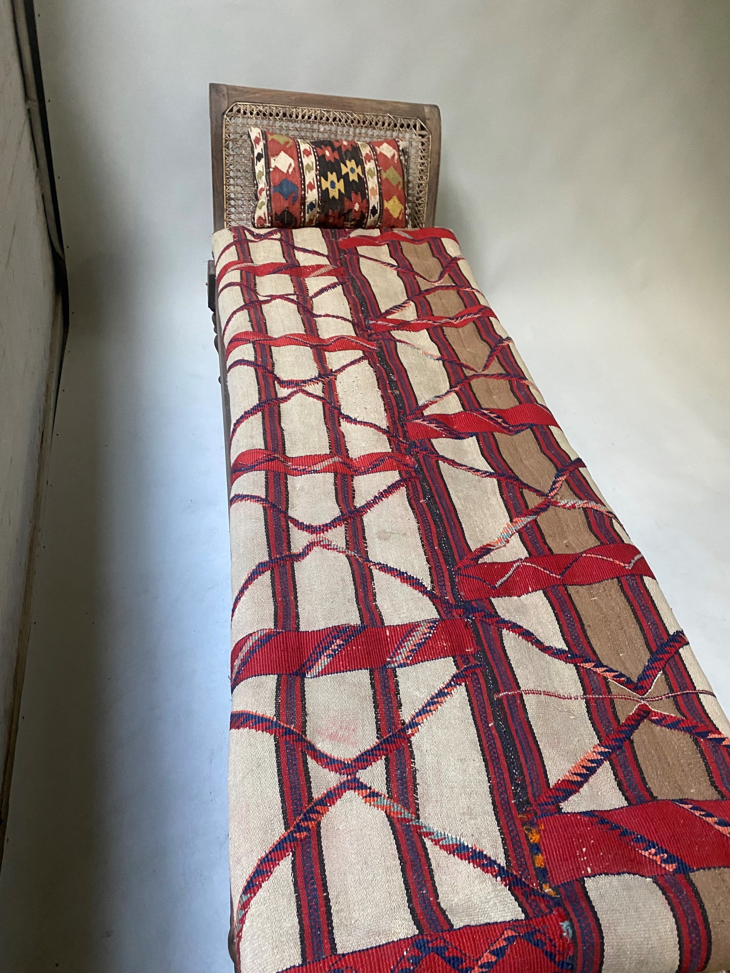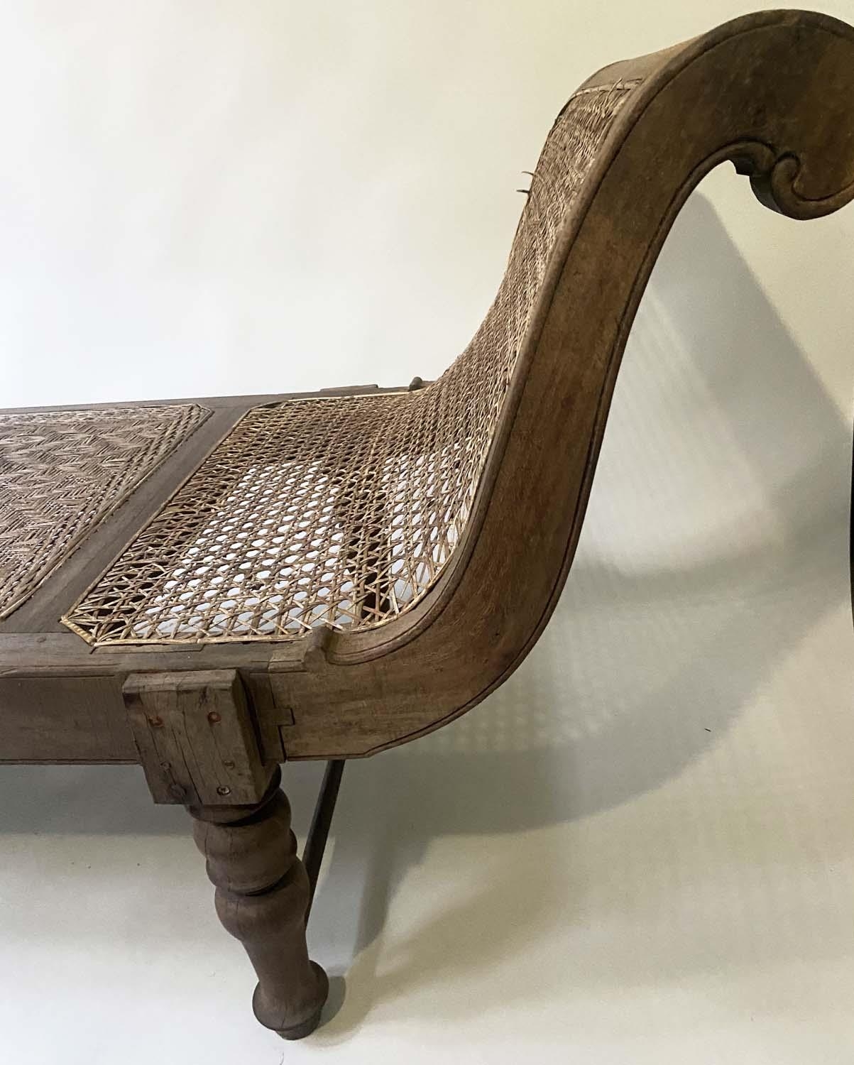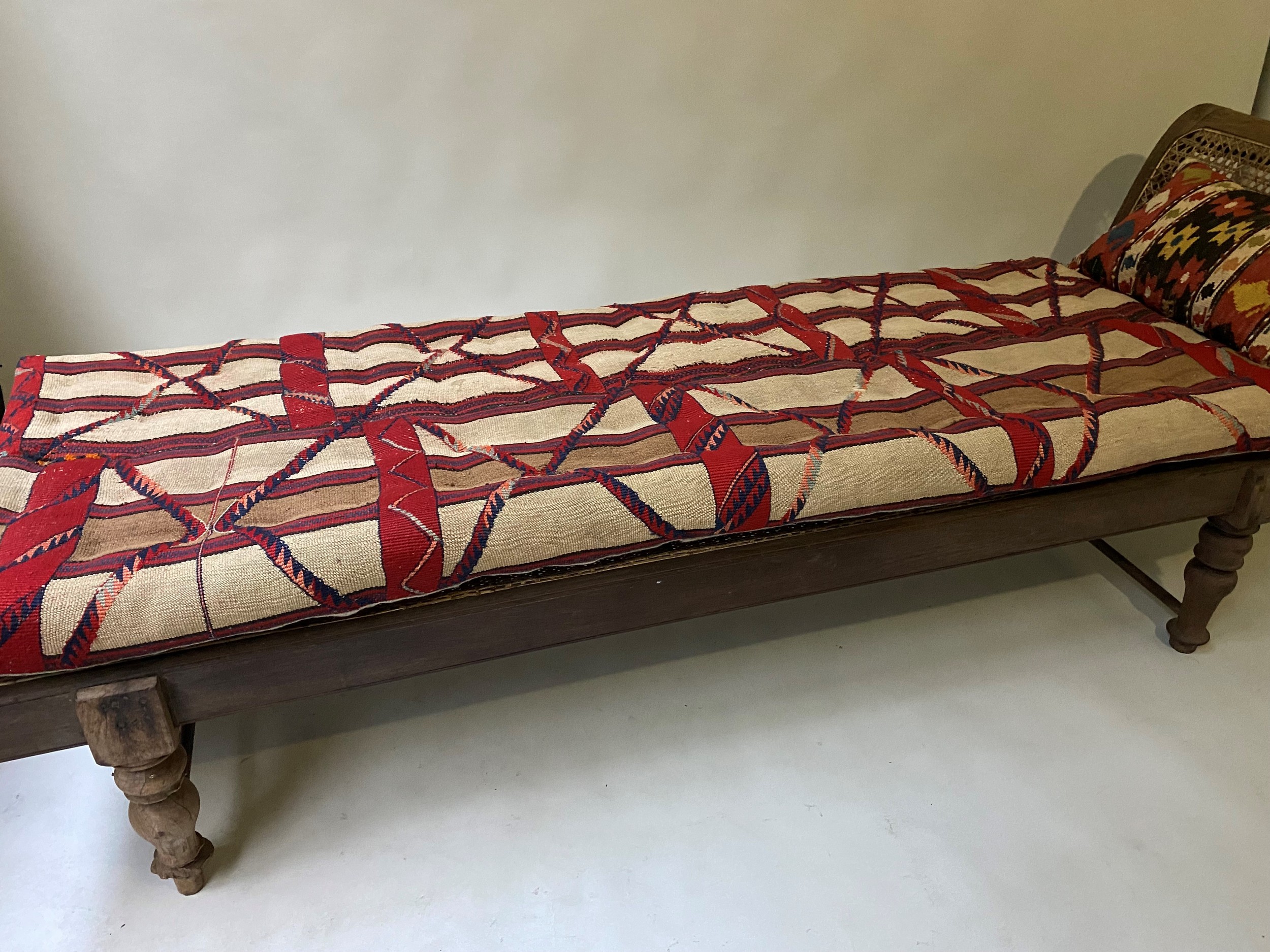 ANGLO INDIAN DAYBED/CHAISE, late 19th/early 20th century, North Indian teak and cane panelled, with quilted tribal kelim seat cushion and another, 222cm W.