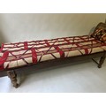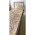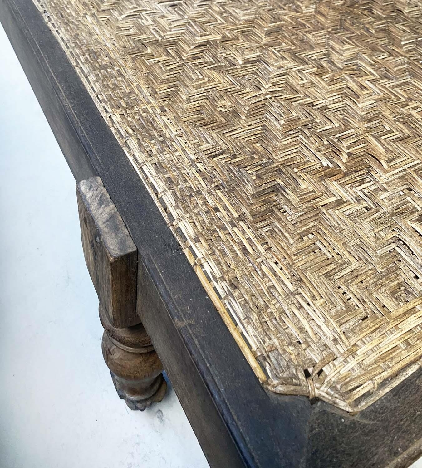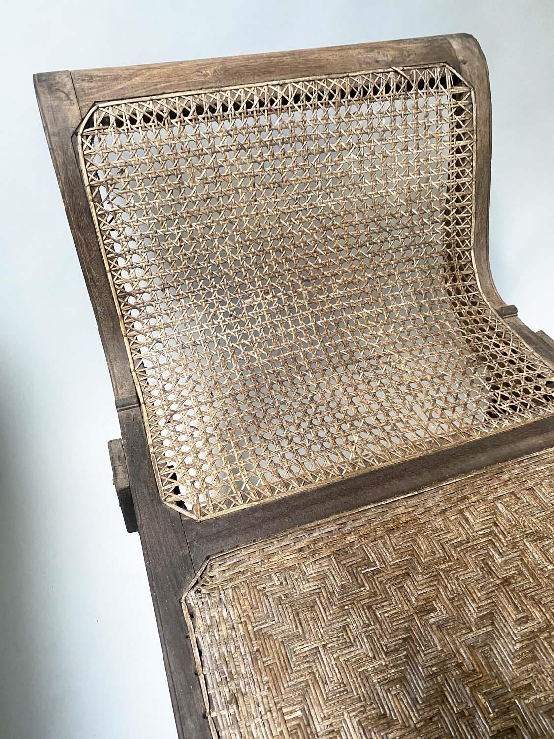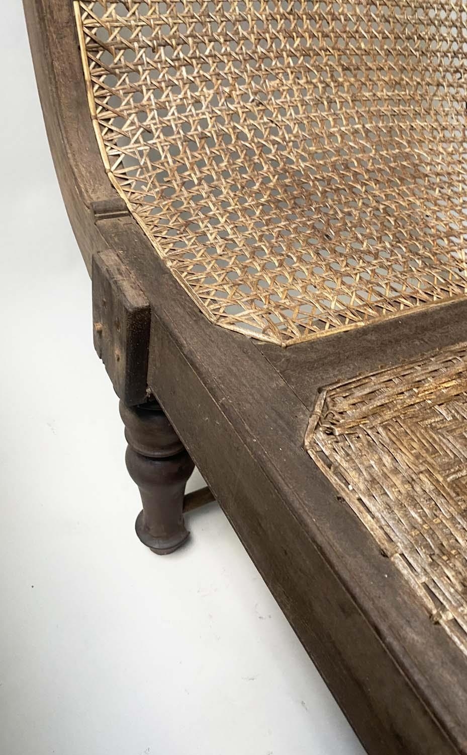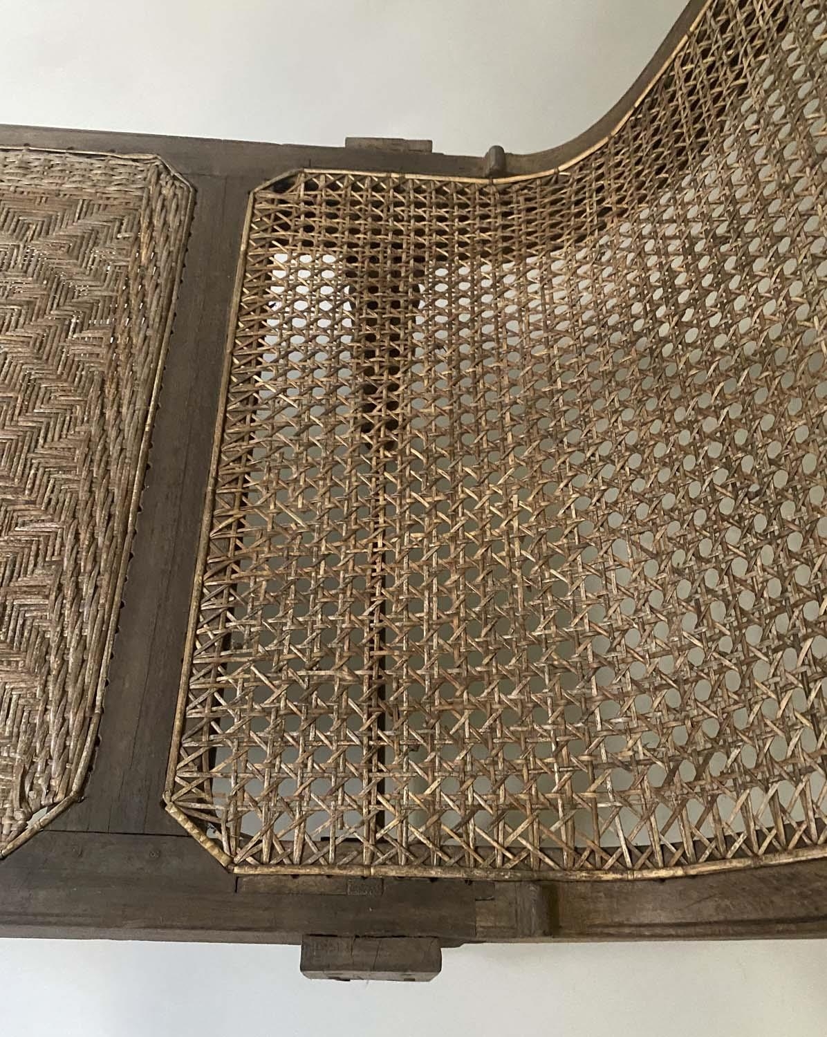 ANGLO INDIAN DAYBED/CHAISE, late 19th/early 20th century, North Indian teak and cane panelled, with quilted tribal kelim seat cushion and another, 222cm W.