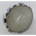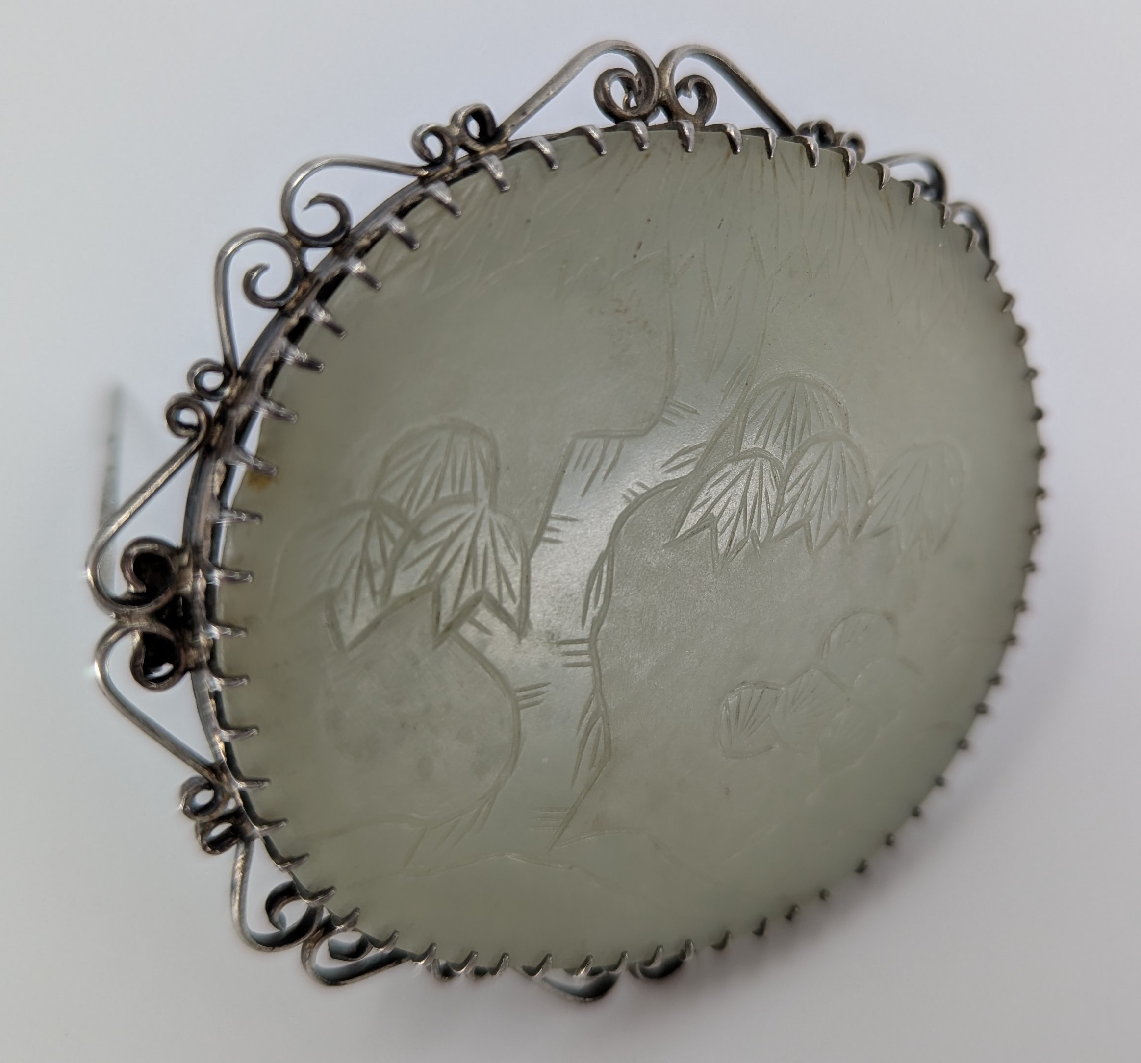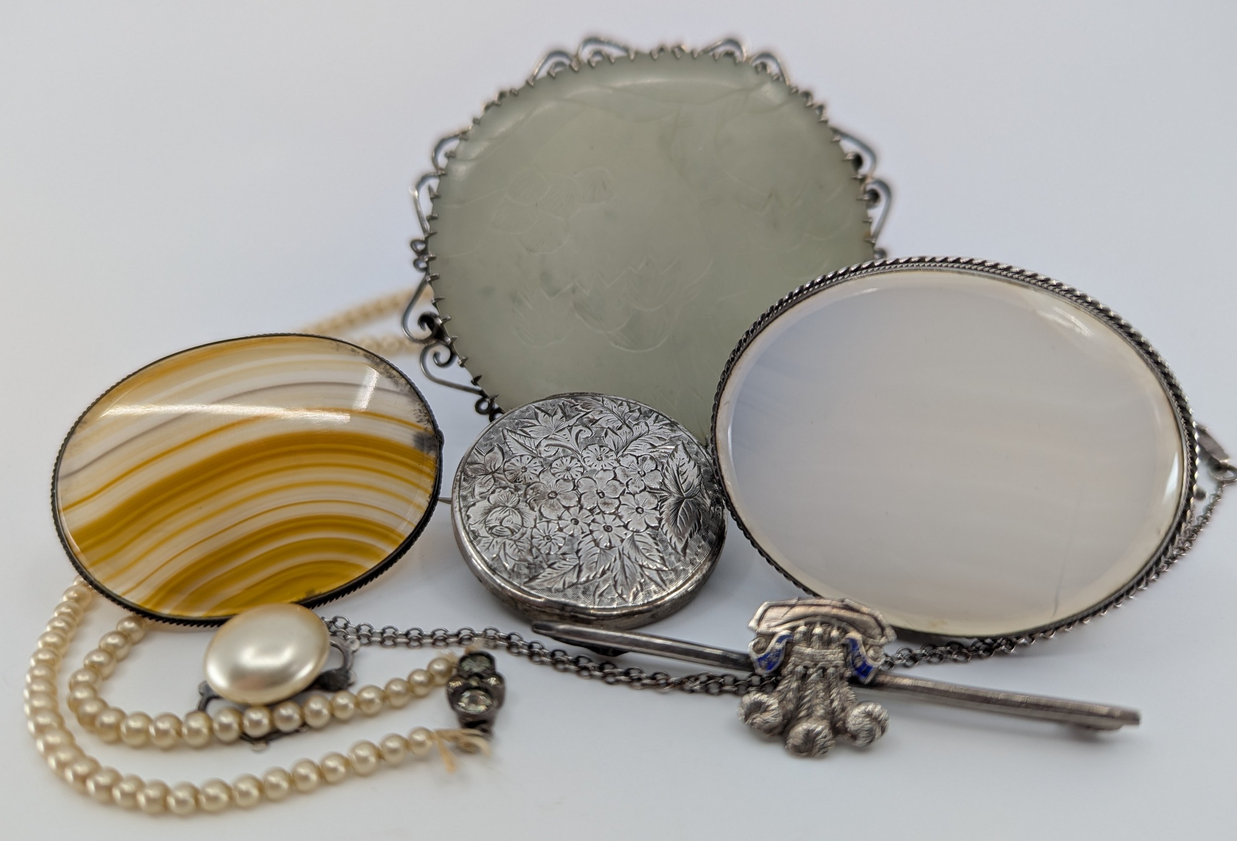 to include an unmarked white metal mounted palm tree etched design oval bowenite brooch, measuring approx. 7cm's max length x 6.5cm's max height, two unmarked white metal mounted oval cabochon banded agate brooches, an unmarked white metal Prince of Wales feather brooch, a simulated pearl necklace with "935" stamped white paste stone set clasp, an unmarked white metal button shaped simulated pearl pendant necklace and a "SILVER" stamped round floral design brooch