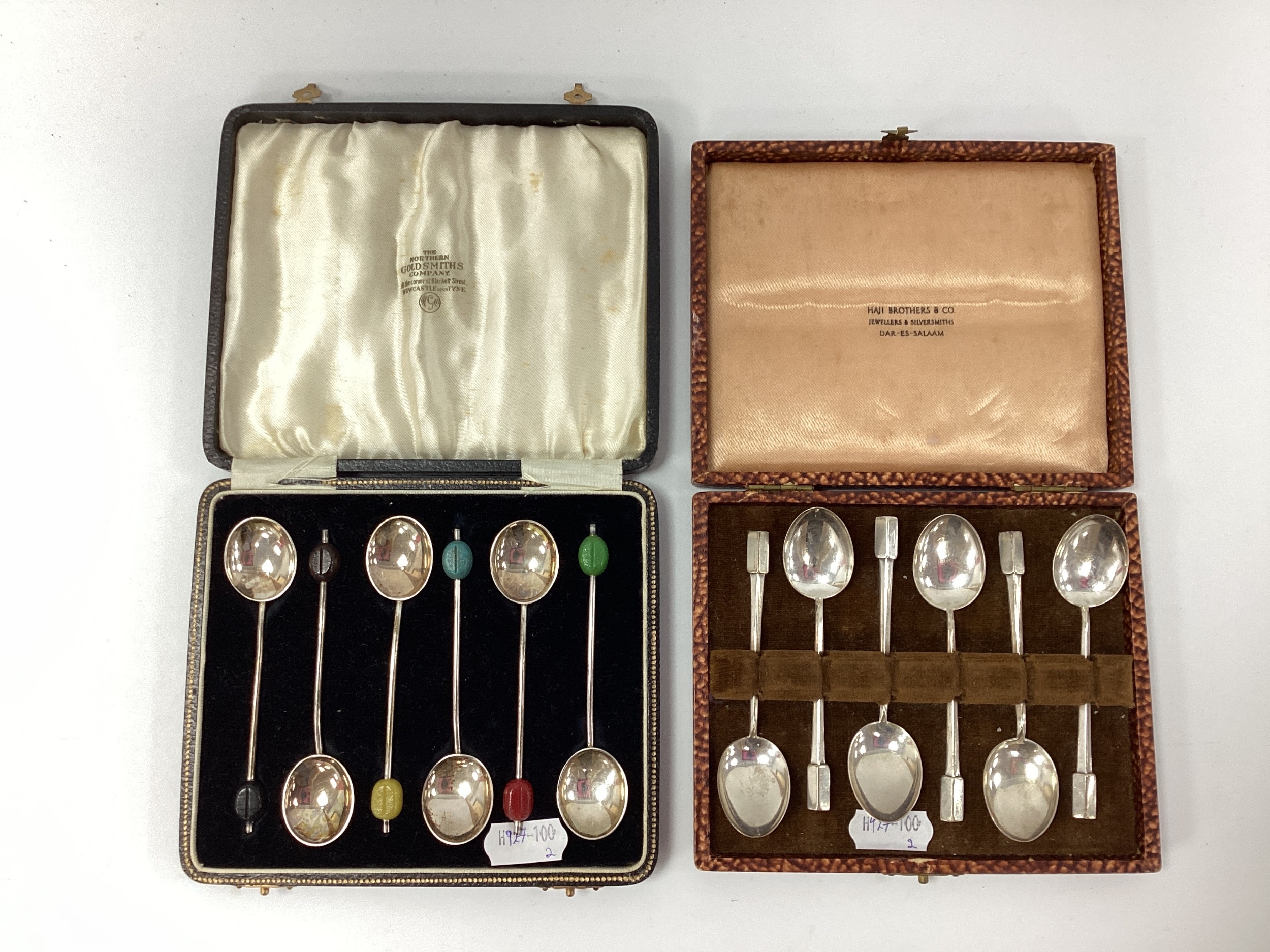 A Cased Set of Six Hallmarked Silver Coffee Bean Spoons, Arthur Price & Co Ltd, Birmingham 1934; Together with a Cased Set of Six Hallmarked Silver Coffee Spoons, Deakin & Francis Ltd, Birmingham 1945(?), with geometric style finial (Total weight 85grams).