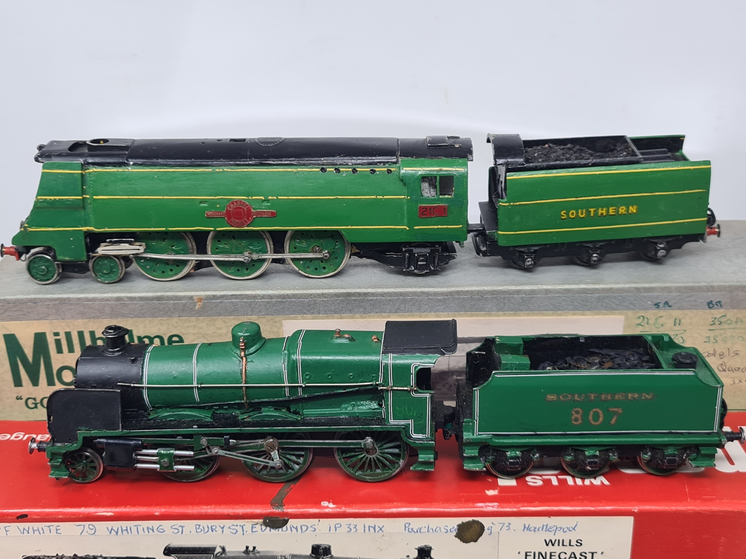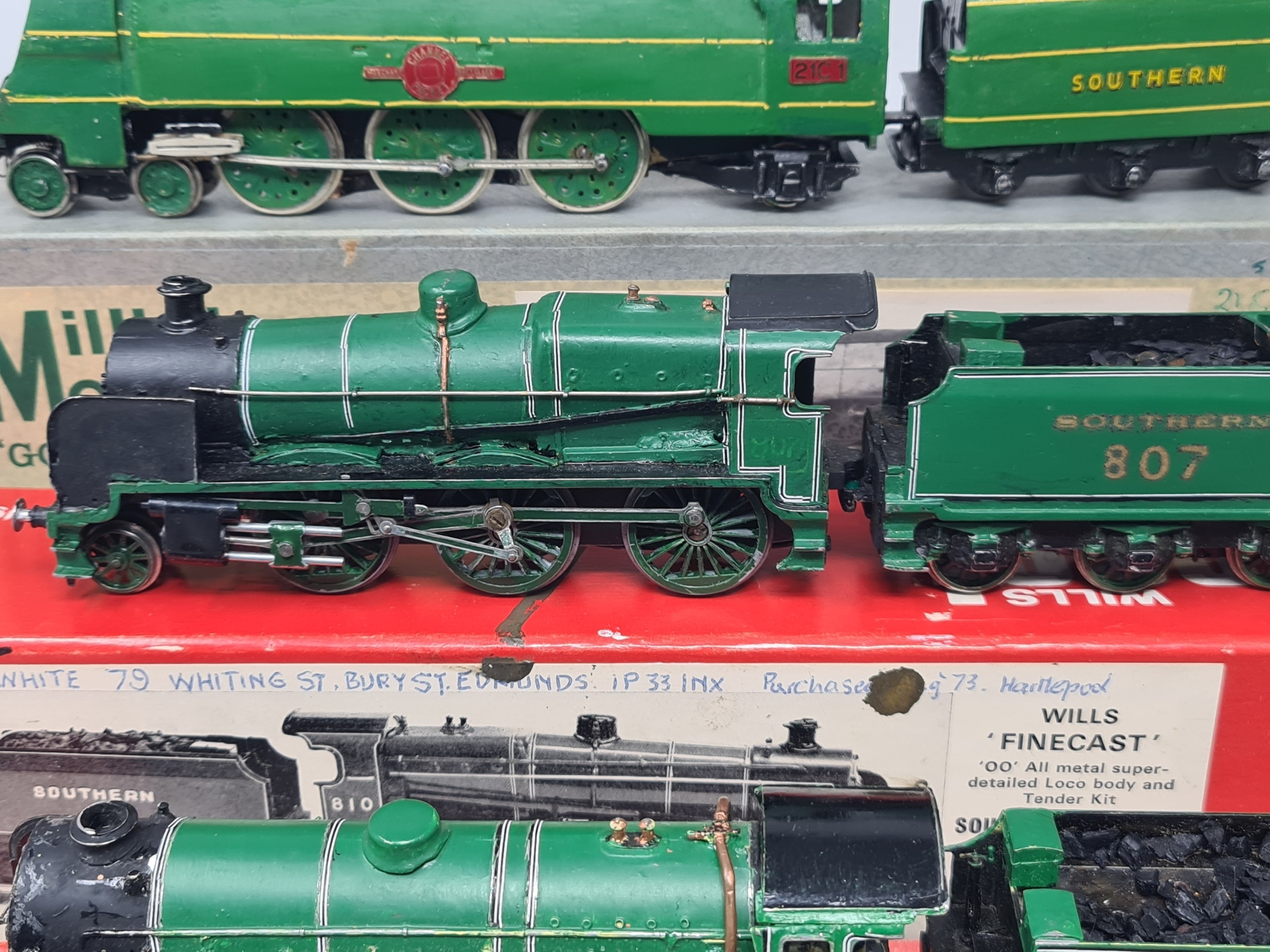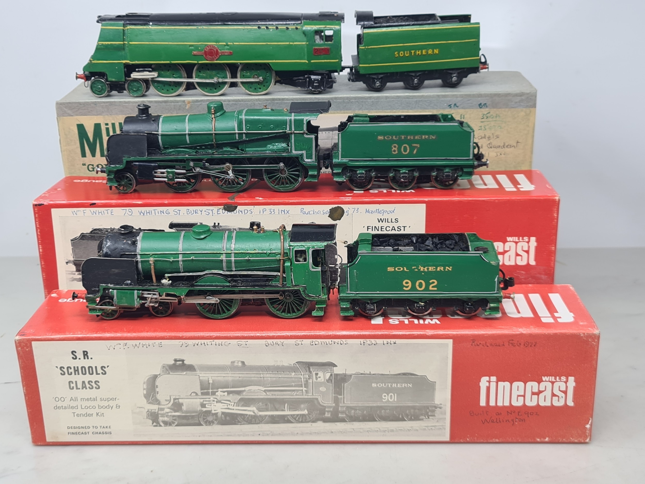 Three finescale 4mm 00 gauge kit built SR Locomotives comprising Wills Finecast 4-4-0 Schools Class, 4-4-0 N Class and Millholme Models 4-6-2 un-rebuilt Merchant Navy Class, built and painted to a low standard