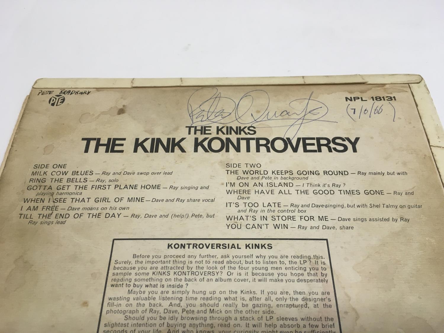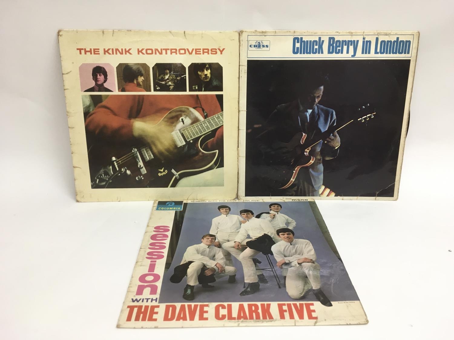 Three LPs comprising 'The Kink Kontroversy' signed to the reverse by bassist Pete Quaife (no provenance), 'Chuck Berry In London' and 'Session With The Dave Clark Five'. Please note that we cannot guarantee the signature to be genuine and potential buyers must satisfy themselves as to the authenticity of the item. Conditions vary from fair to VG.