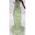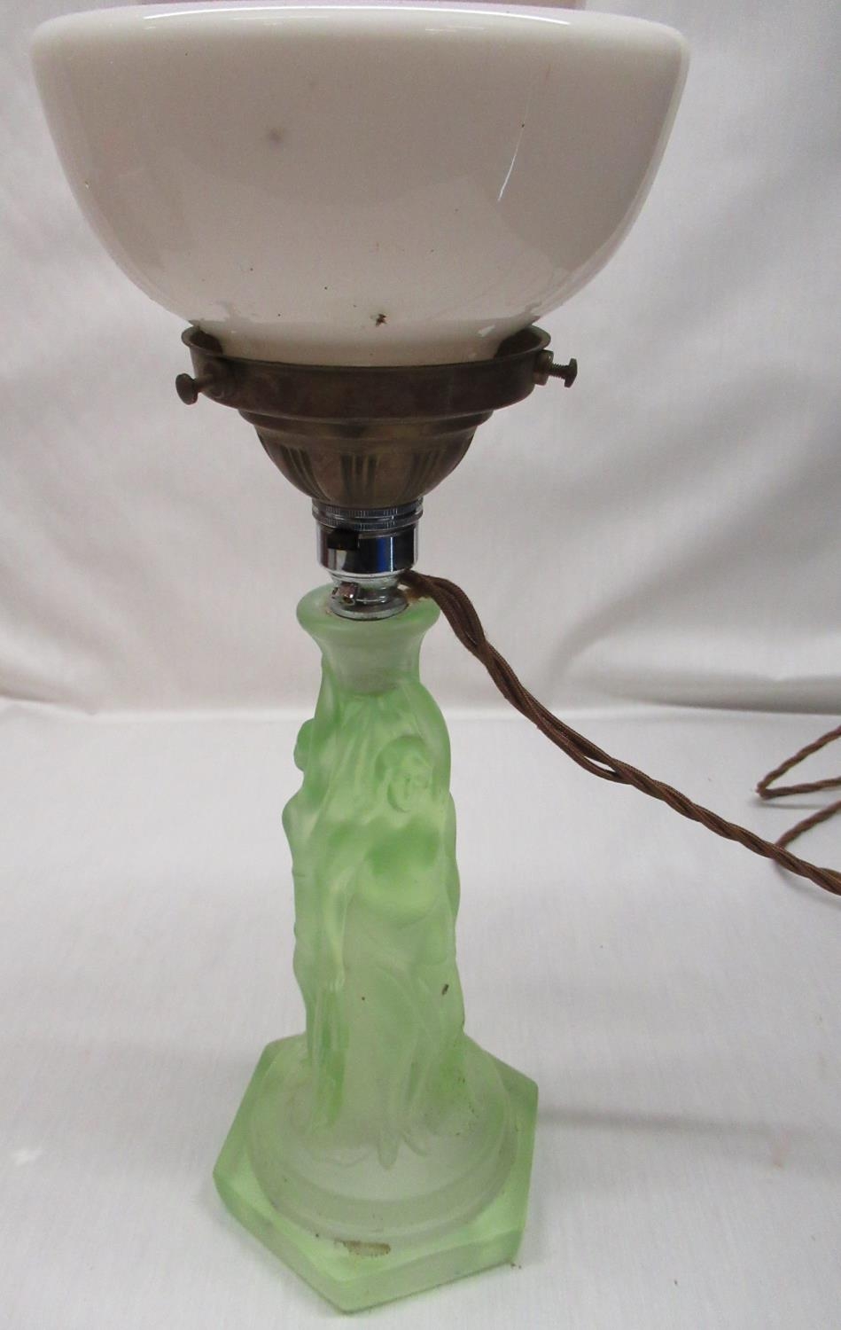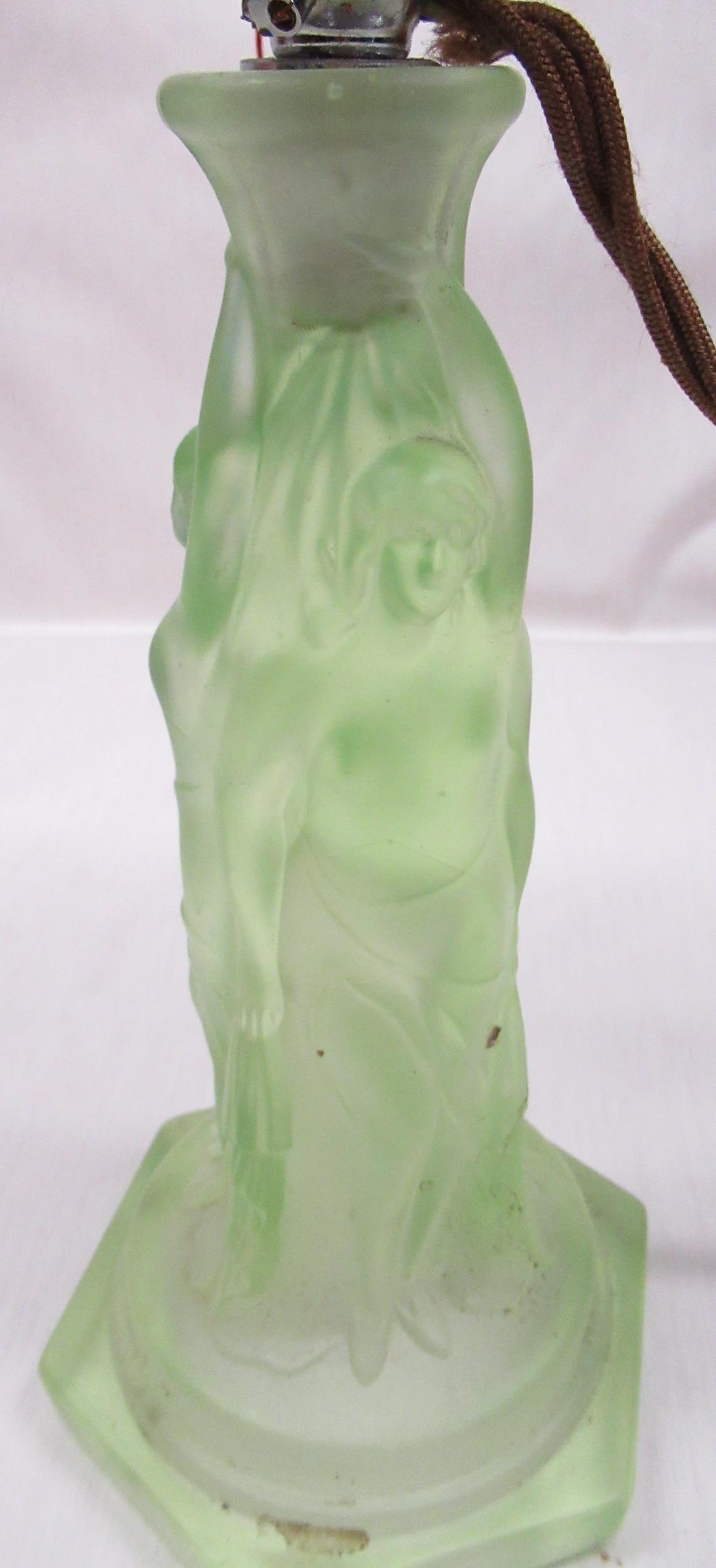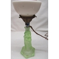 1930's uranium green moulded glass table lamp in the form of The Three Muses with stepped opaque shade, H43cm