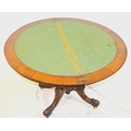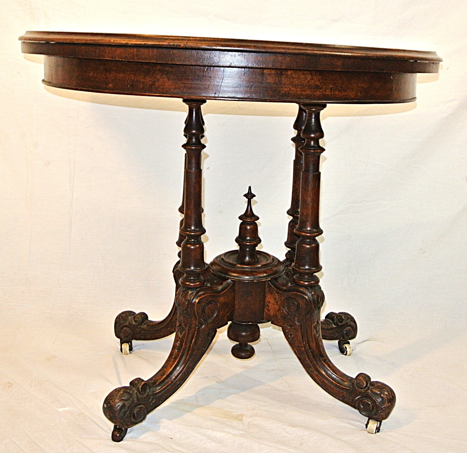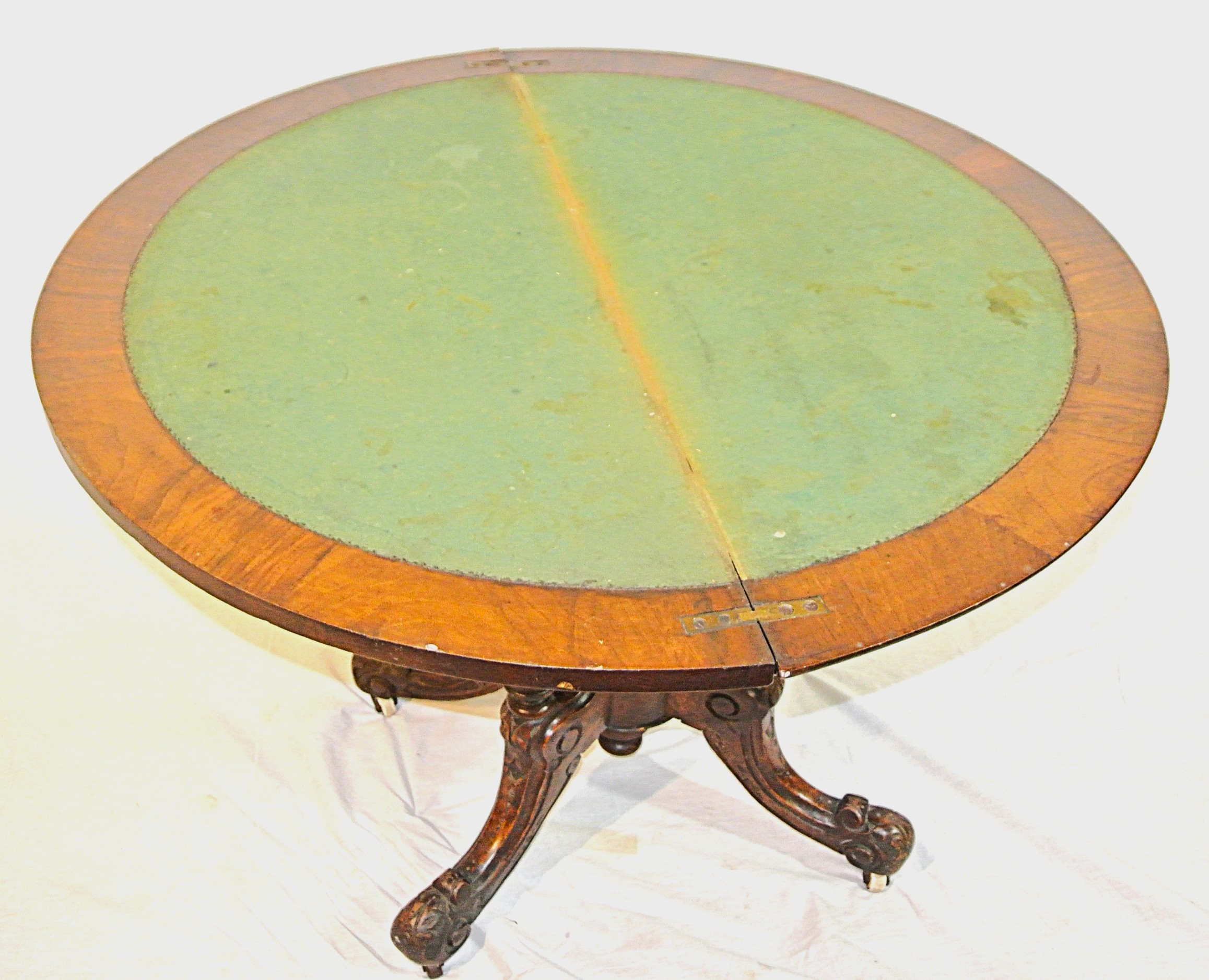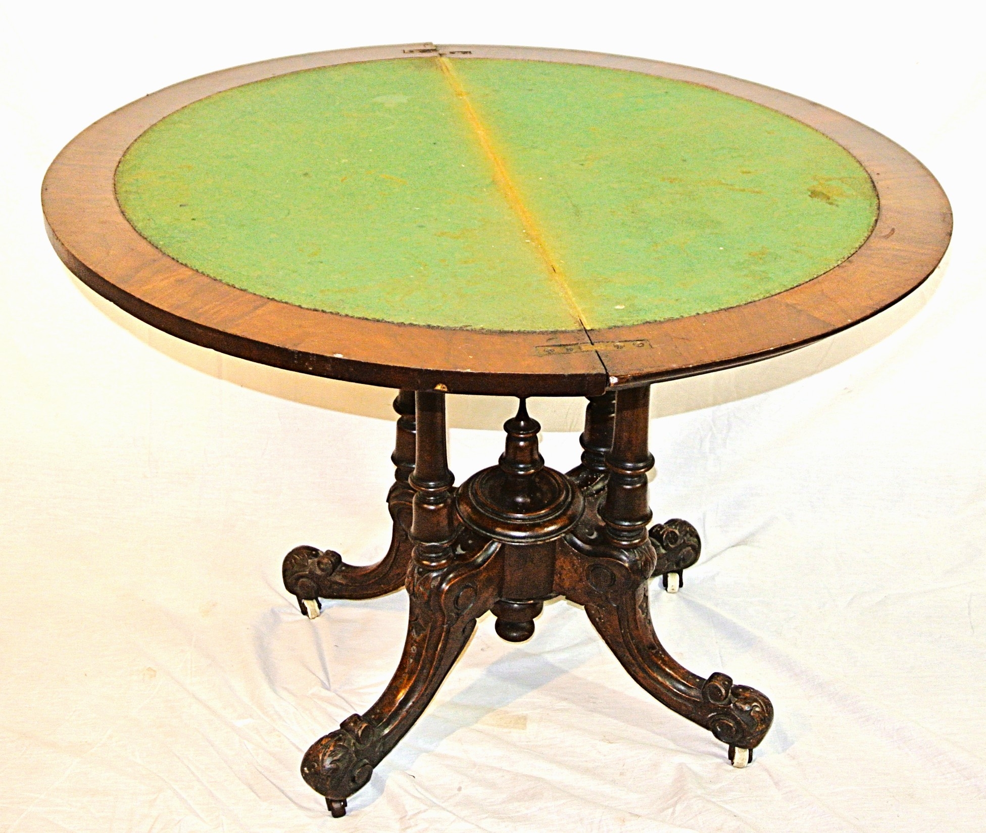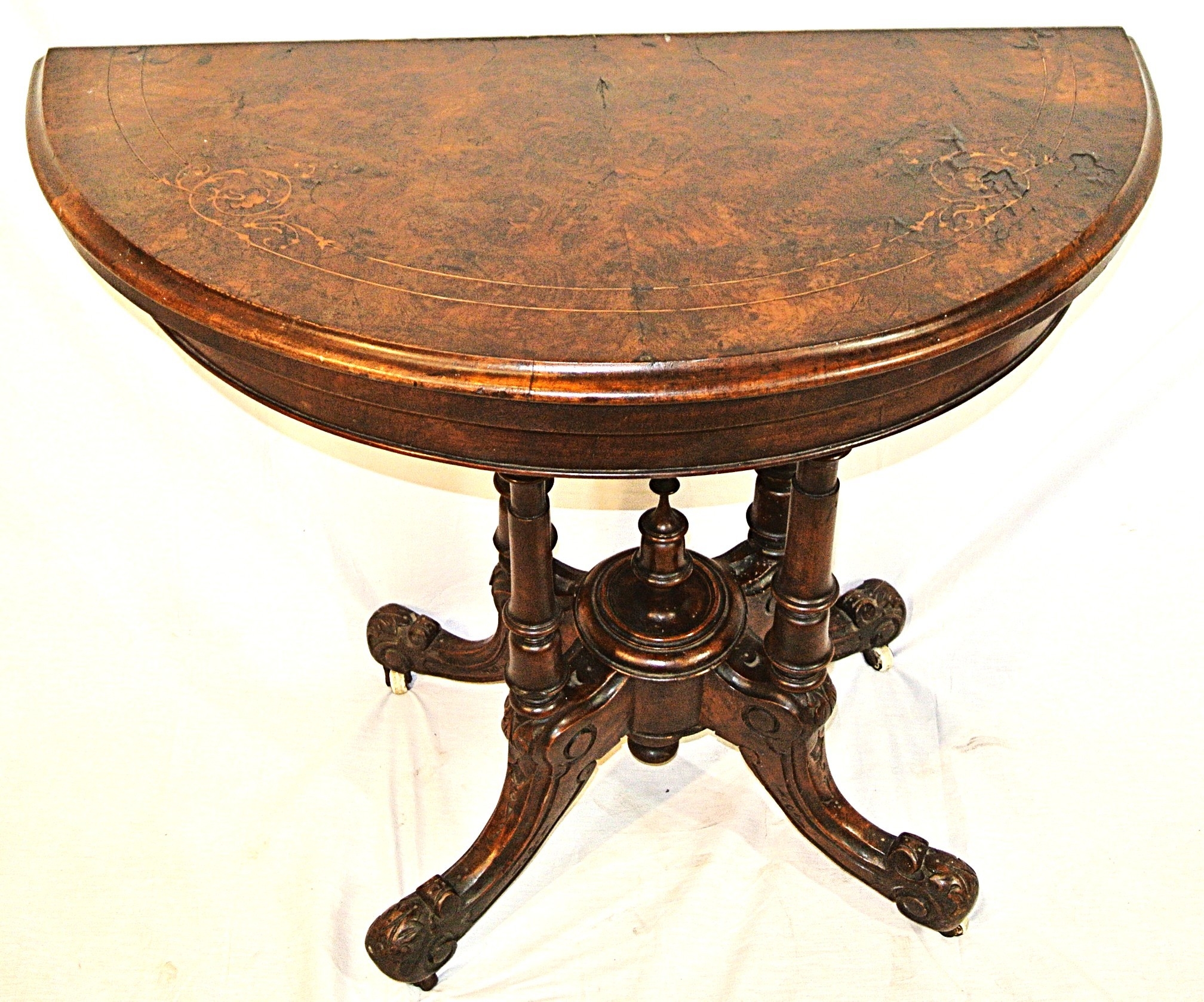 Victorian inlaid walnut demi-lune card table with swivel fold-over top, foliate inlaid, baize top, raised on quadruple turned columns, on splayed quadrapod with scroll feet and casters