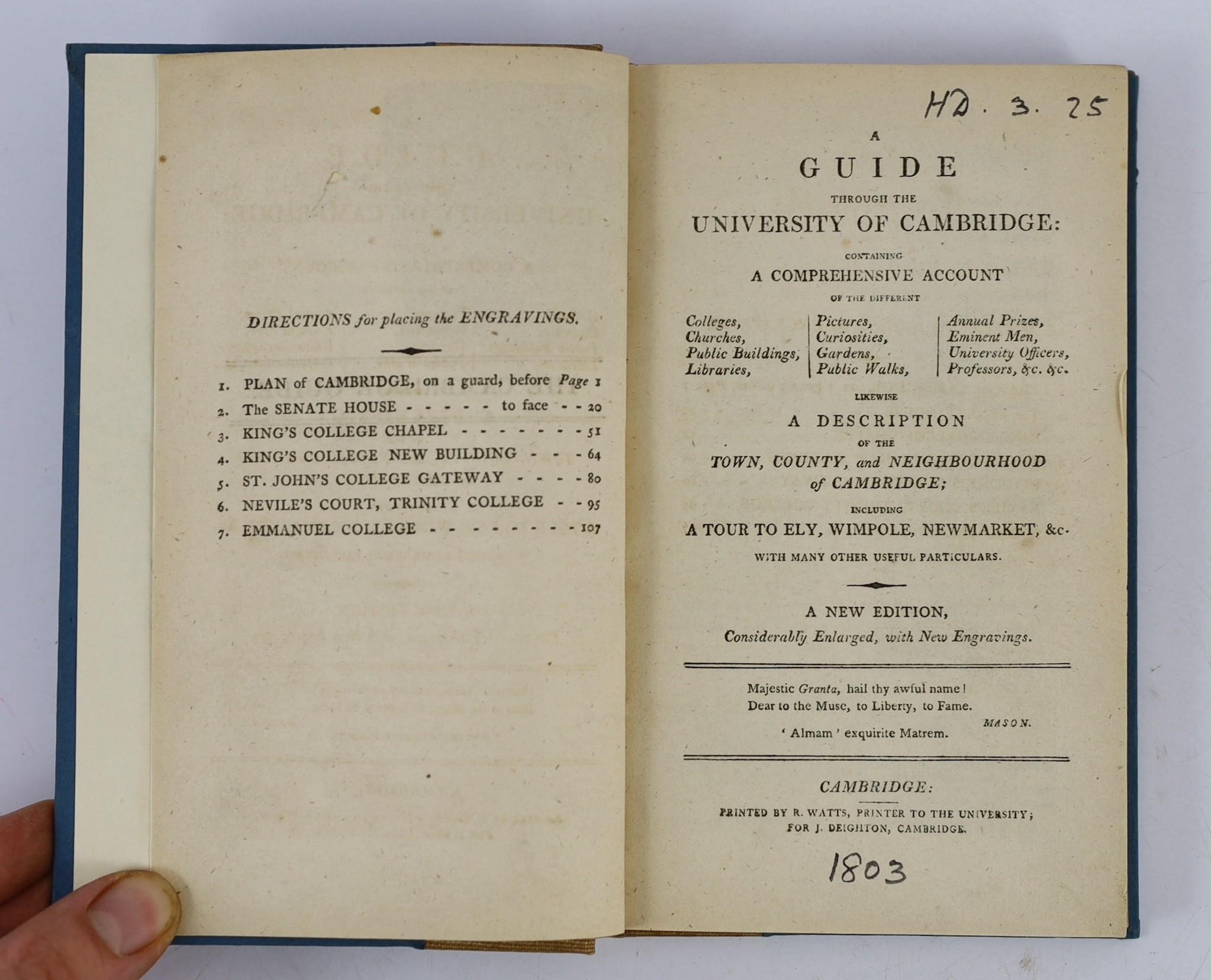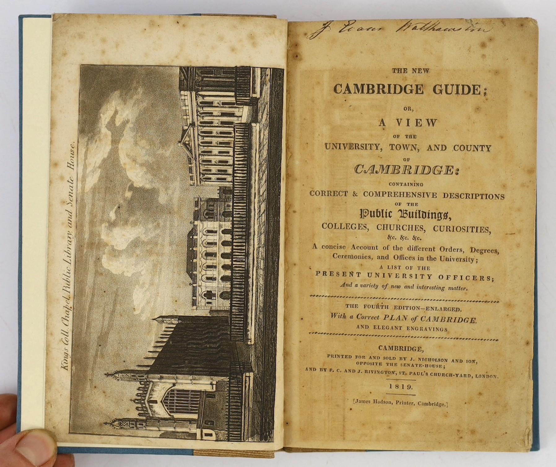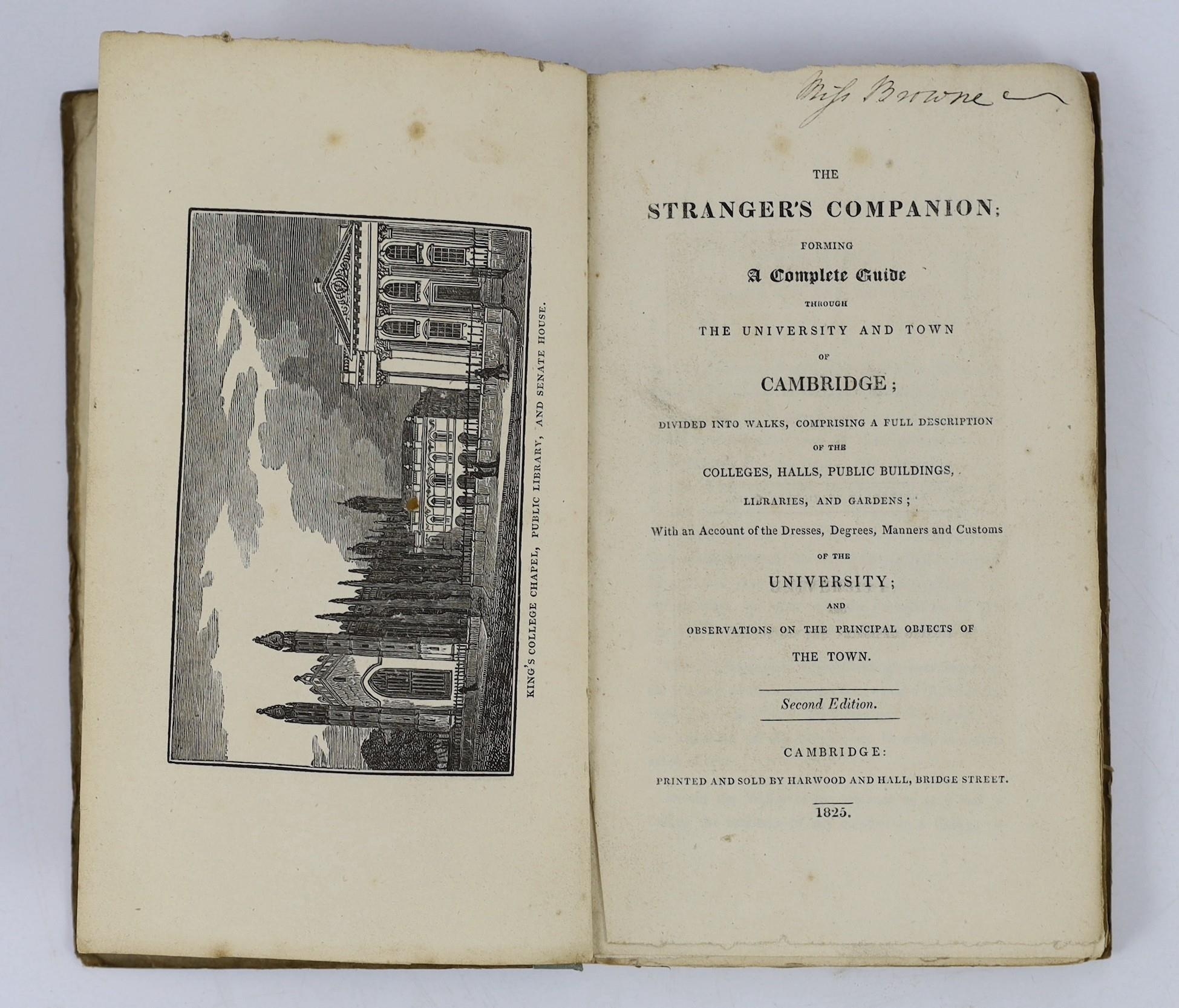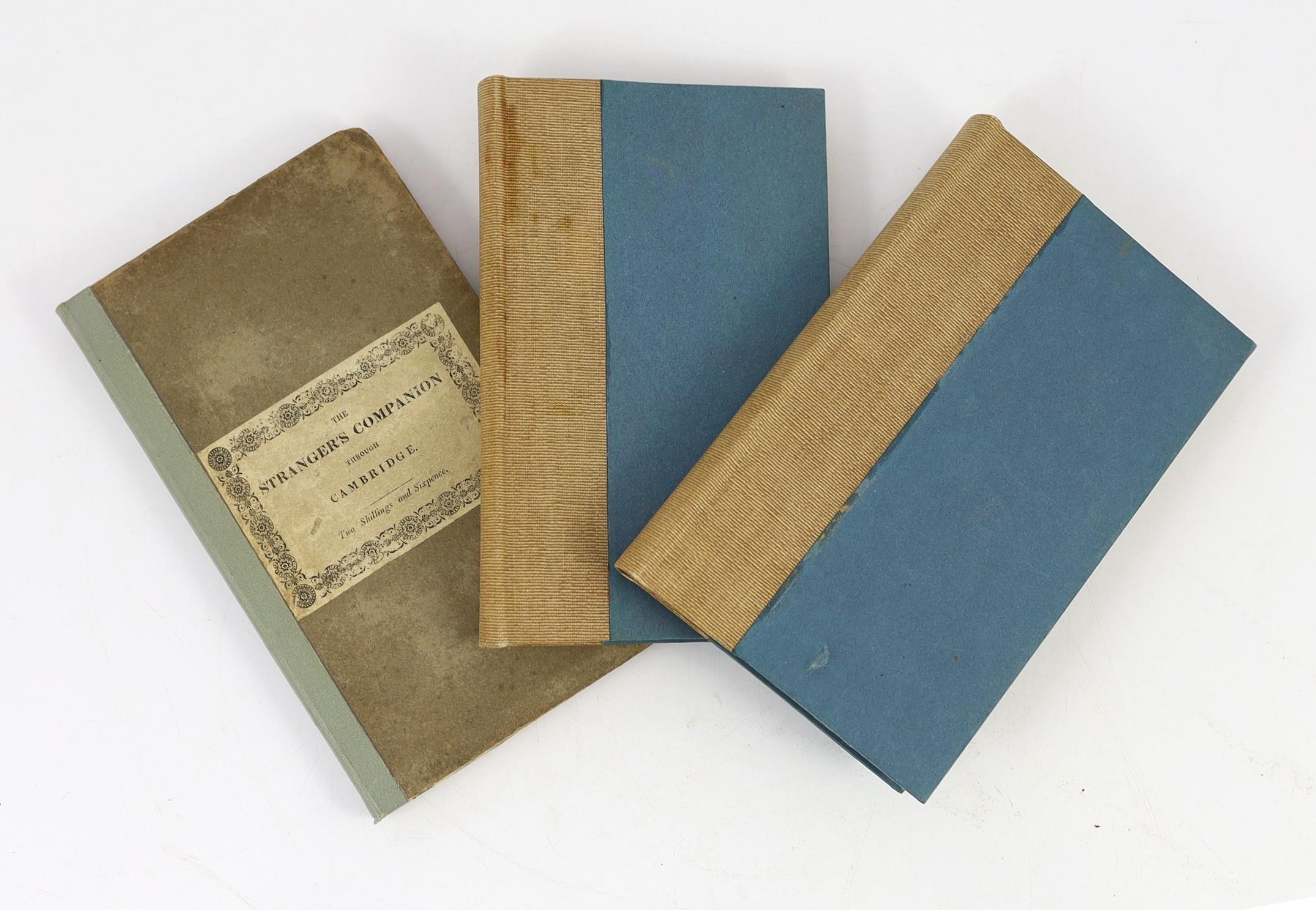 ° ° CAMBS: The Stranger's Companion: forming a complete guide through the University and Town of Cambridge ... 2nd edition (revised). folded plan and engraved illus.; original paper boards and printed label (later fabric spine), uncut. Cambridge, 1825; The New Cambridge Guide; or a View of the University, Town, and County of Cambridge ... 4th edition - enlarged. folded plan and 3 plates; rebound cloth-backed paper boards, 12mo. Cambridge, 1819; A Guide through the University of Cambridge ... likewise a Description of the Town, County, and Neighbourhood ... including a Tour to Ely, Wimpole, Newmarket ... new edition, considerably enlarged. d-page plan and 6 plates; rebound cloth backed paper boards, 12mo. Cambridge, (1803) (3)