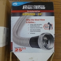 An Amazon multi-purpose waterproof poly tarp cover and a flex steel 25 ft hose, boxed