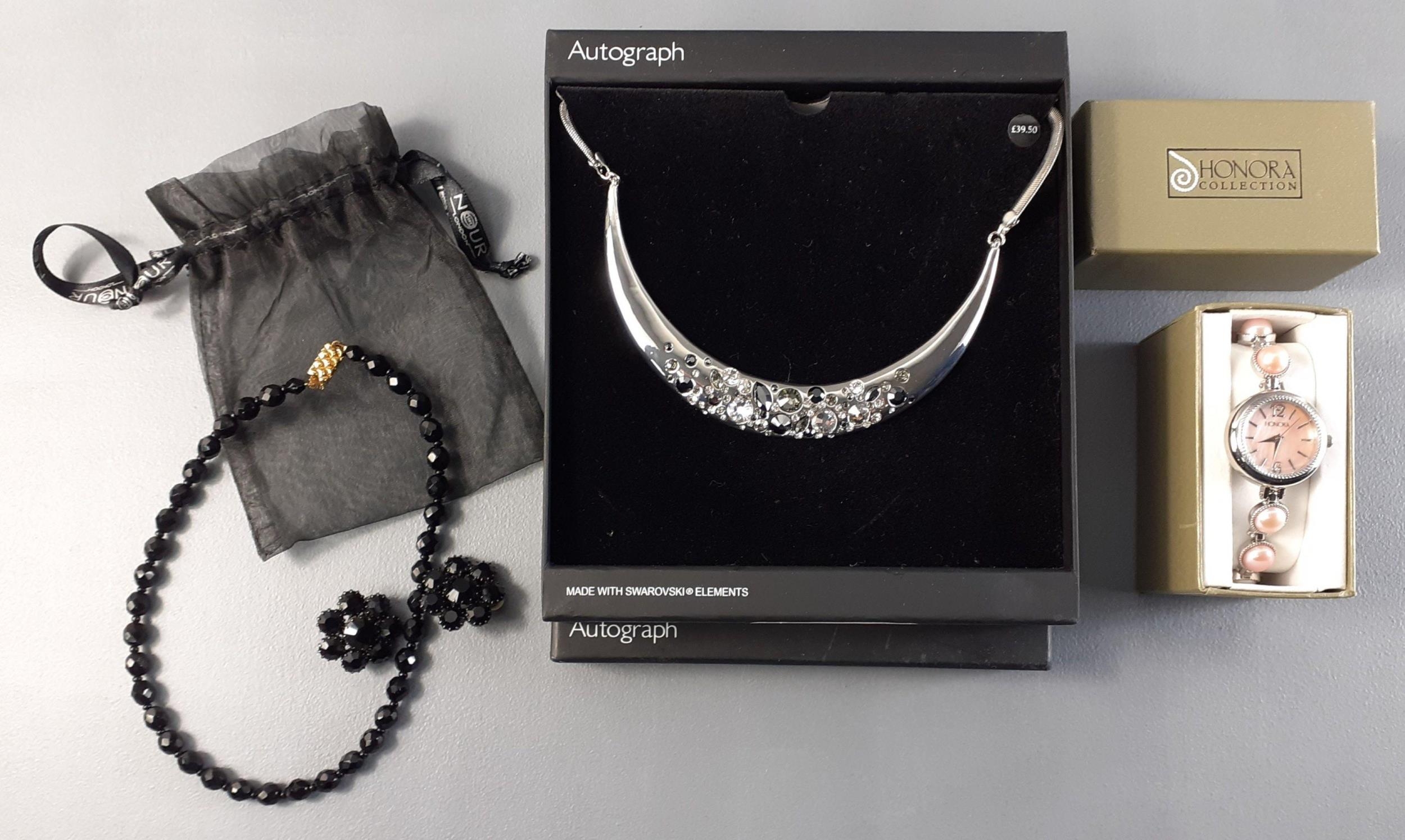 A boxed ladies HONORA watch plus a boxed AUTOGRAPH silver gilt torc set with Swarovski elements and an M&S black beaded necklace with clip-on earrings
