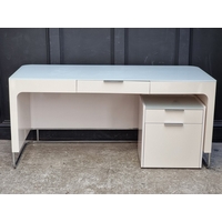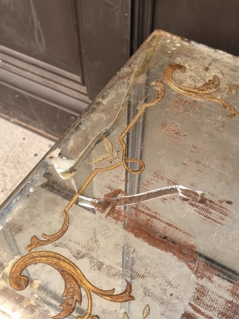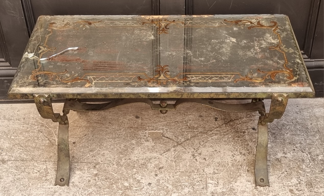 A vintage Italian verdigris metal and reverse glass painted rectangular low occasional table, 43cm high x 90.5cm wide, (glass top cracked).