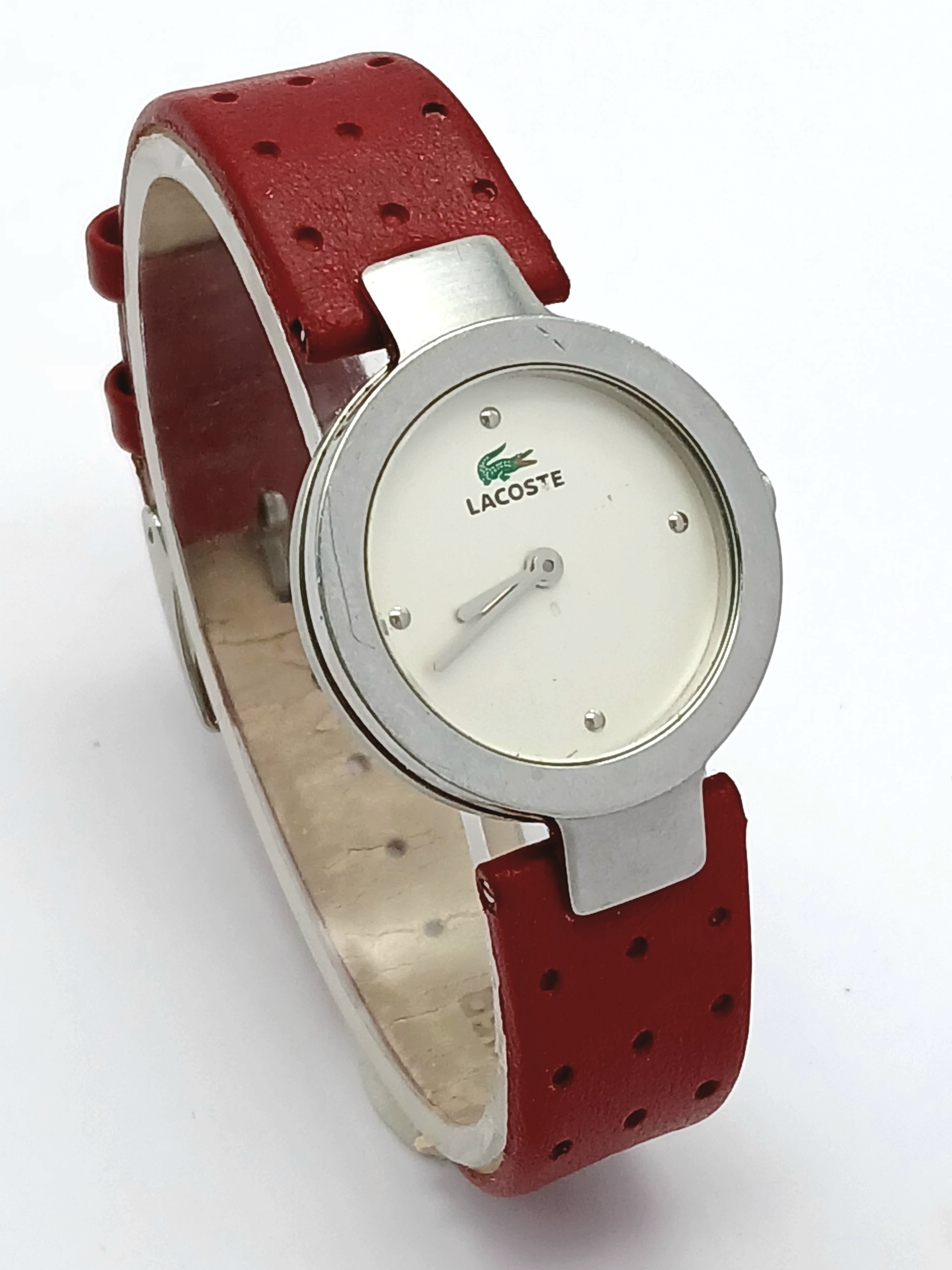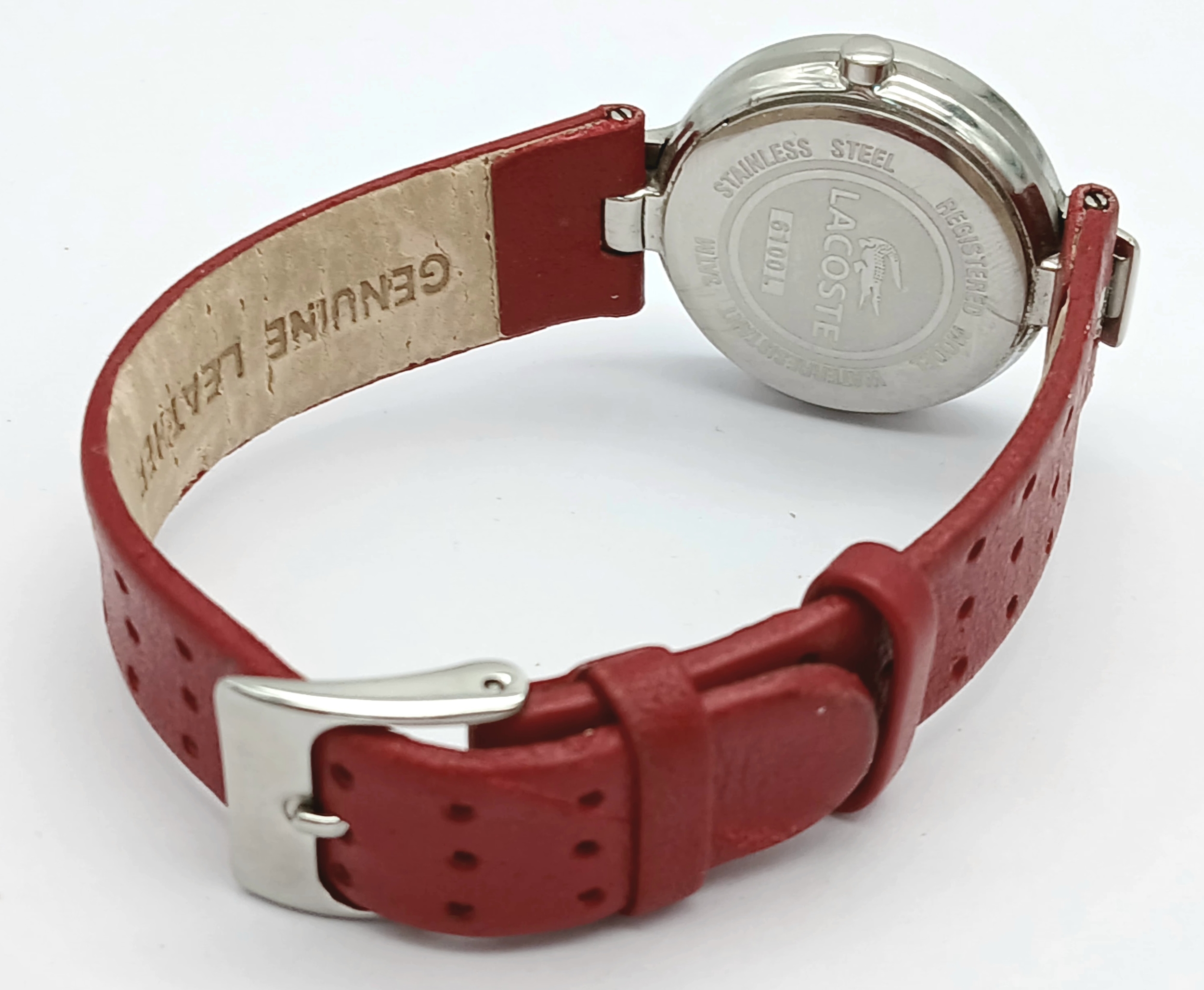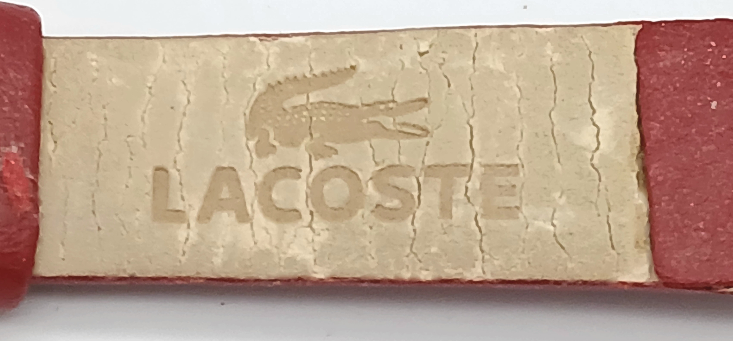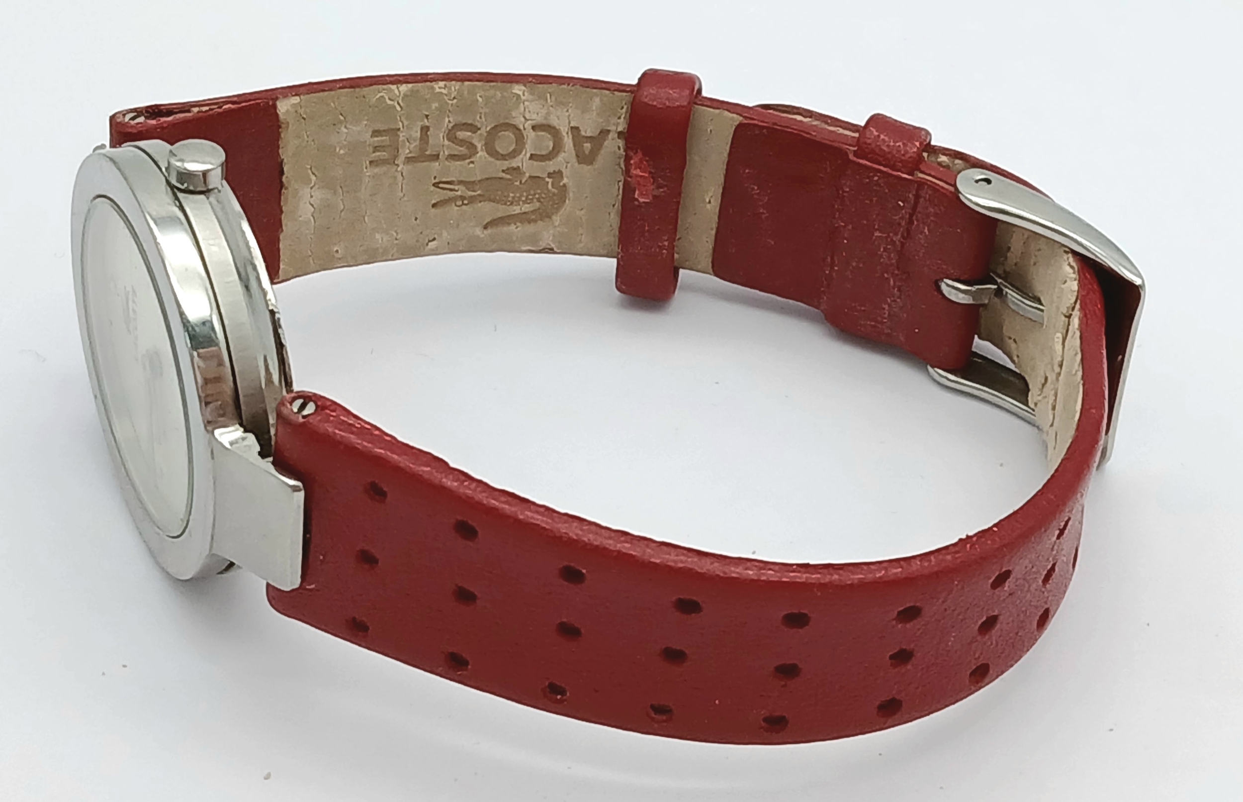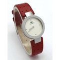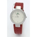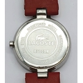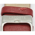 A LACOSTE, RED LEATHER STRAP WATCH. ORIGINAL STRAP AND BUCKLE. IN FULL WORKING ORDER. NEW BATTERY FITTED RECENTLY. S/A 1549 - 1