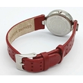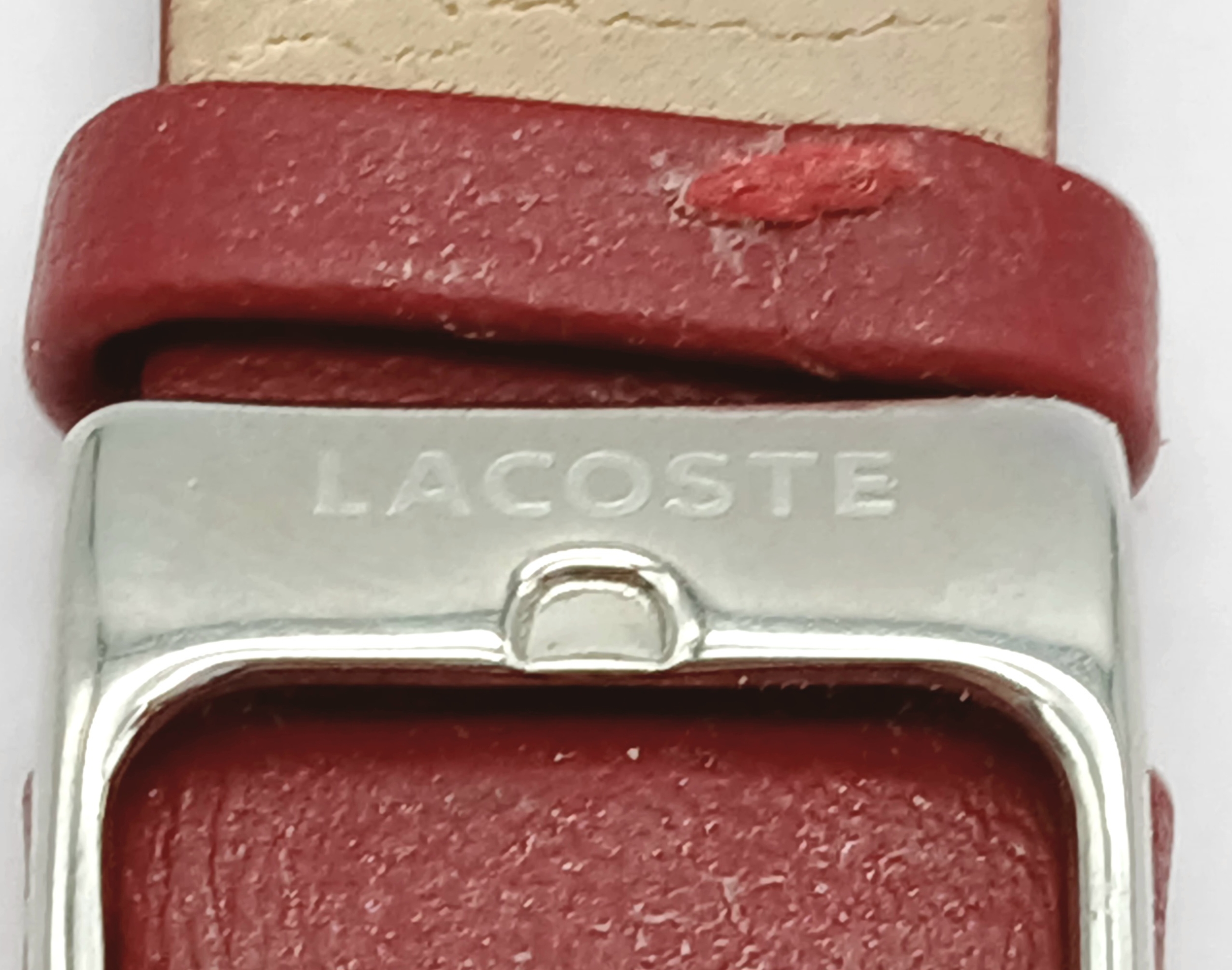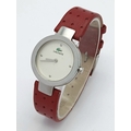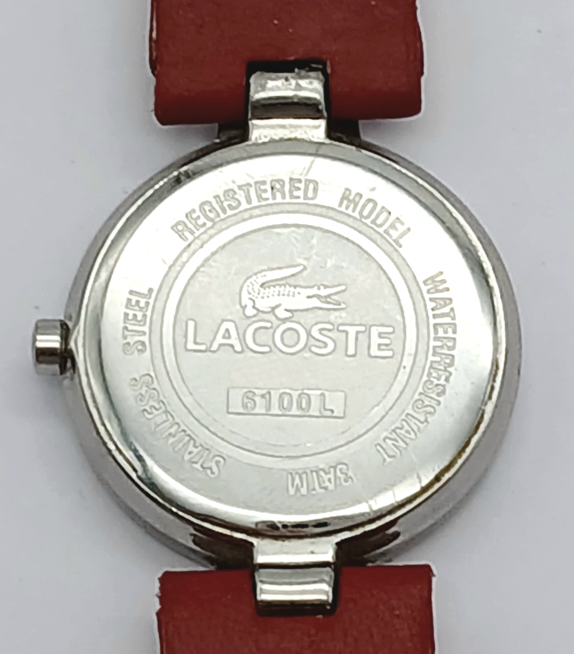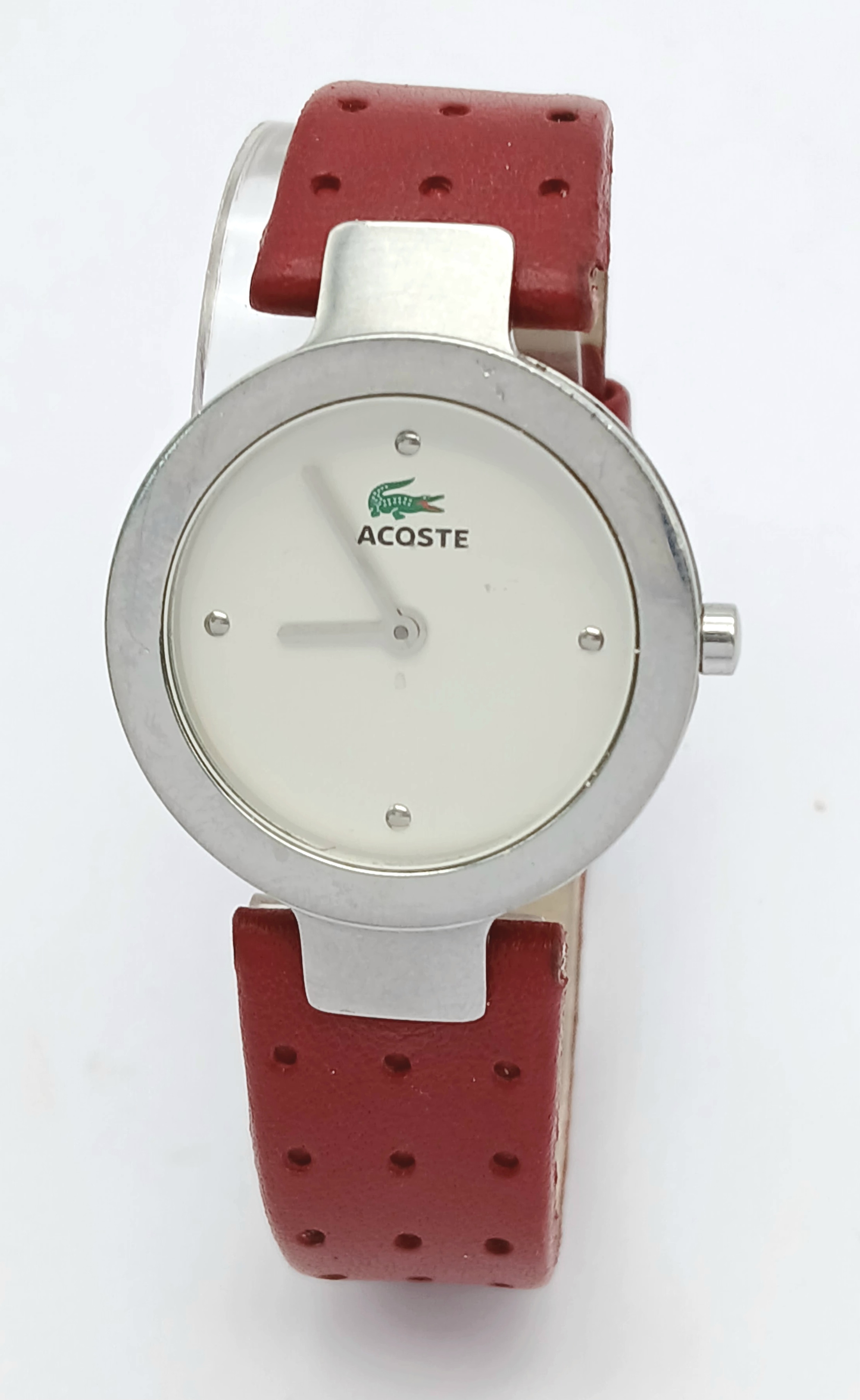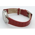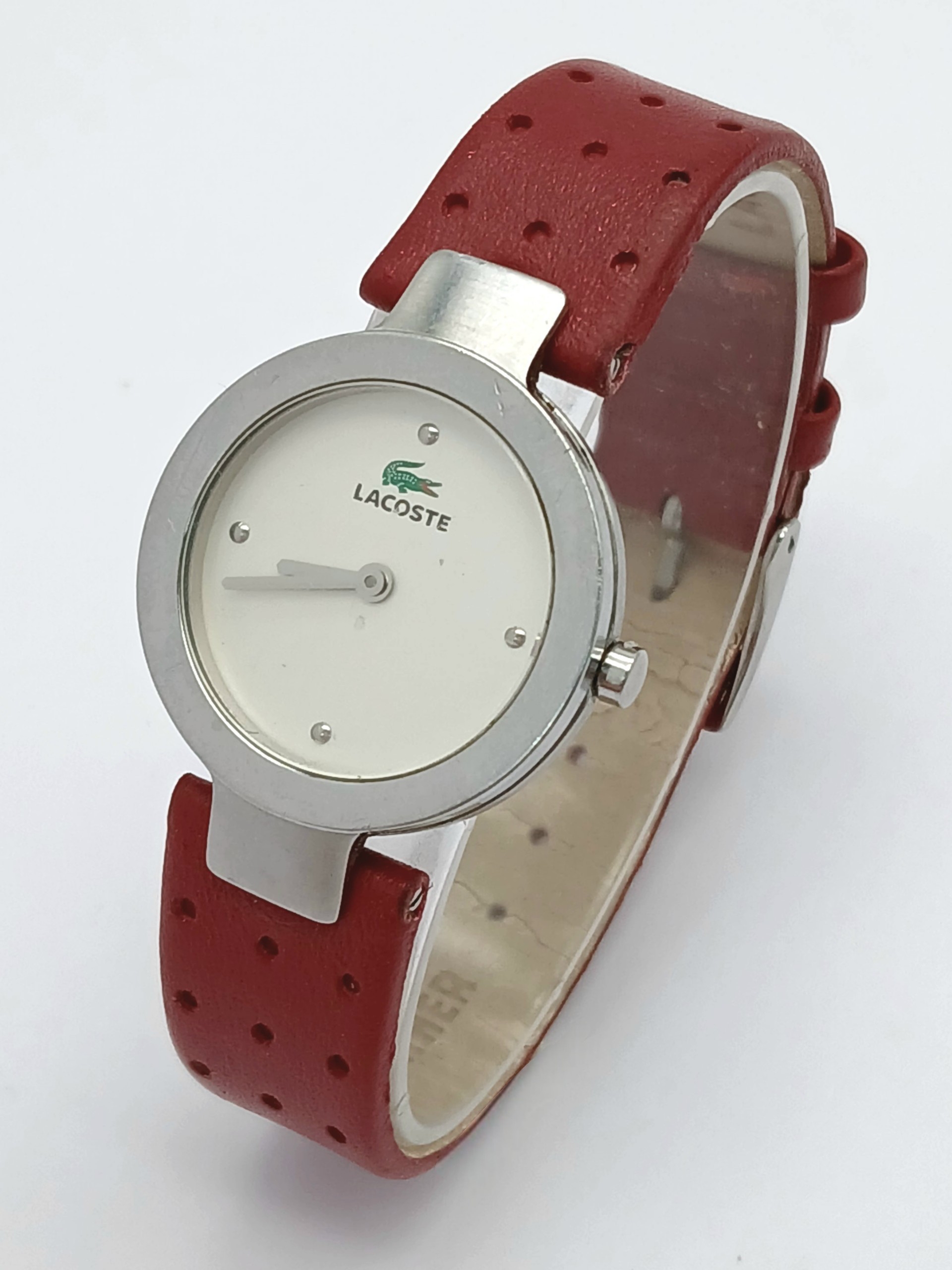 A LACOSTE, RED LEATHER STRAP WATCH. ORIGINAL STRAP AND BUCKLE. IN FULL WORKING ORDER. NEW BATTERY FITTED RECENTLY. S/A 1549 - 1