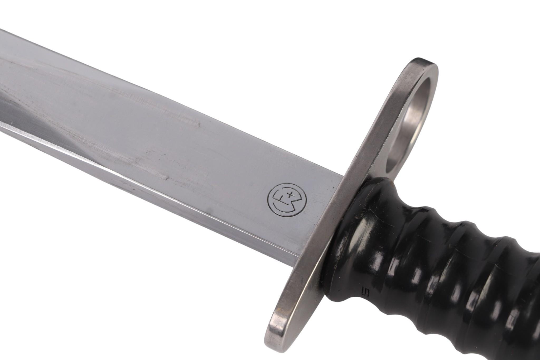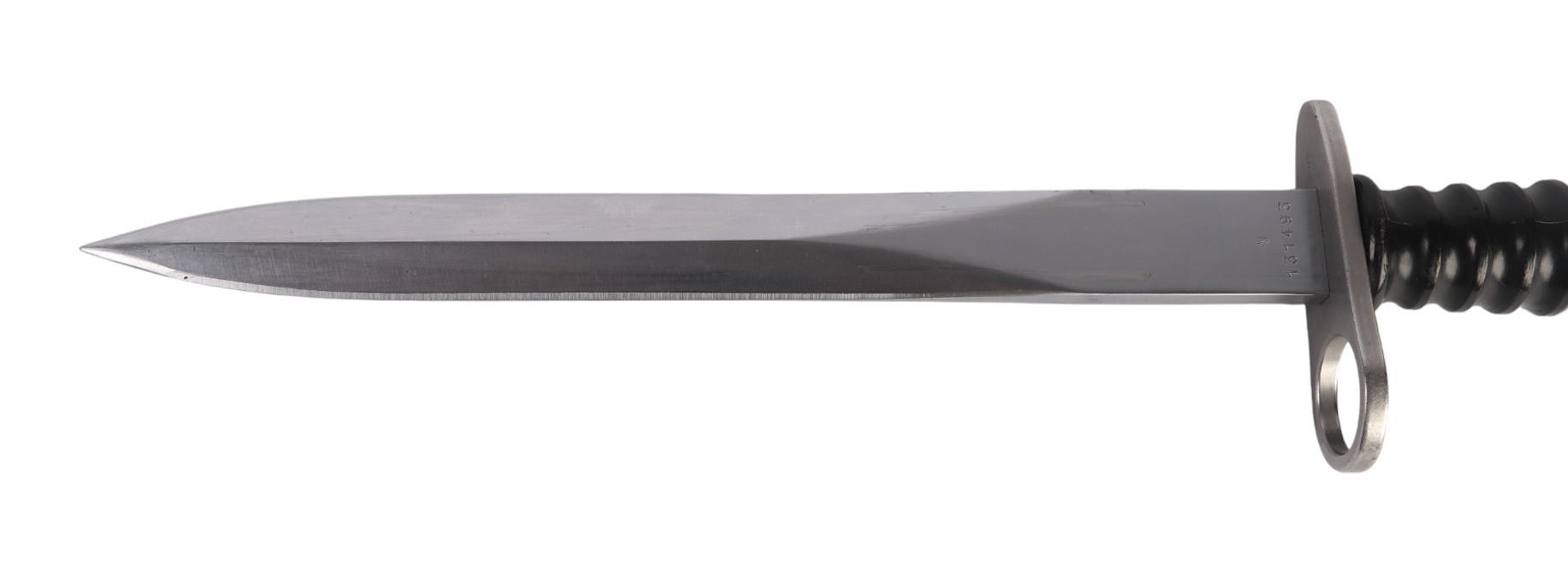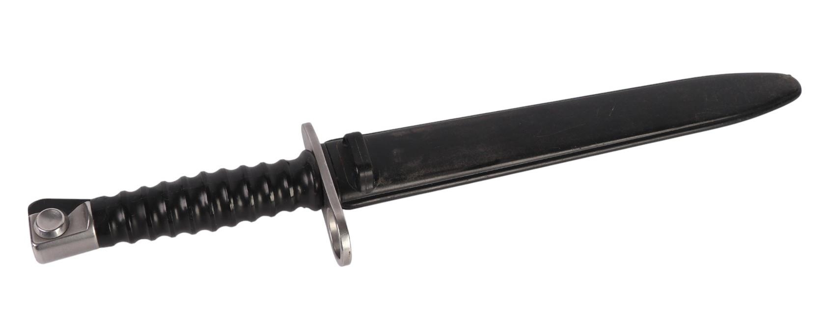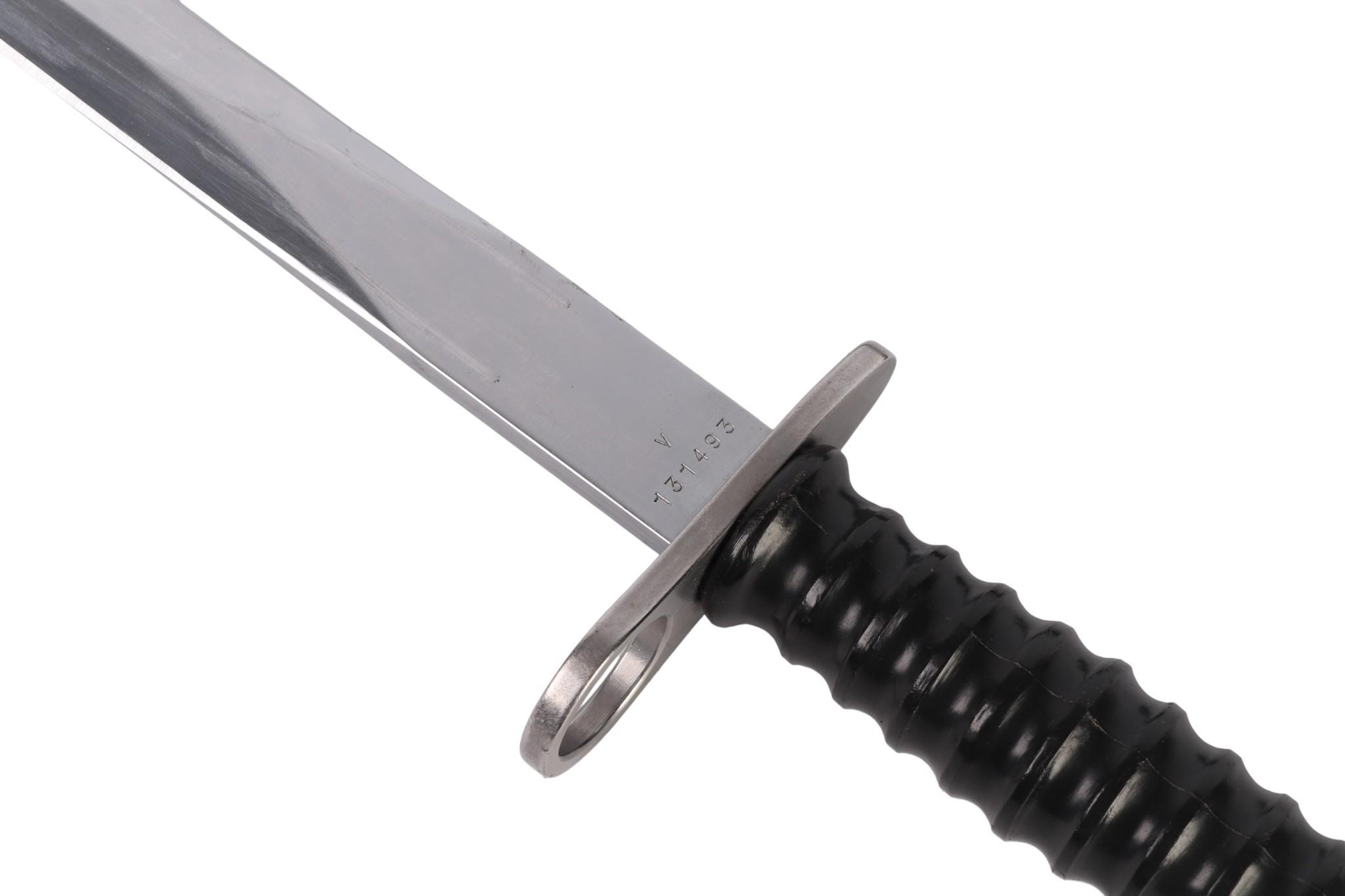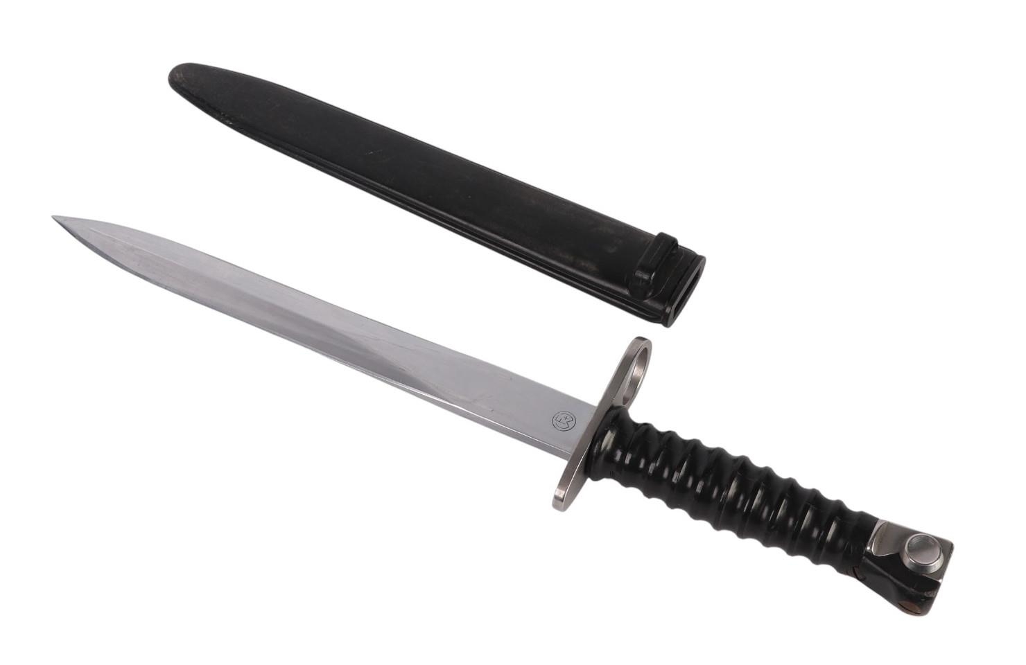 A Swiss SIG model 1957 bayonet in its composition scabbard. Serial No. V131493. Makers mark FW (for the Waffenfabrik Bern). Blade length 24cms.