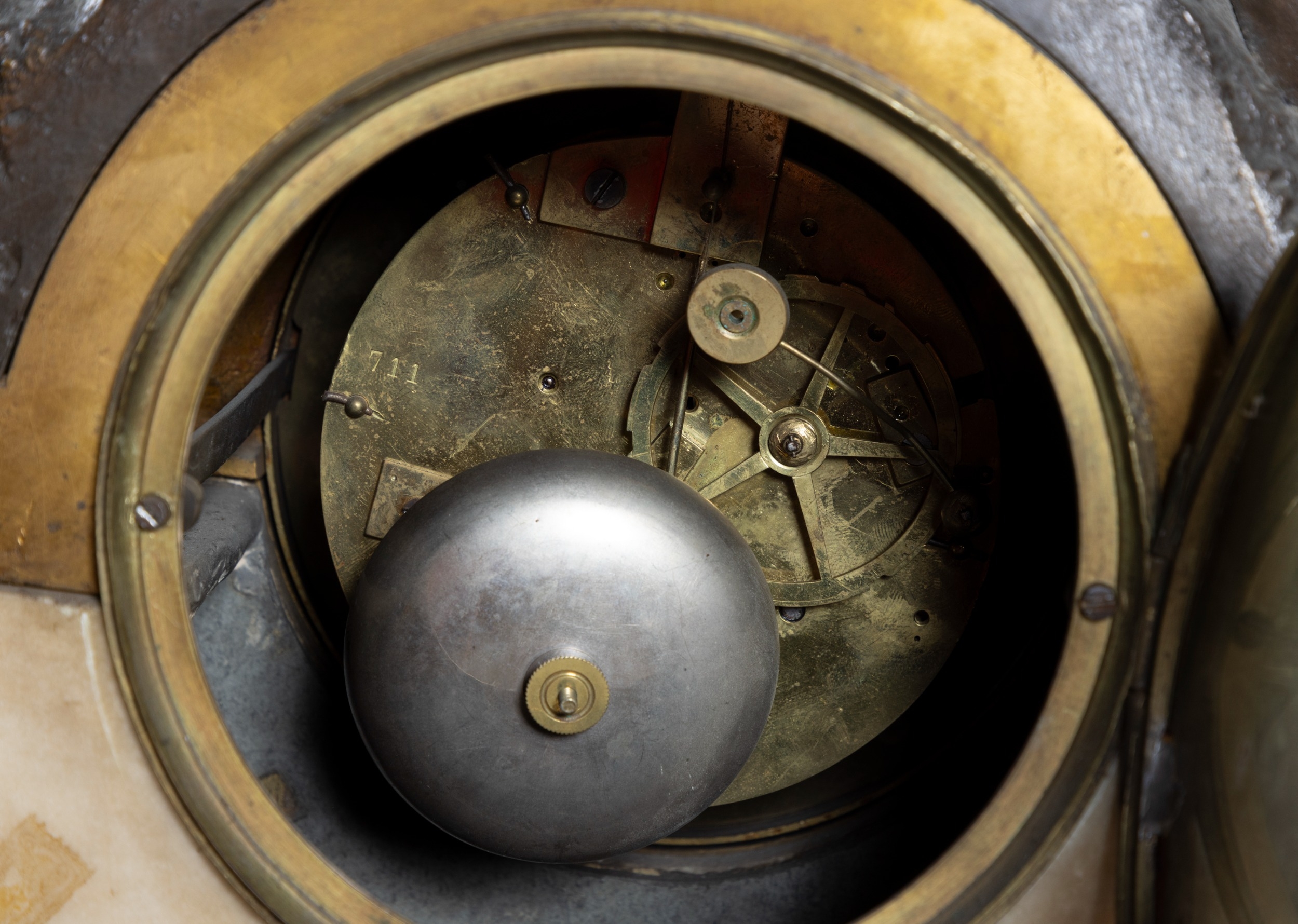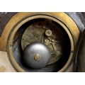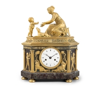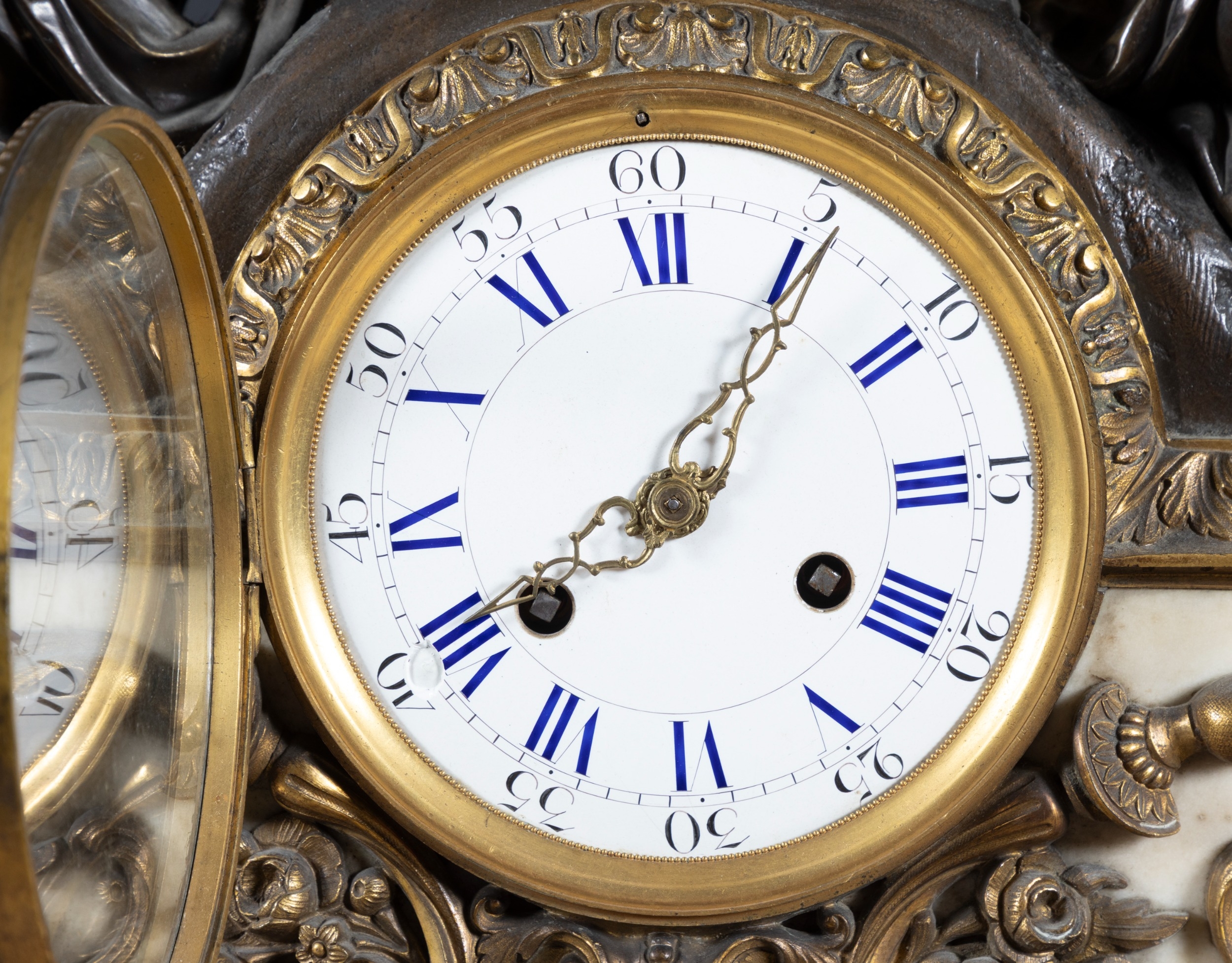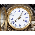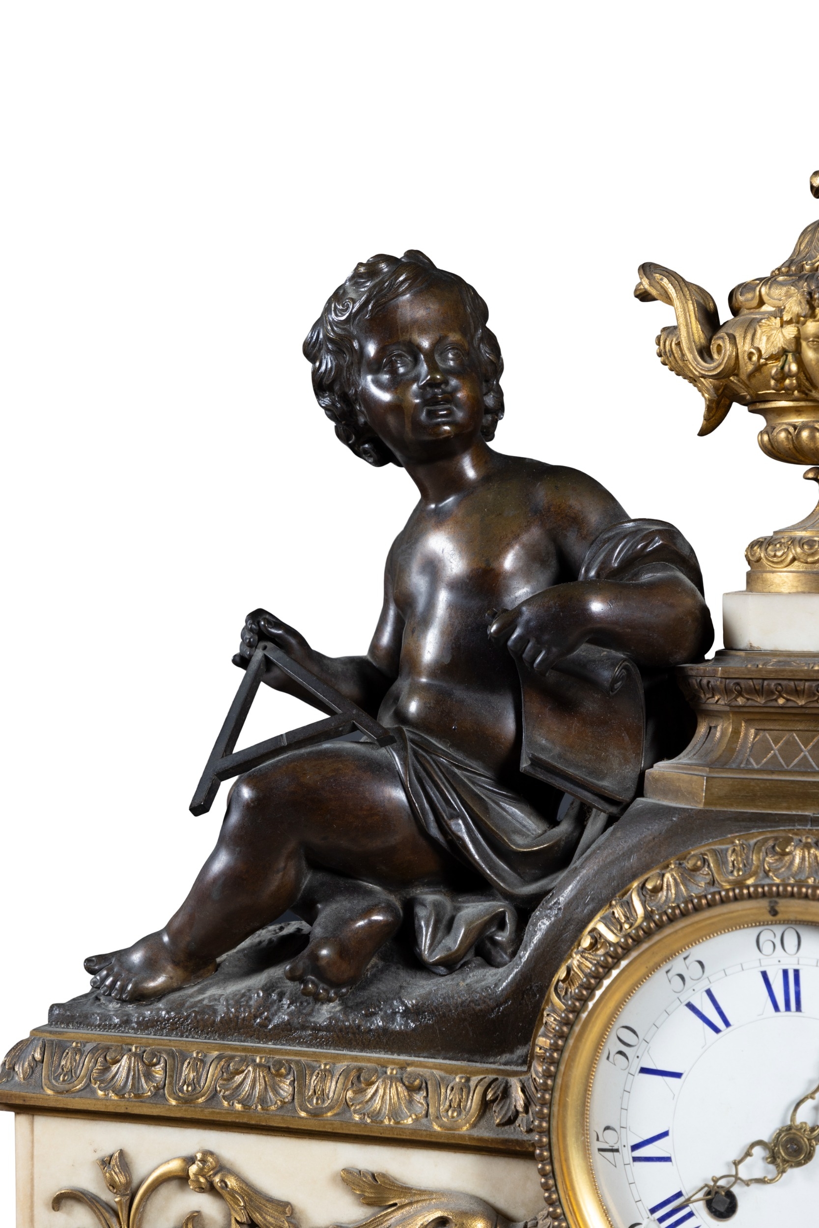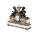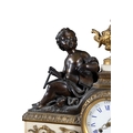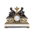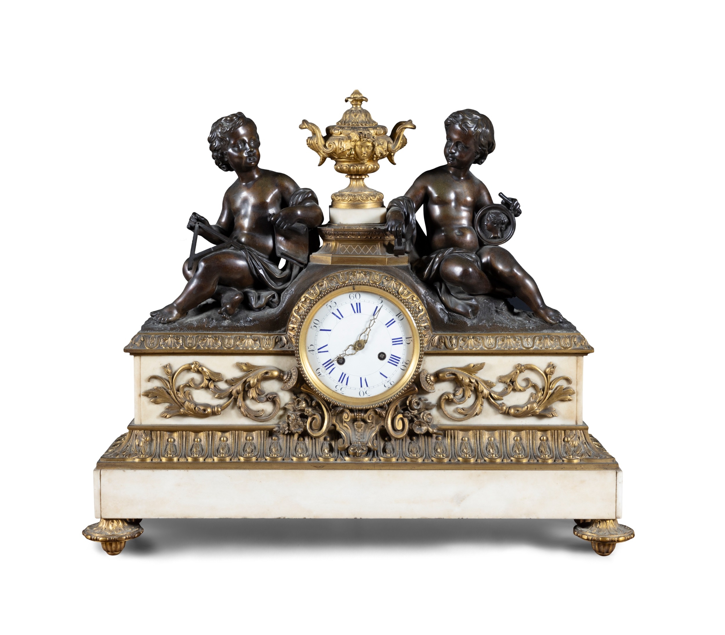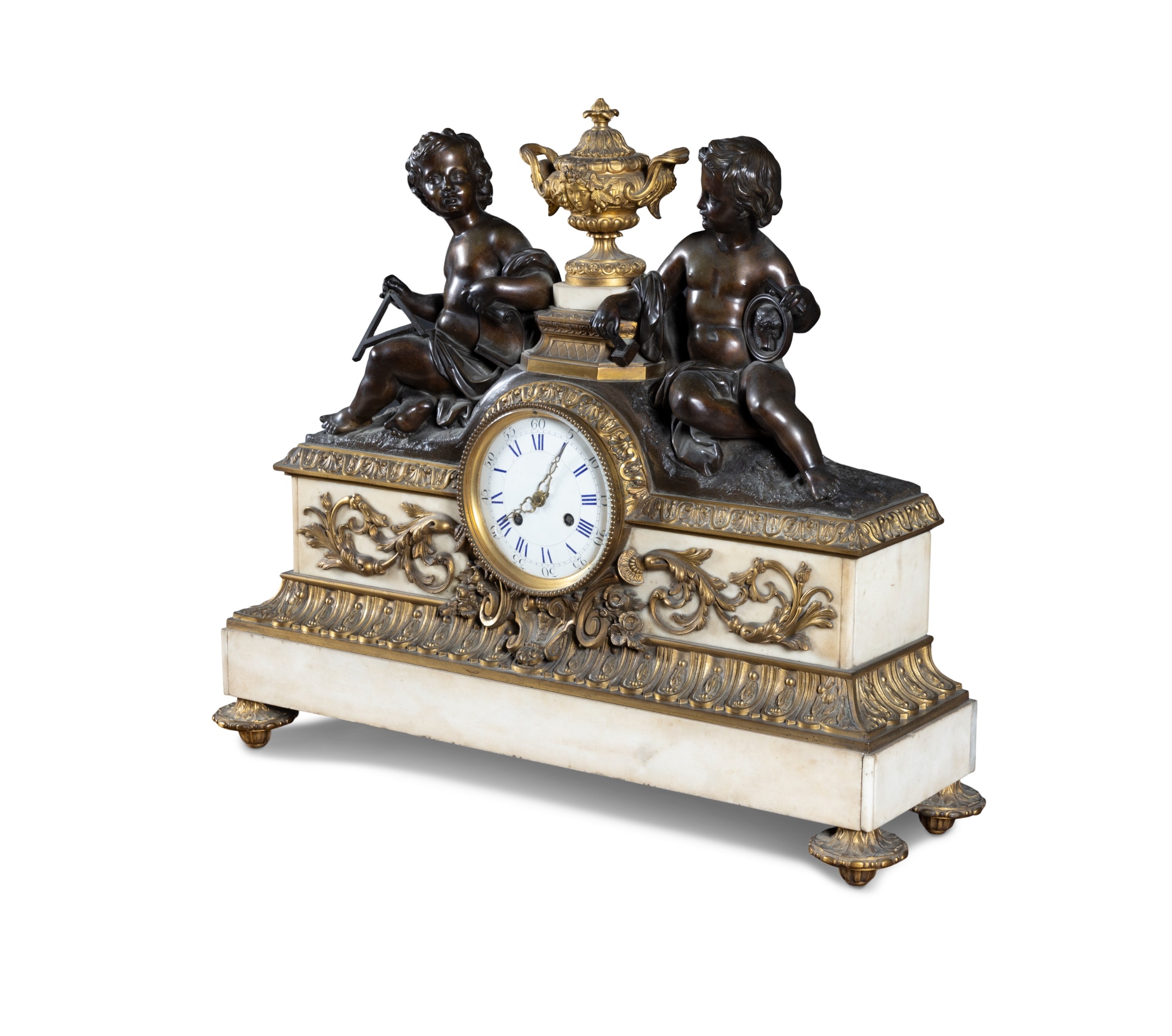 A FRENCH FIGURAL BRONZE MANTEL CLOCK, 19TH CENTURY, surmounted by twin bronze putti with various trophies representing Education centred by a gilt metal urn above a Roman and Arabic numeral painted enamel dial with brass ormolu mounts on a white marble base, with key and pendulum, 57cm high, 68cm wide, 21cm deep