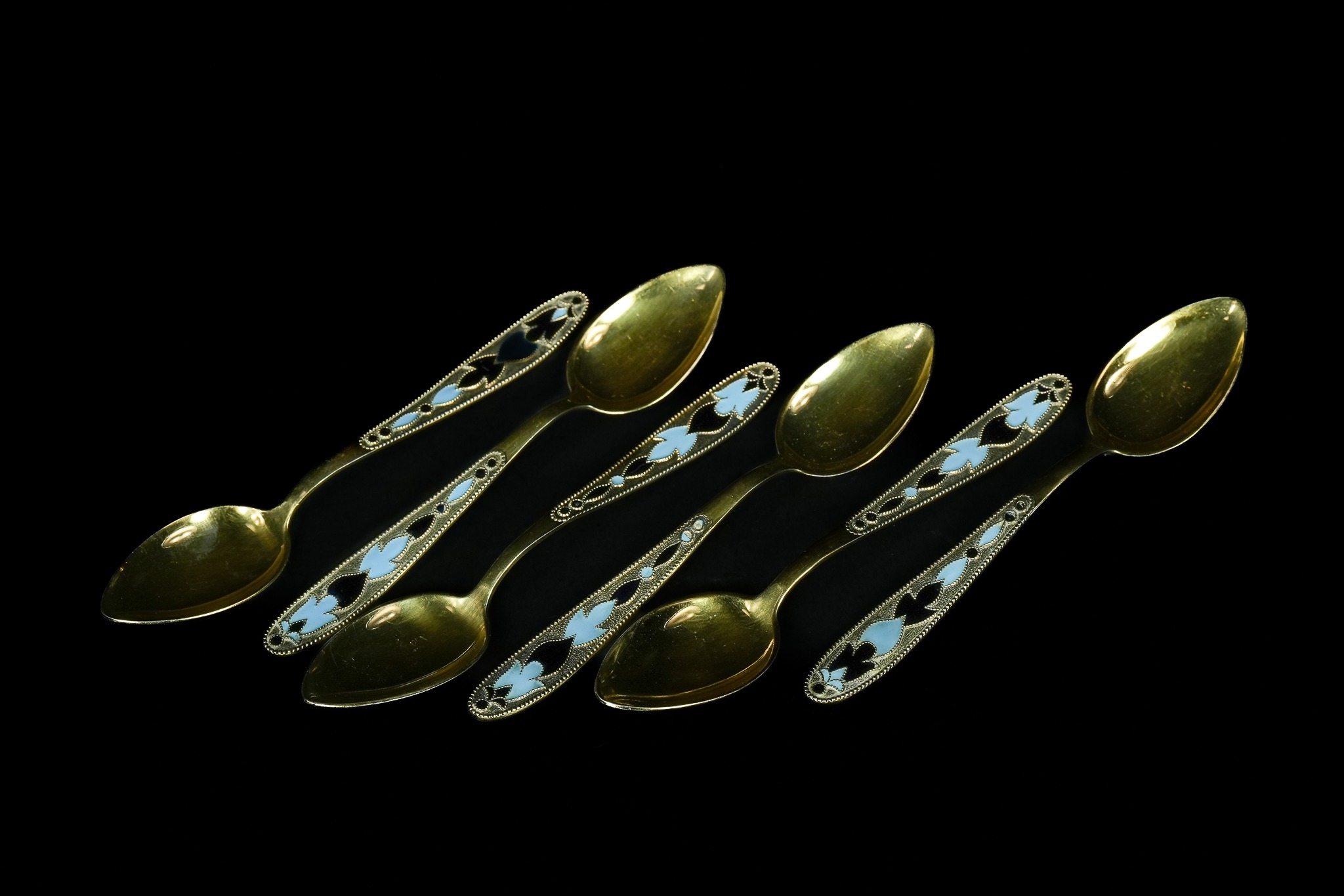 A set of six Russian Soviet gilt silver and enamel spoons. Each spoon features a gilt silver bowl and handle, with the handles intricately decorated using cloisonné enamel work. The enamel displays a repeating pattern of stylized foliate or floral motifs in alternating segments of light blue and dark blue/black enamel, bordered by fine granular or beaded detailing. These are likely tea or demitasse spoons.
