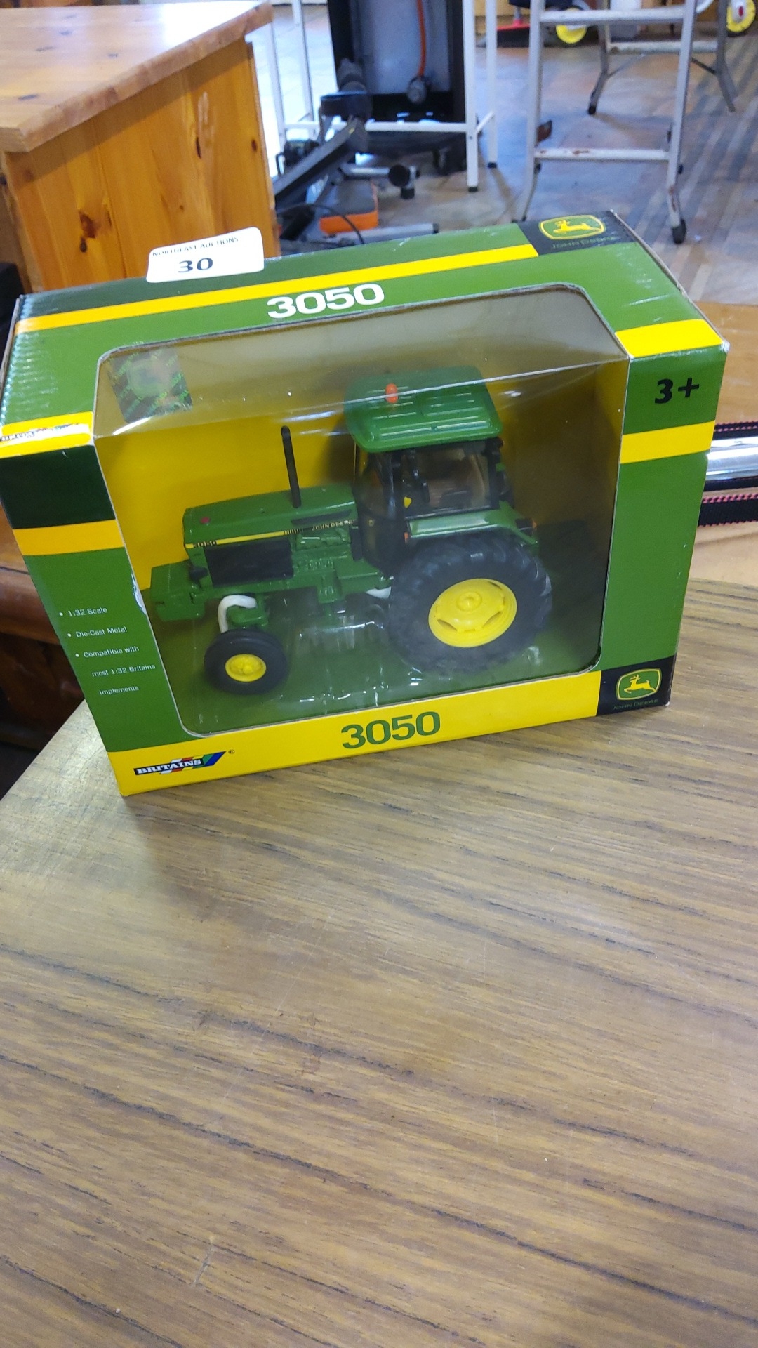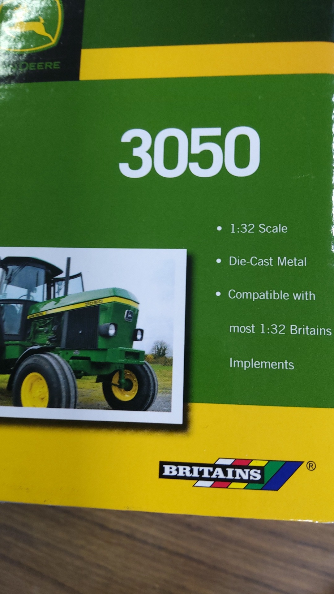 A boxed John Deere 3050 tractor model by Britains, 1:32 scale die-cast metal, in green and yellow livery; stated compatible with most 1:32 Britains implements.