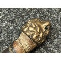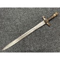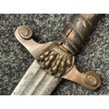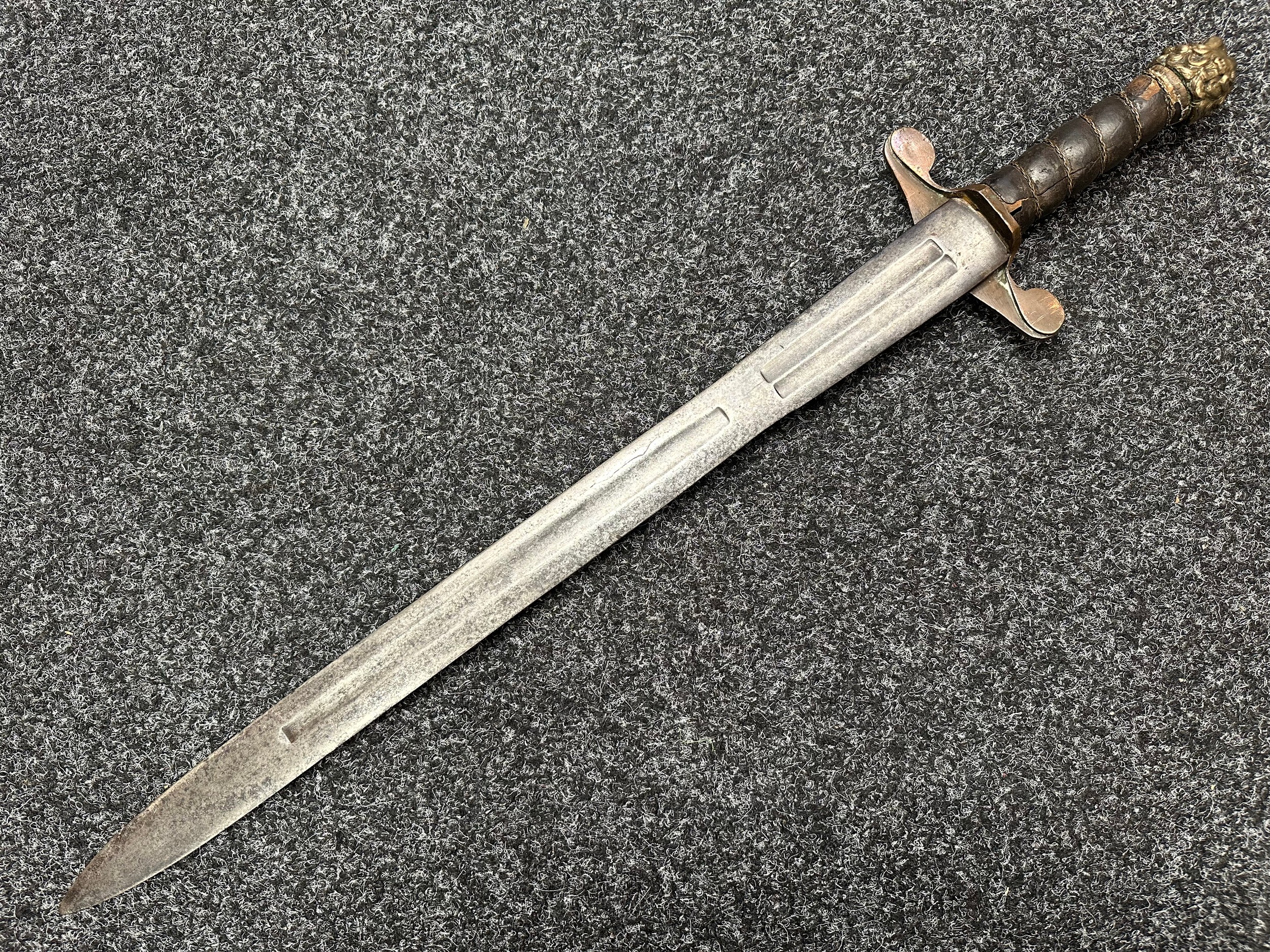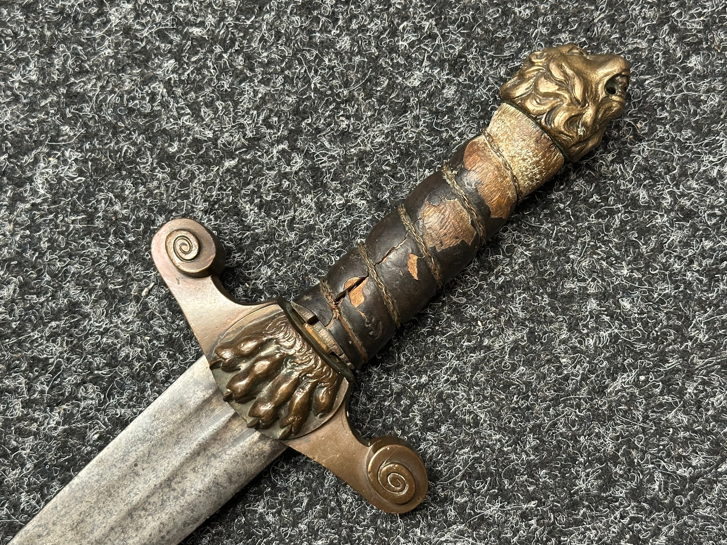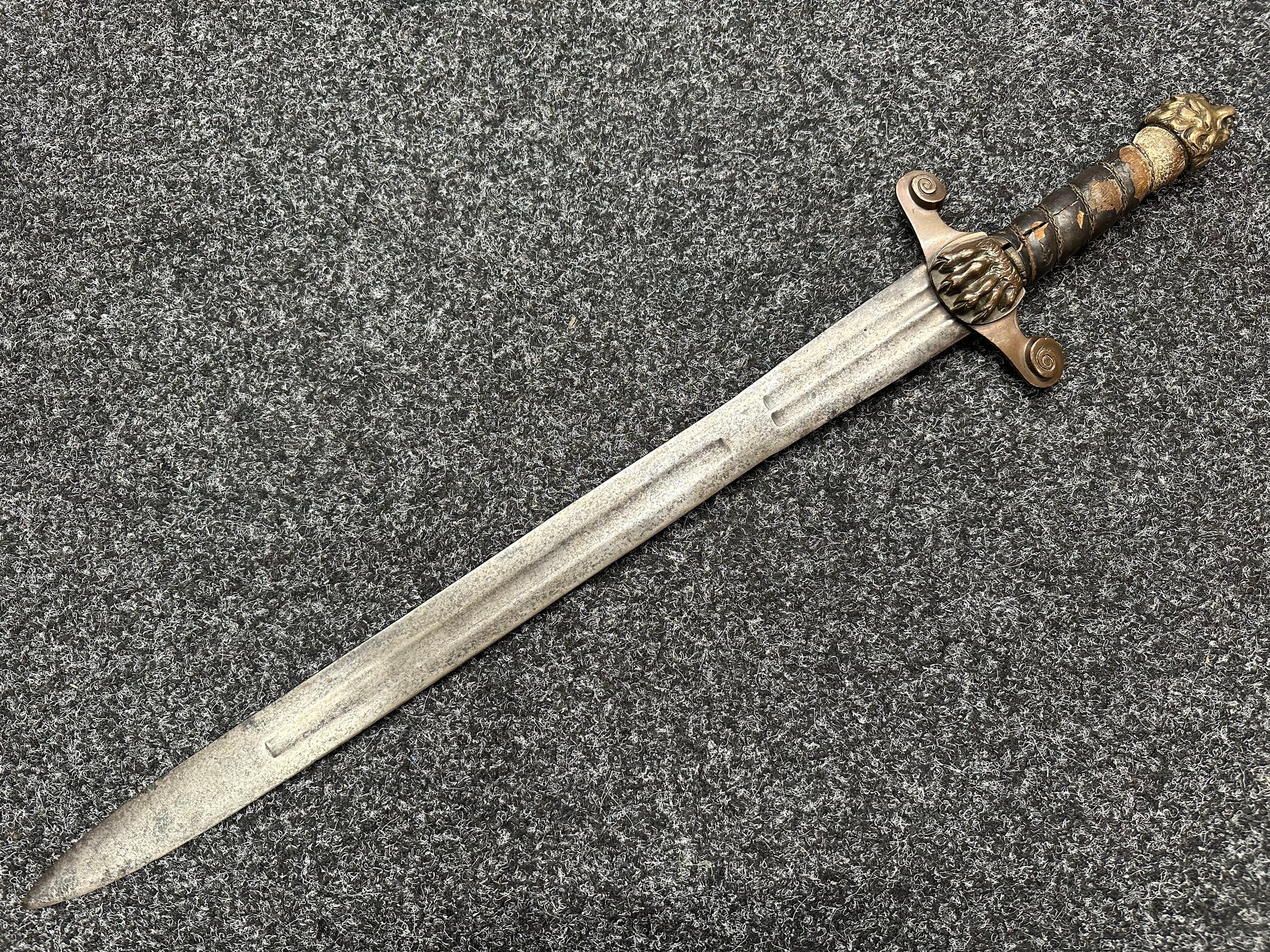 A rare early 19th century continental foot artillery officer’s sword, with gladius style double edge fullered blade, 57cm in length, with brass claw guard and lion’s head pommel, leather covered wooden grip (some damages), overall length 72cm, lacking scabbard