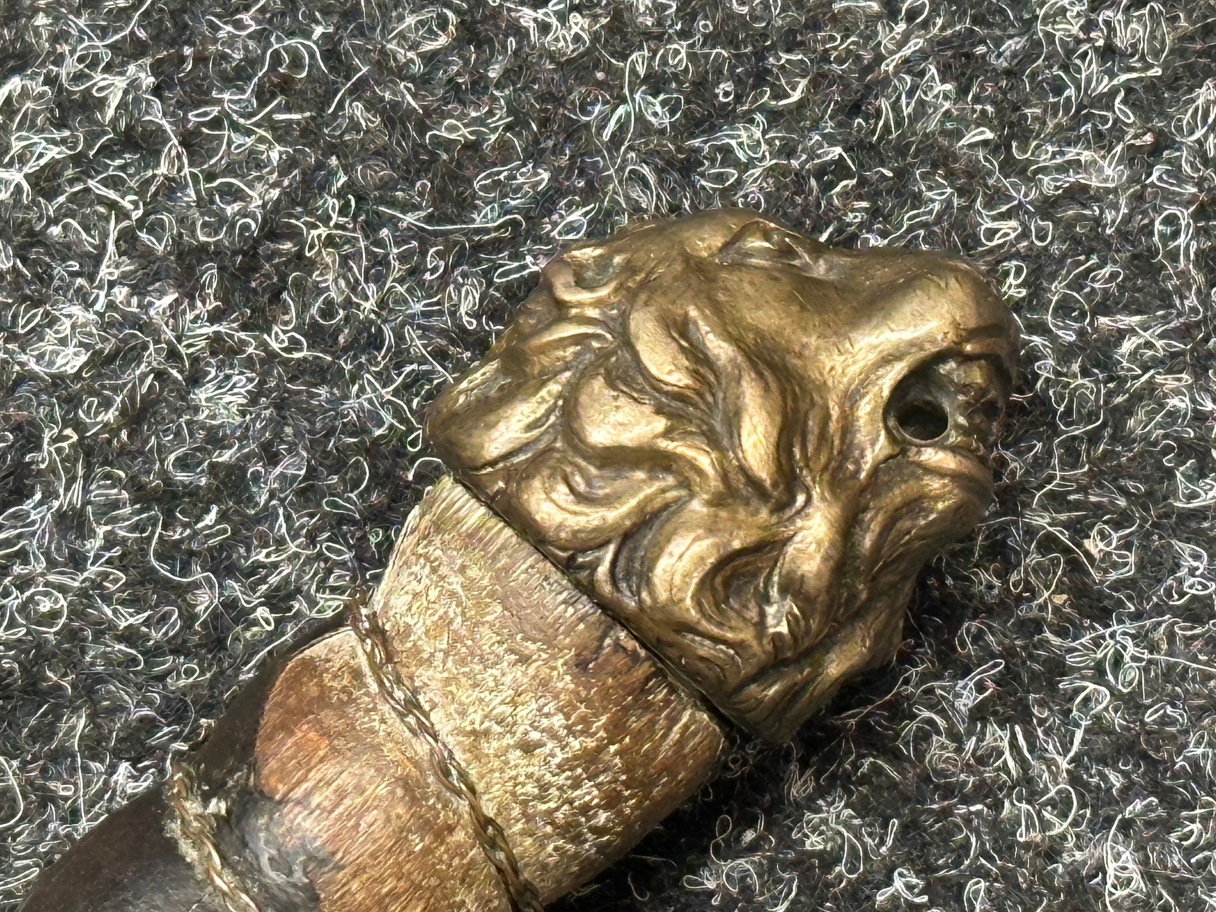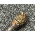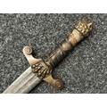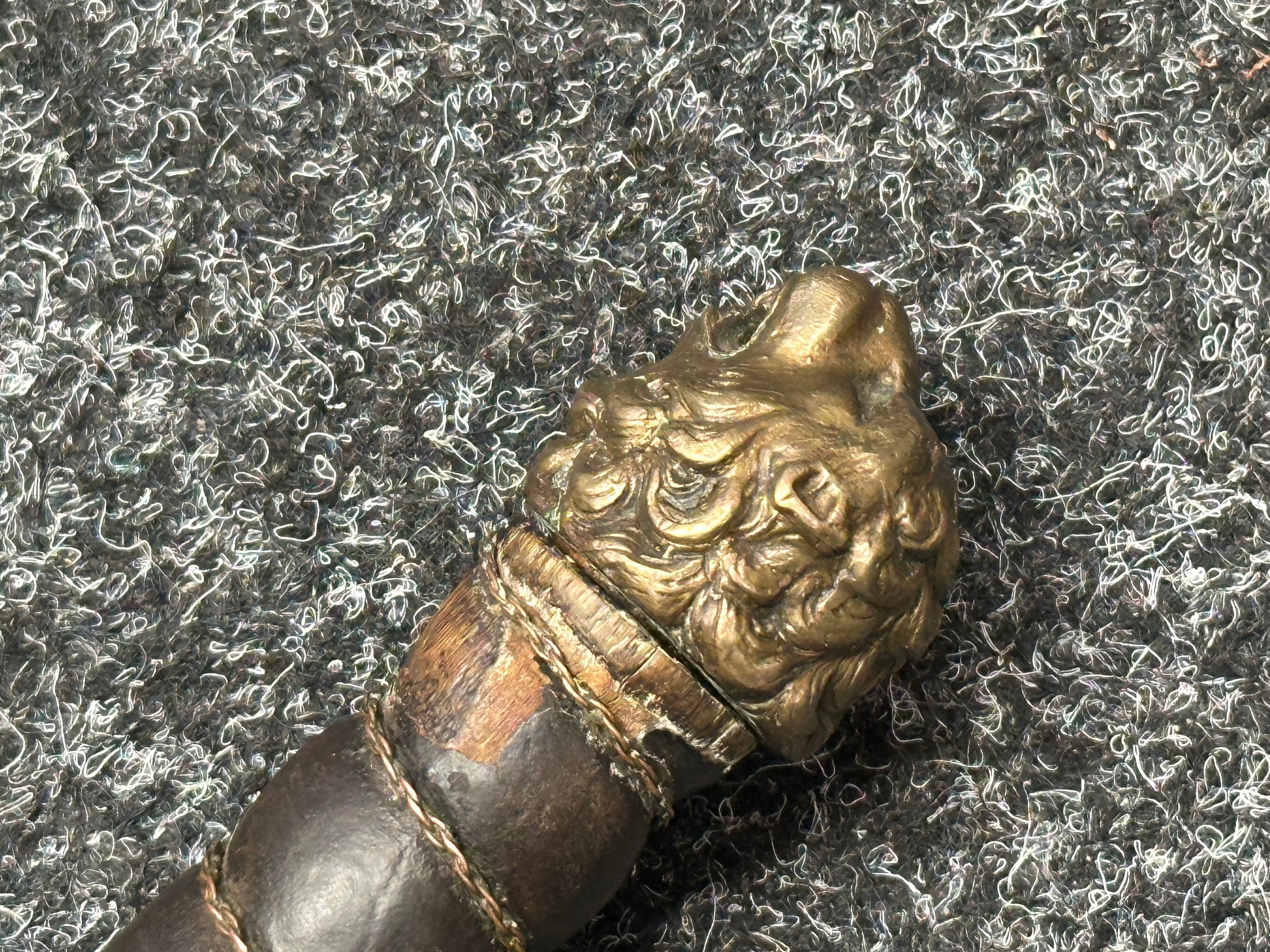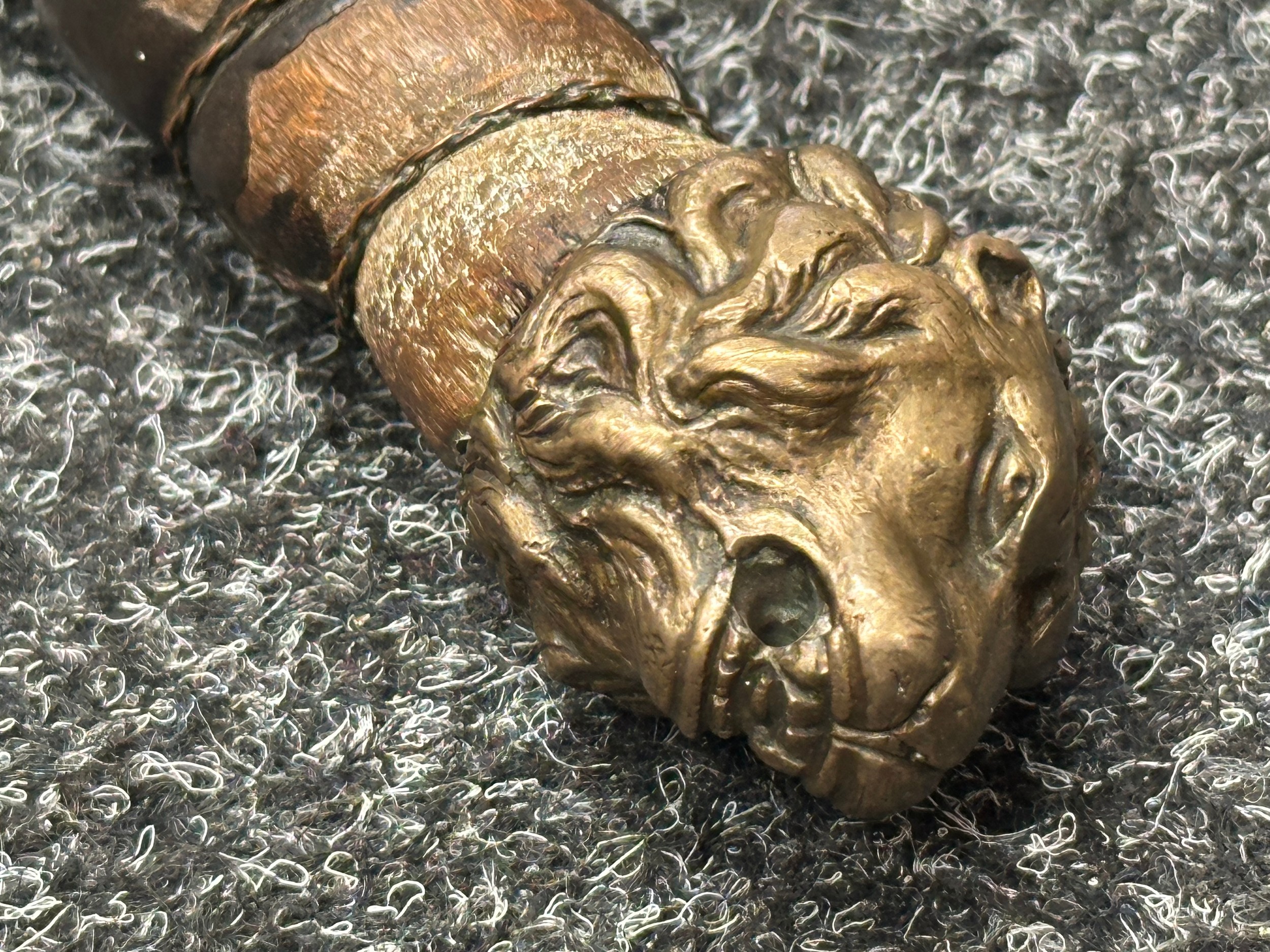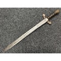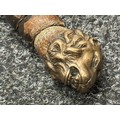 A rare early 19th century continental foot artillery officer’s sword, with gladius style double edge fullered blade, 57cm in length, with brass claw guard and lion’s head pommel, leather covered wooden grip (some damages), overall length 72cm, lacking scabbard