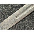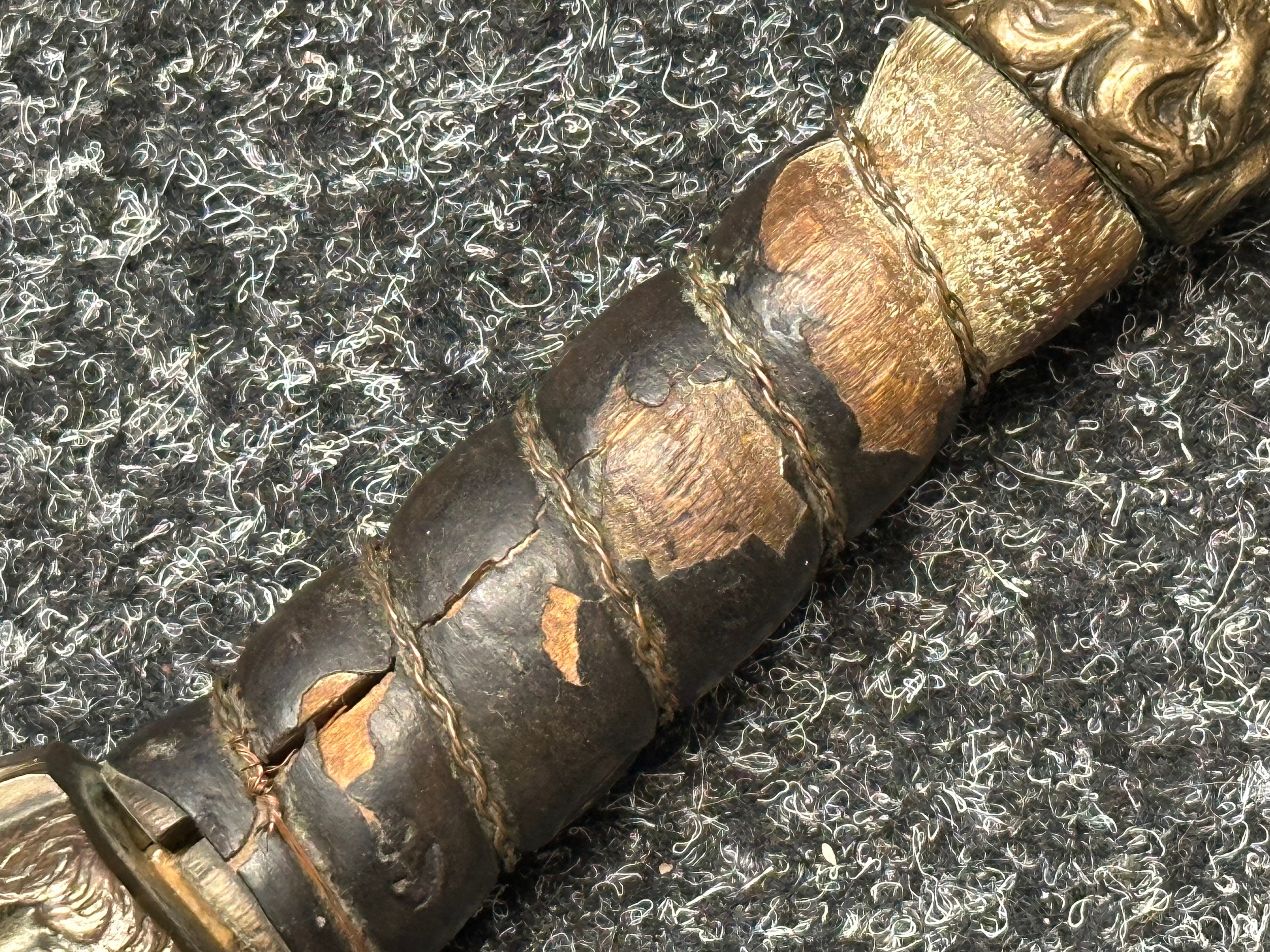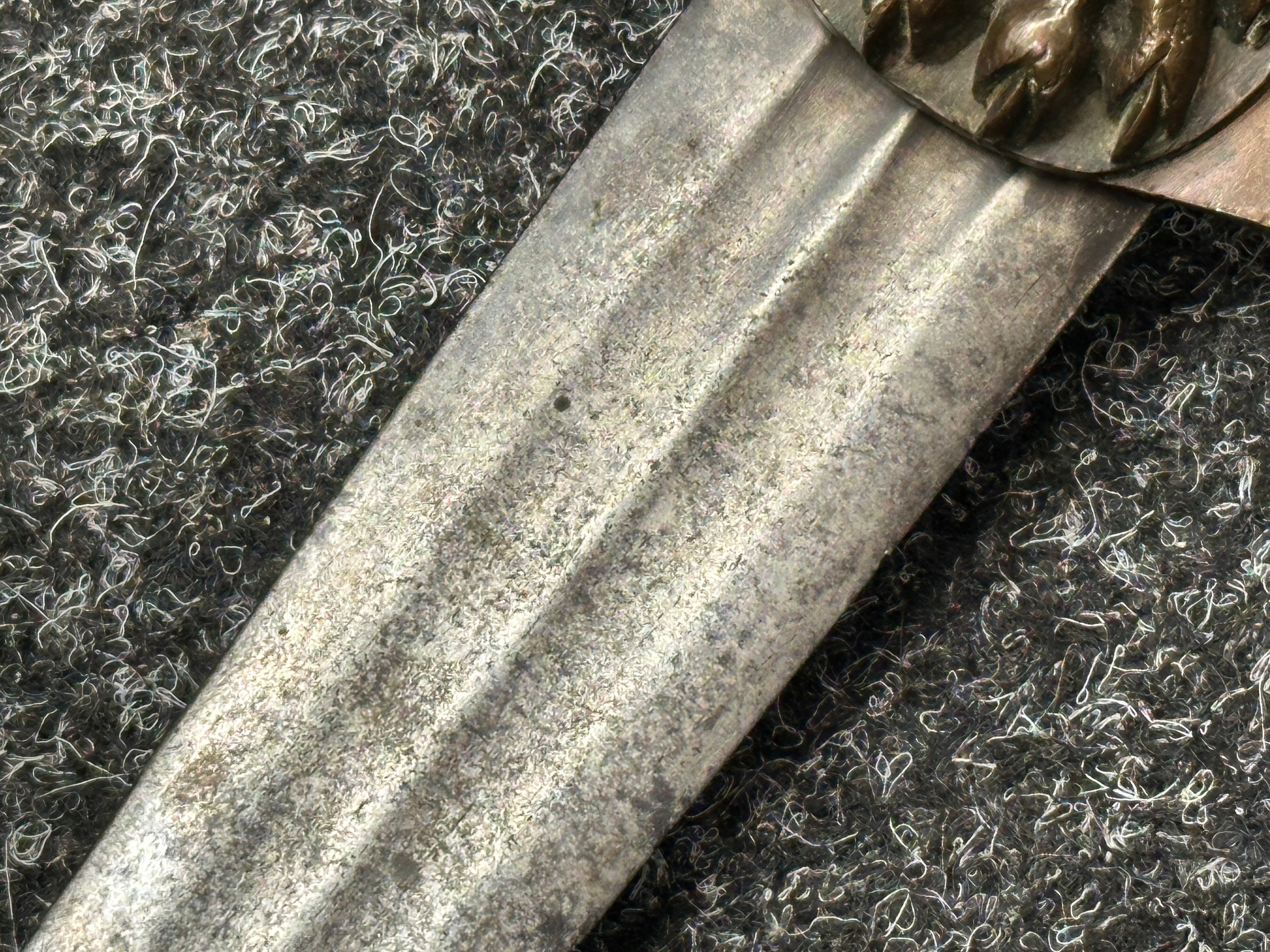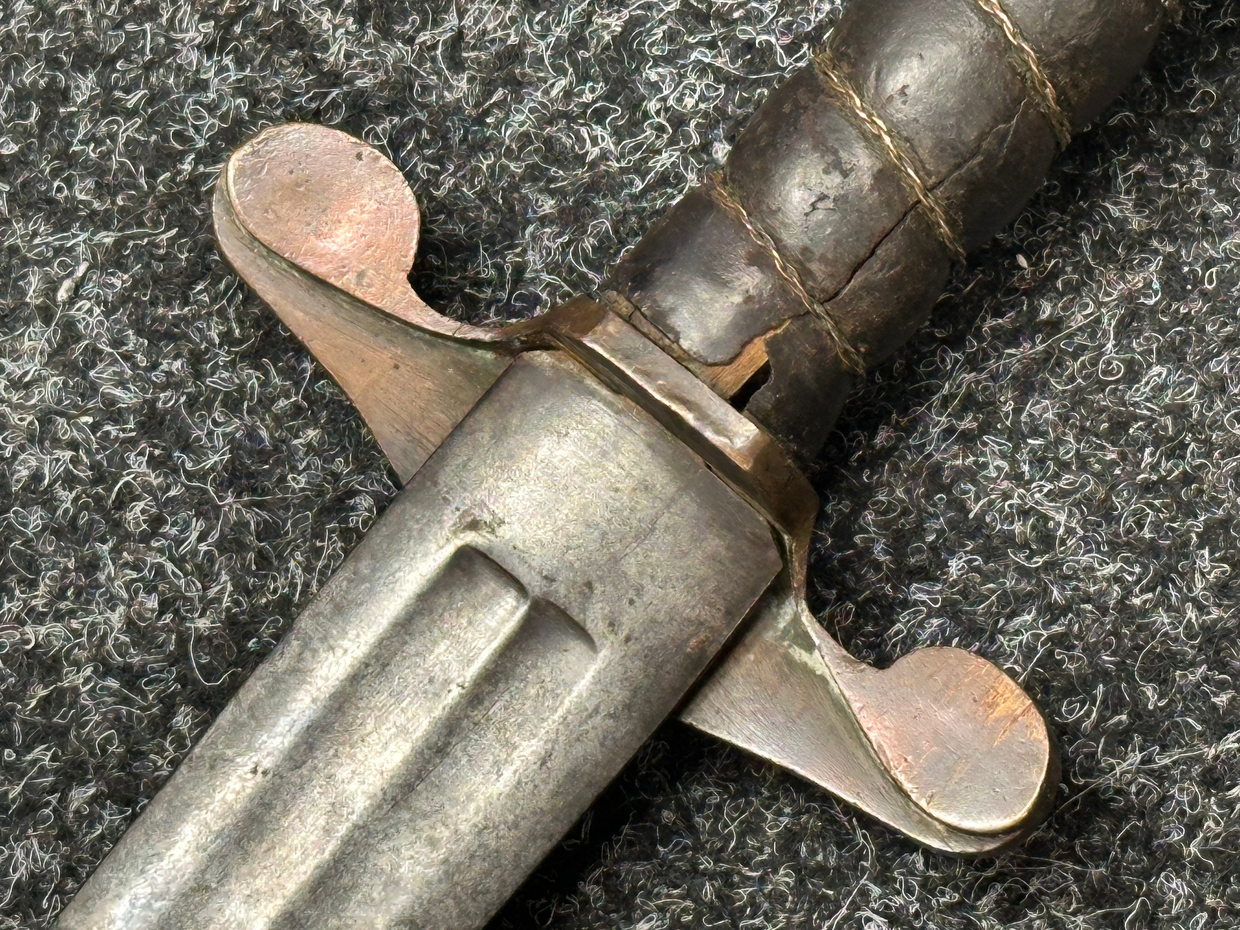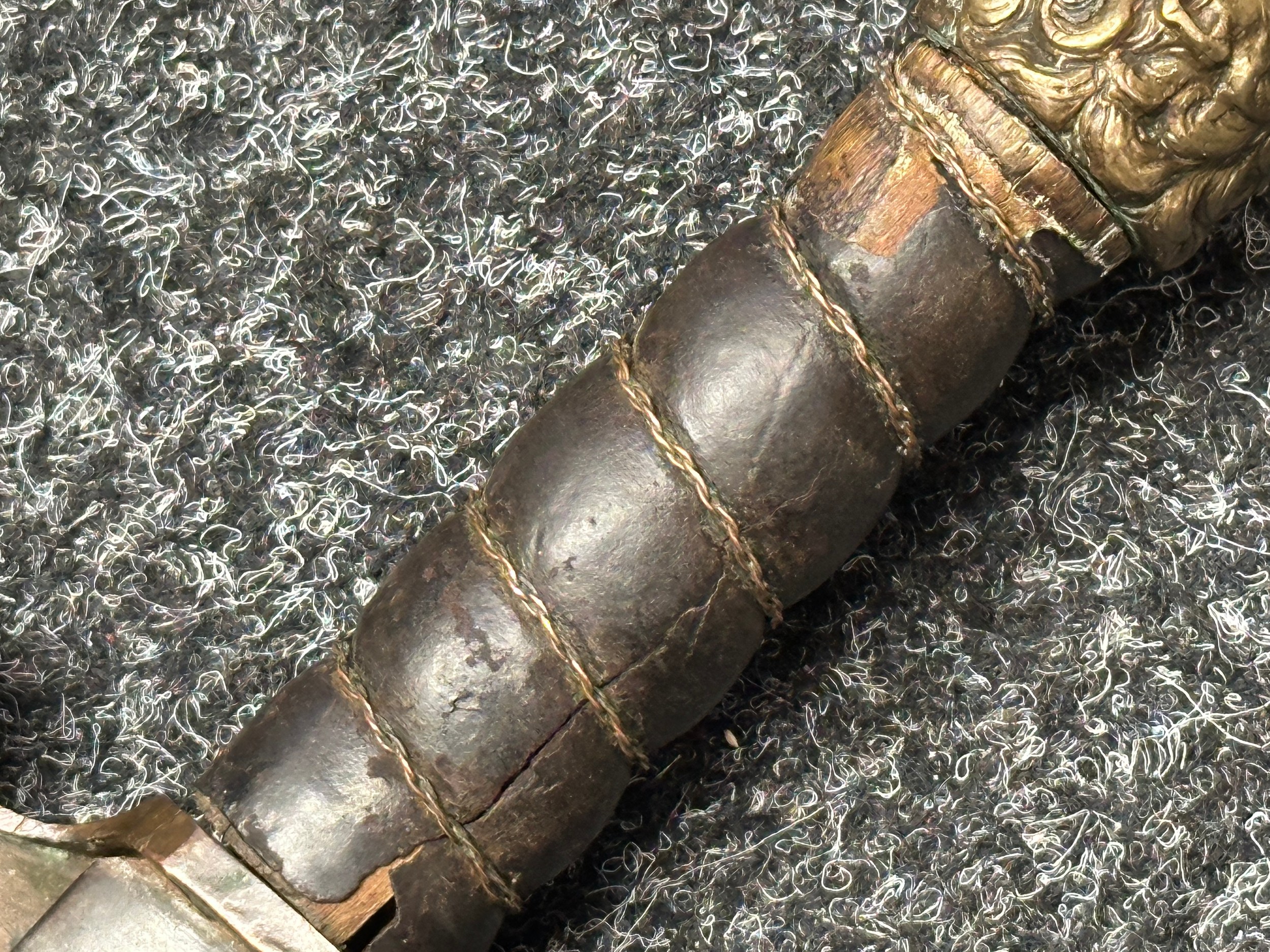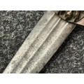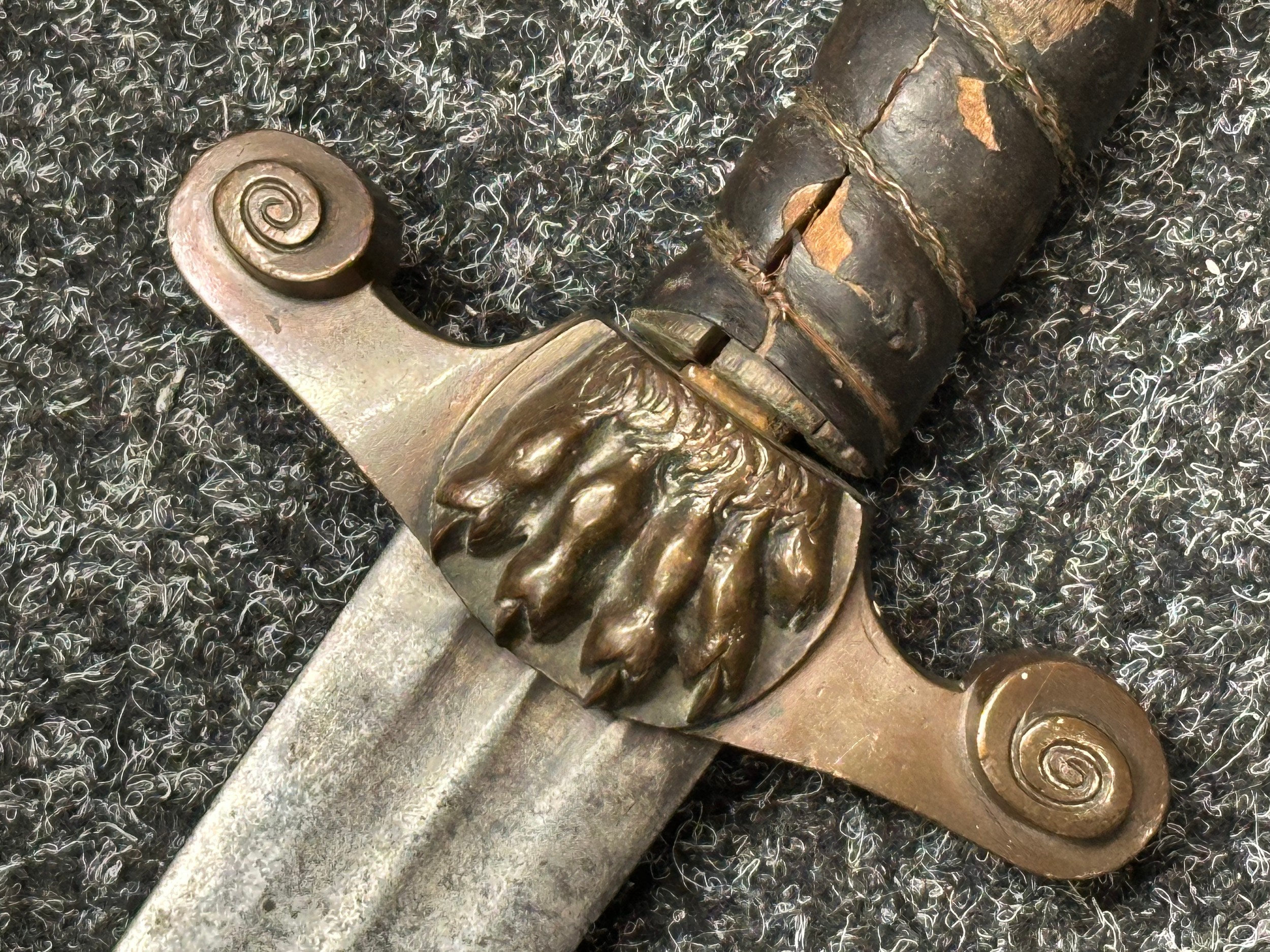 There are some damages to the grip, particularly along the leather, the guard is somewhat loose, some pitting and old rusting to the blade, but commensurate with age
