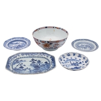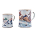 A Chinese mug and a matching smaller mug of waisted cylindrical form, painted with lake landscapes in predominantly verte/imari colours, Qianlong, 14 and 11cm [some damage] 2.