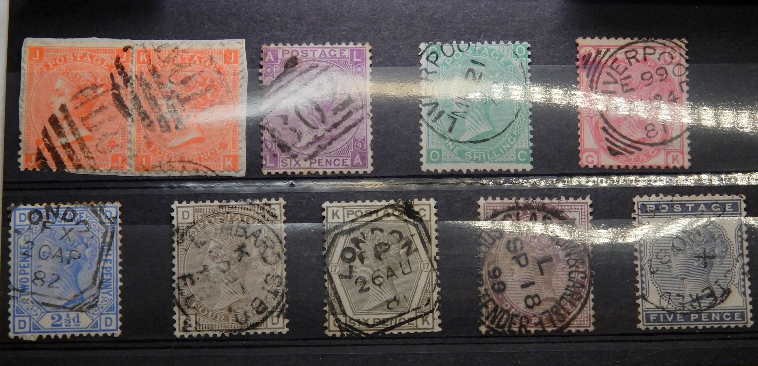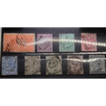 Great Britain Small collection of 9 Surface Printed with interesting or CDS posmarks used. Inc.Pair 4d SG Z17 plate 12 on Piece used Alexandria, 6d SG Z63 Plate 9 used Suez, the rest with fine CDS cancels used UK. Inc 1/- Plate5, 6d plate 17. SG161, 4d Plate 17 SG 160 etc. a fine lot