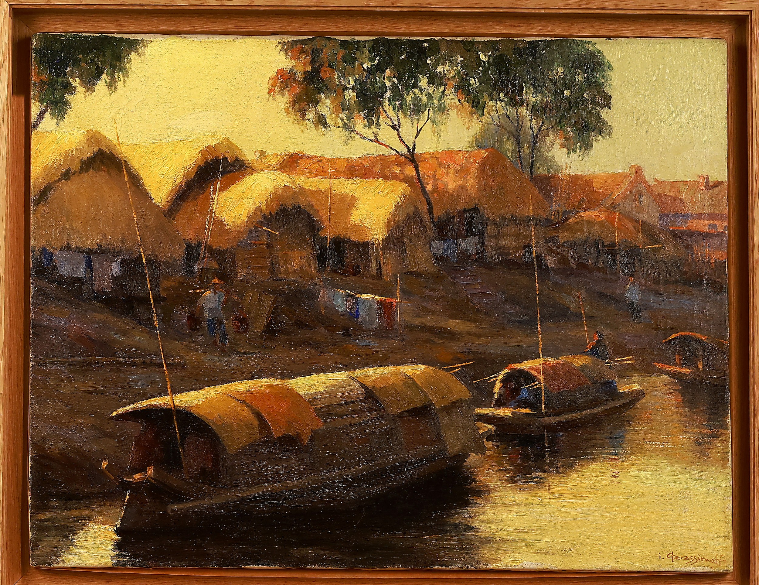 "Riverside Landscape" by Gerassimoff, 50 X 65 cm, oil on canvas. Perfect condition. This item is held at Cadmore ASIAN Office in Vietnam and will be shipped from there. Buyers will be responsible for direct shipping payments. Delivery will take slightly longer.