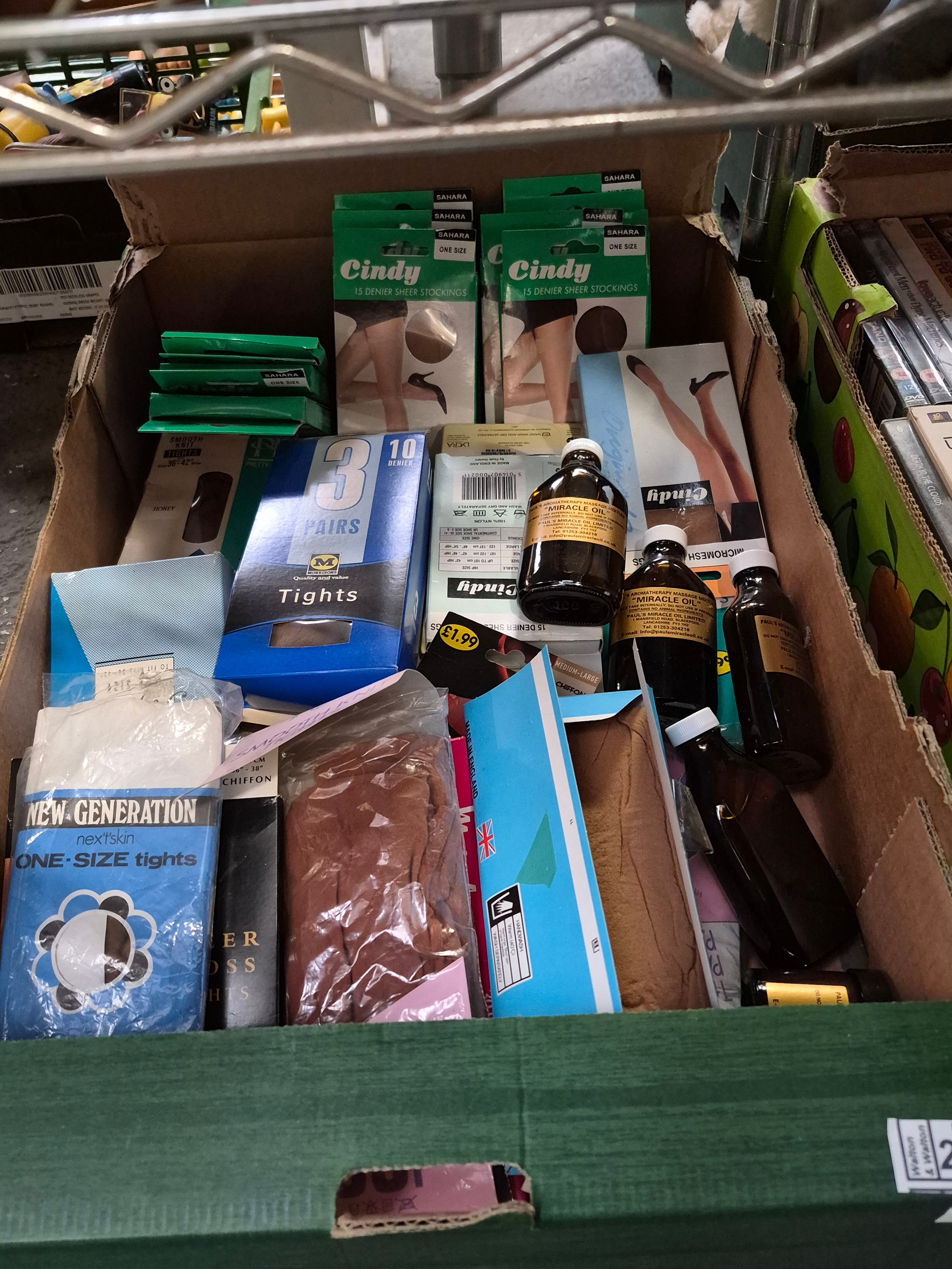 Box containing assorted tights and aromatheraphy oils