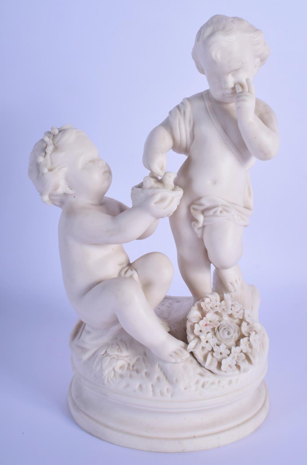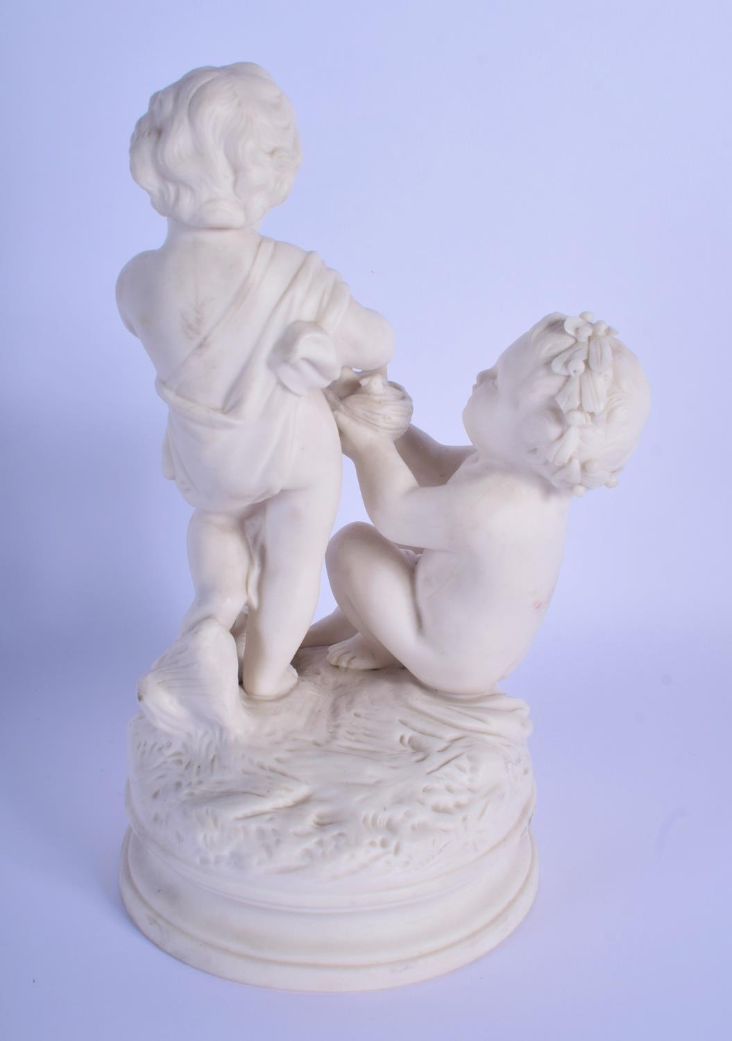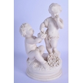 A 19TH CENTURY EUROPEAN PARIAN WARE FIGURE OF TWO PUTTI modelled feeding a chick. 18 cm cm high.
