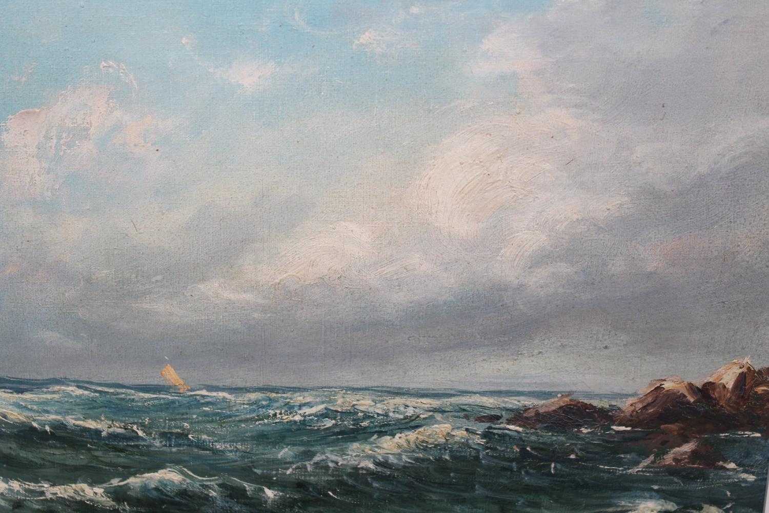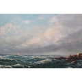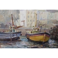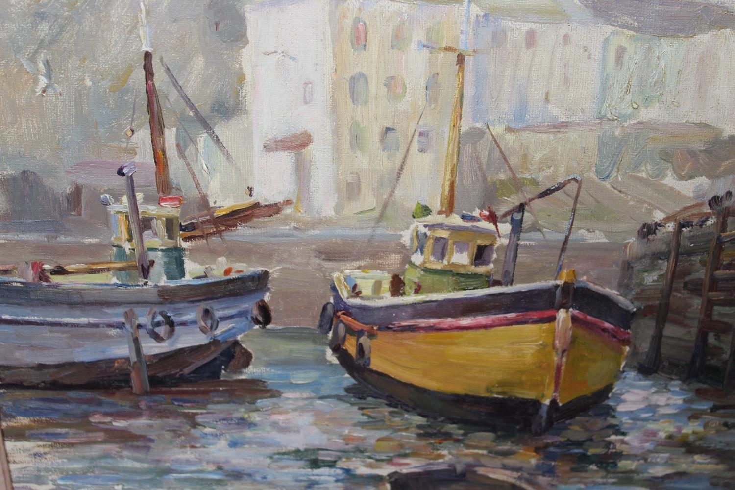 Two framed oils, Cornish fishing village with boats, 11.5ins x 14ins, and study of a seascape with distant boats, indistinctly signed, 10ins x 12ins