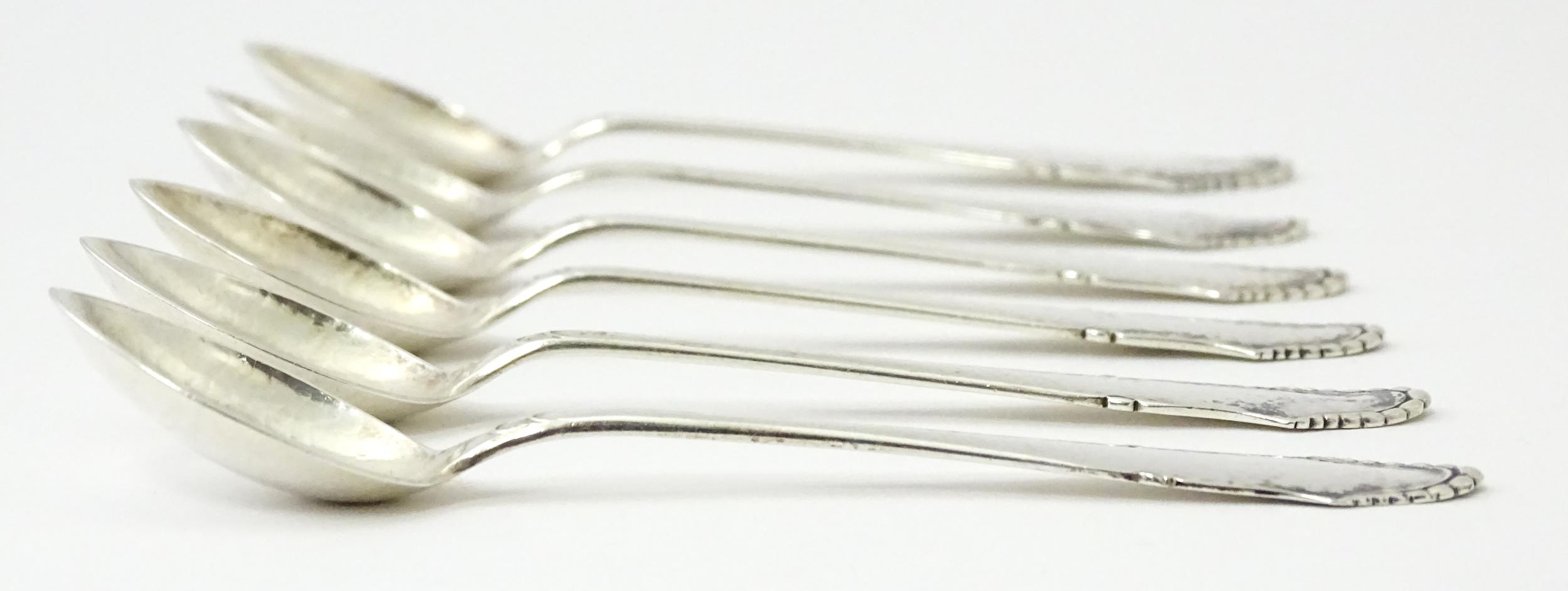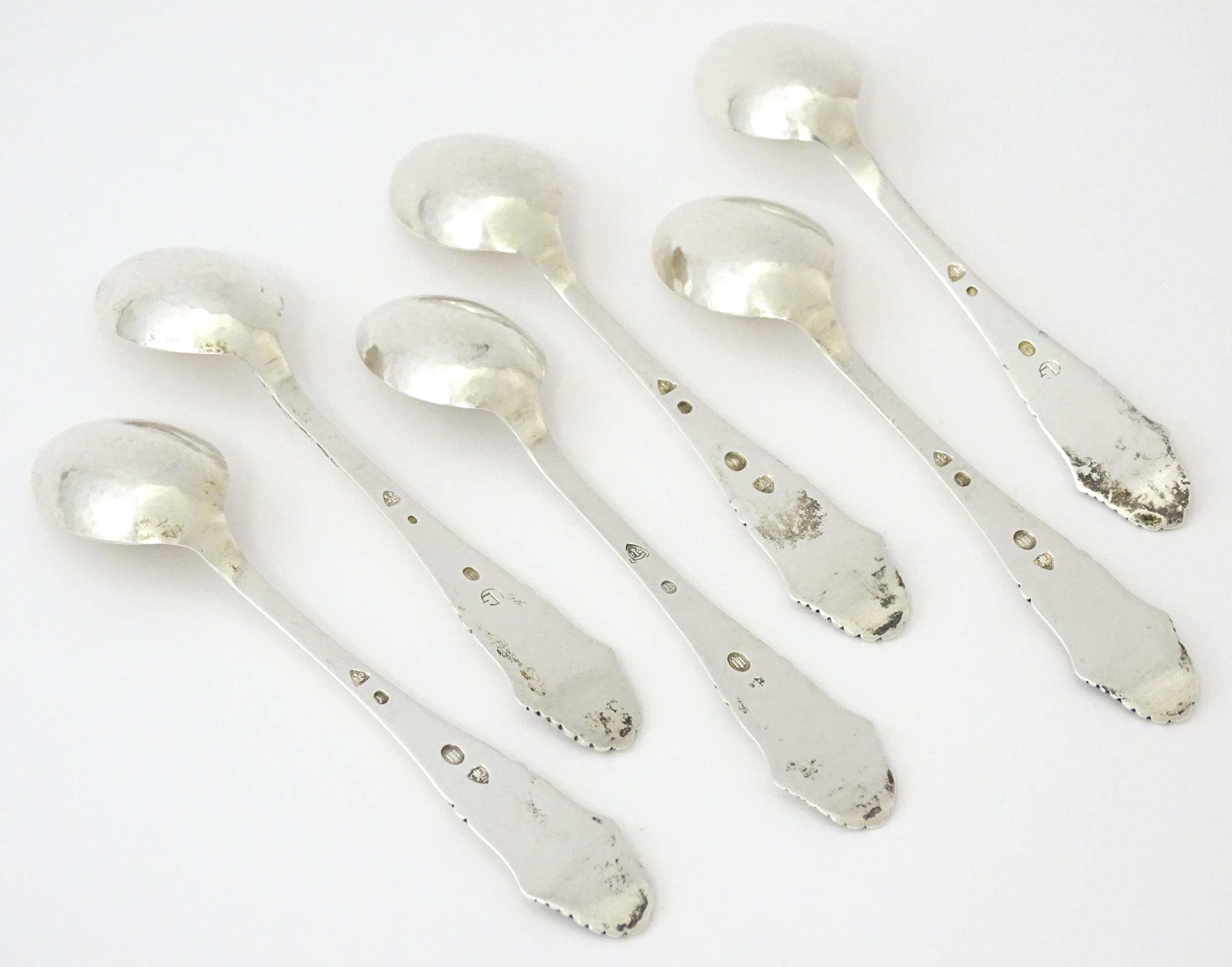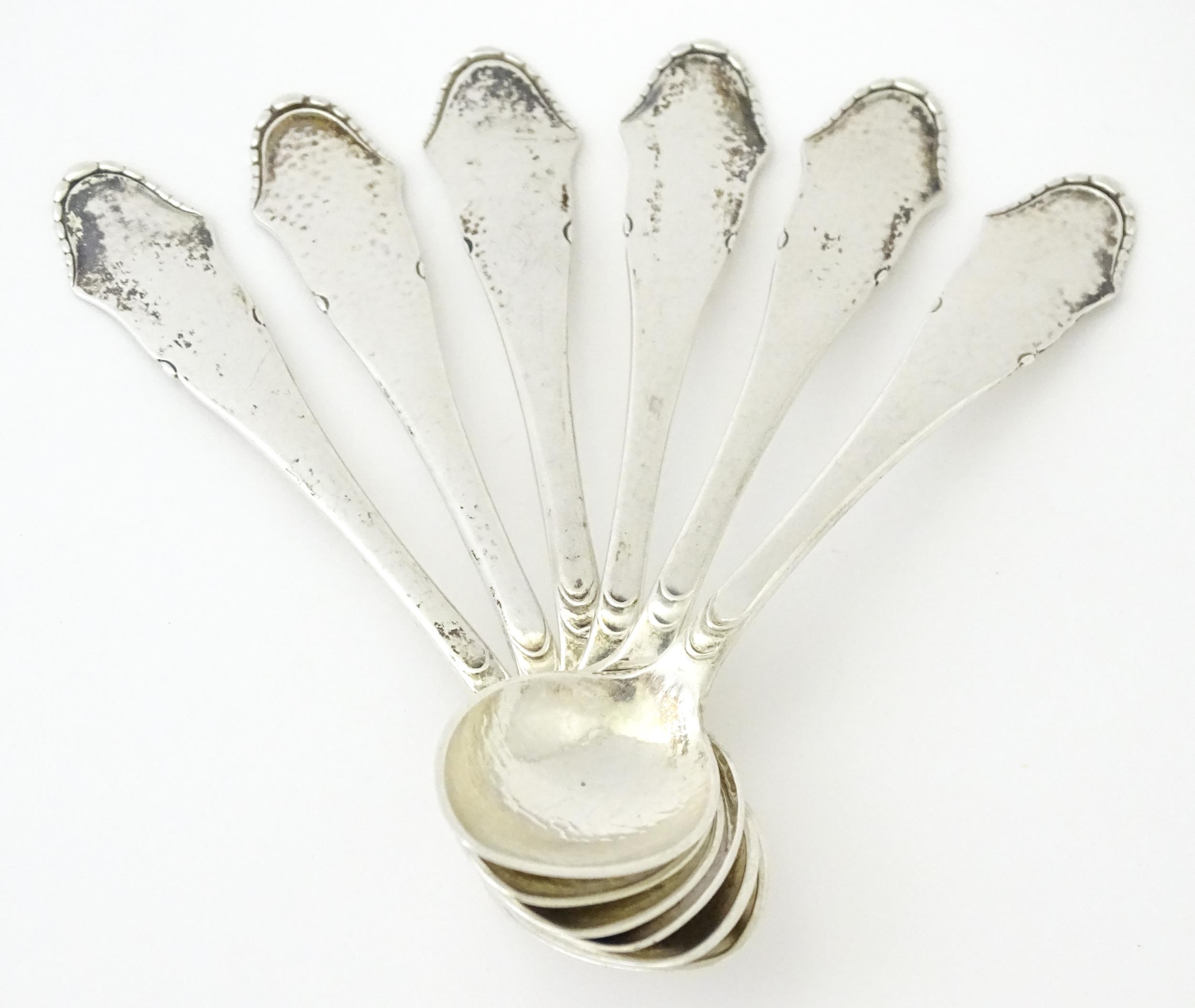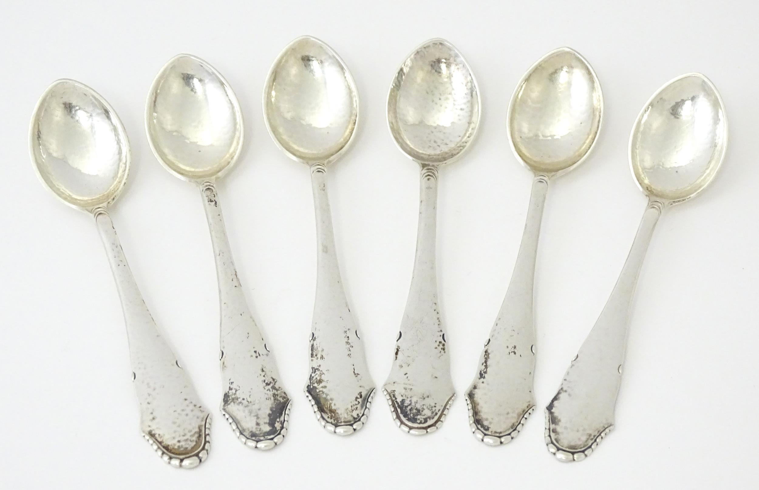 Scandinavian silver: A matched set of six Danish silver teaspoons with hammered decoration, bearing marks for Grann & Laglye. Approx. 4 1/2" long (6)