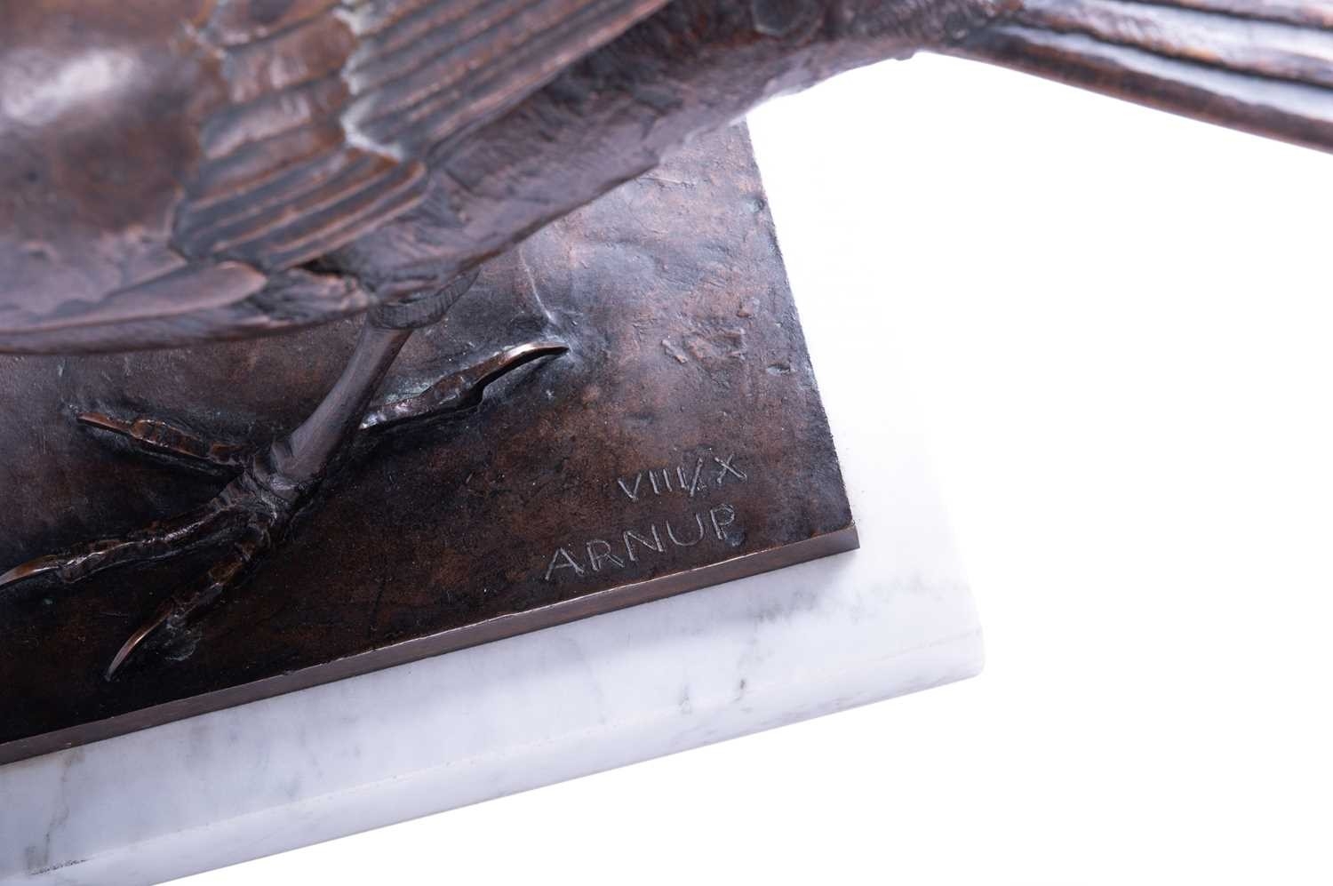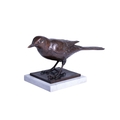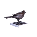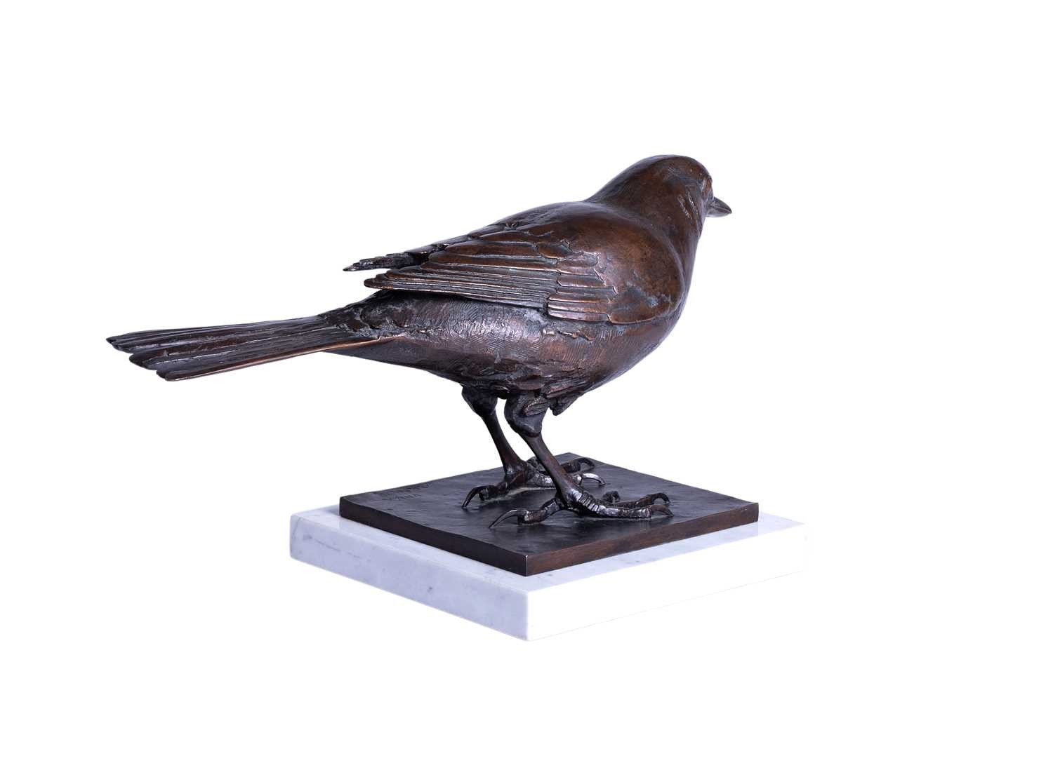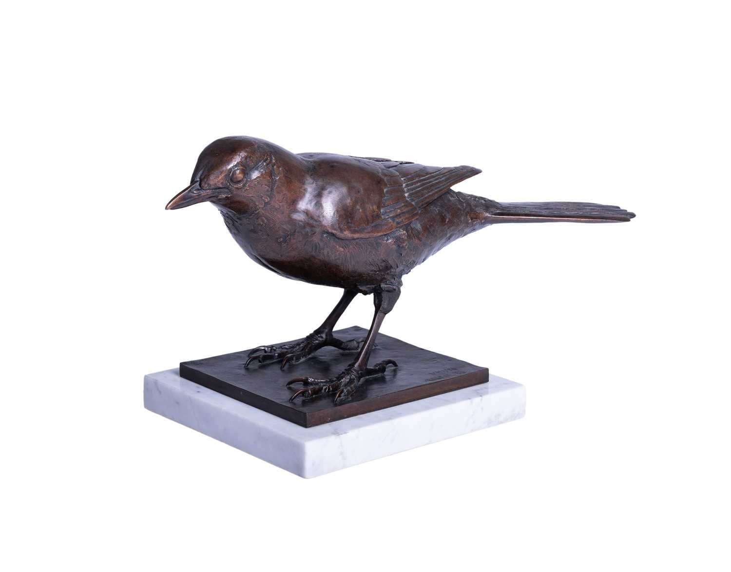 Sally Arnup FRBS, ARCA (1930-2015), 'Blackbird', a patinated bronze limited edition figure on a square white marble base, signed and numbered 8 from an edition of 10, 21 cm high x 36 cm wide.