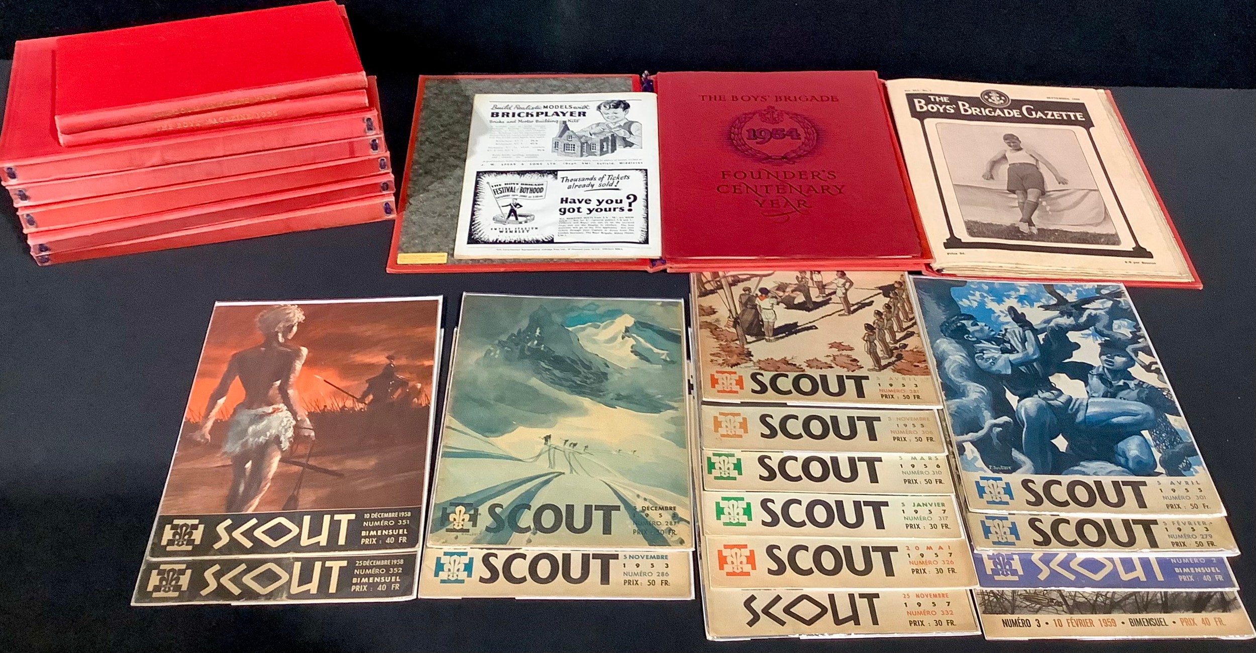 Books – Boys’ Brigade interest: Centenary year booklet, 4to, red card covers in 4to folder in embossed red boards with gilt titles, also Standfast Magazine No. 9 for June 1954 tucked in; Boys’ Brigade Gazette inclusive 1931-1936 bound in red boards en suite with the preceding, gilt titles The Boys’ brigade Gazette, gilt logo, embossed margins; The Boys’ Magazine Vol. 50 for 1936 and Vol. 52 for 1938, 8vo, bound red cloth, bkplts. Nicholas Wilde; also The Scout magazine, 14 issues covering 1953-1955, French language, colour printed paper covers: all from the library of Nicholas Wilde (qty)