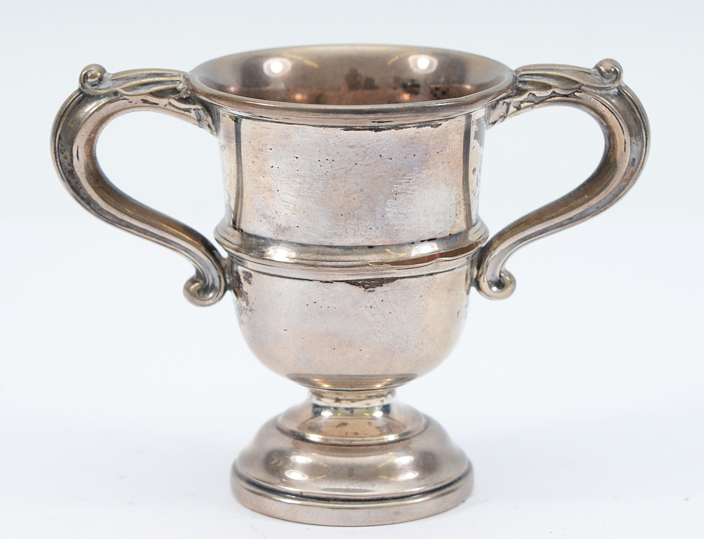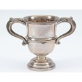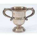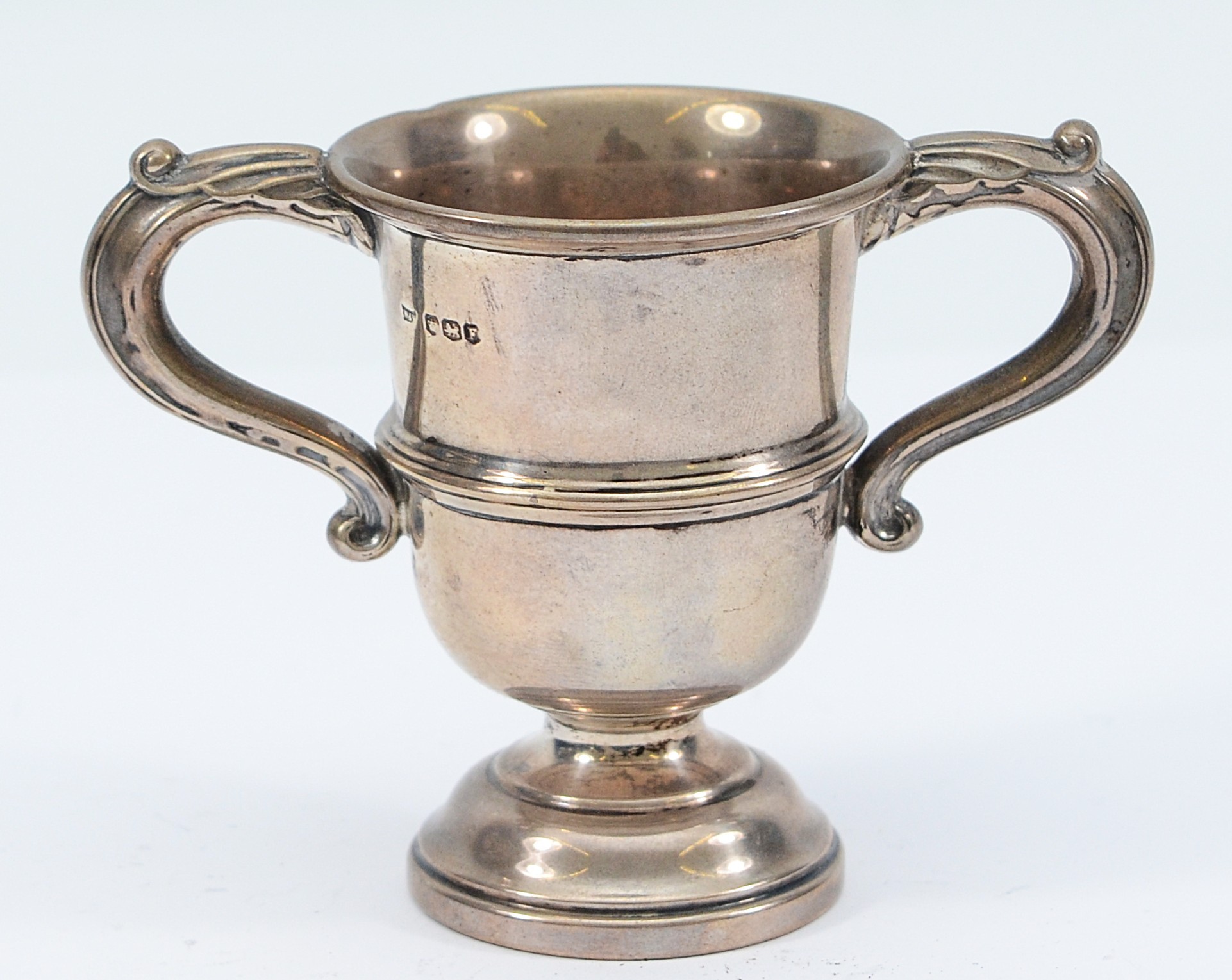A silver twin handled cup, Sheffield 1948, by Walker & Hall, 77gm, 8cm.
