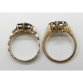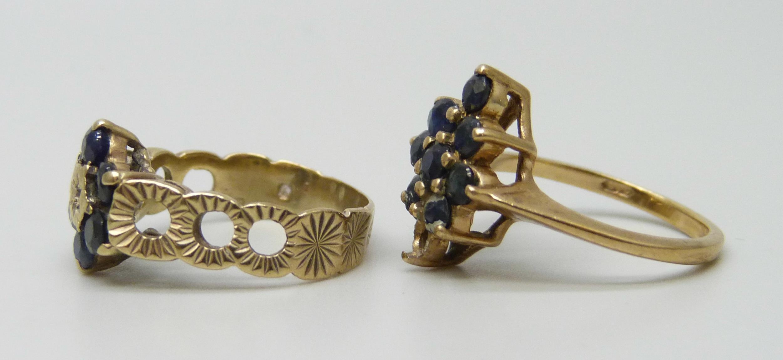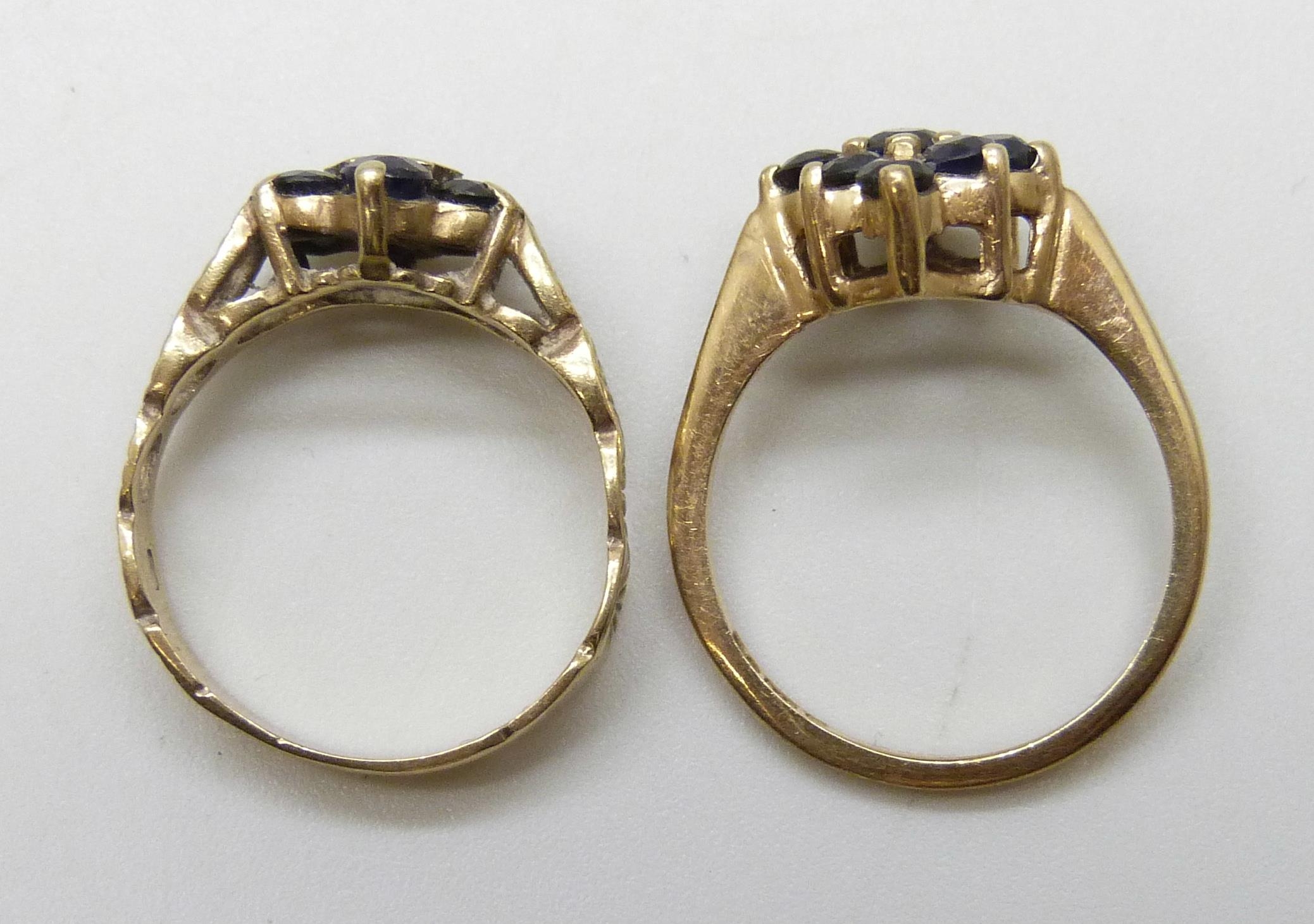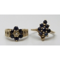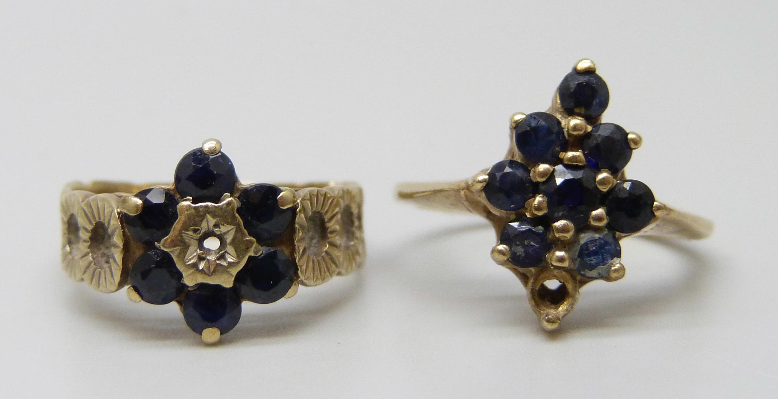 A yellow metal cluster ring, and a 9ct gold sapphire ring, both a/f, 5.1g total