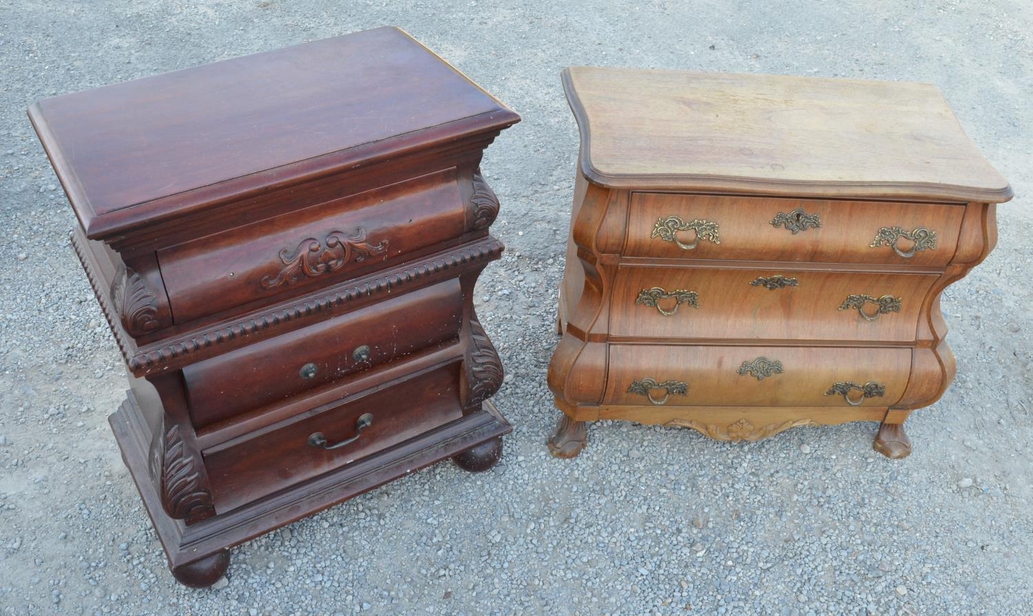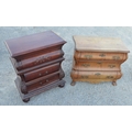 C20th Dutch mahogany Bombe chest of three drawers with serpentine shaped oak top, W76cm D44cm H66cm Dutch mahogany Bombe chest of three drawers on domed feet. W66cm D40cm H78cm (2)